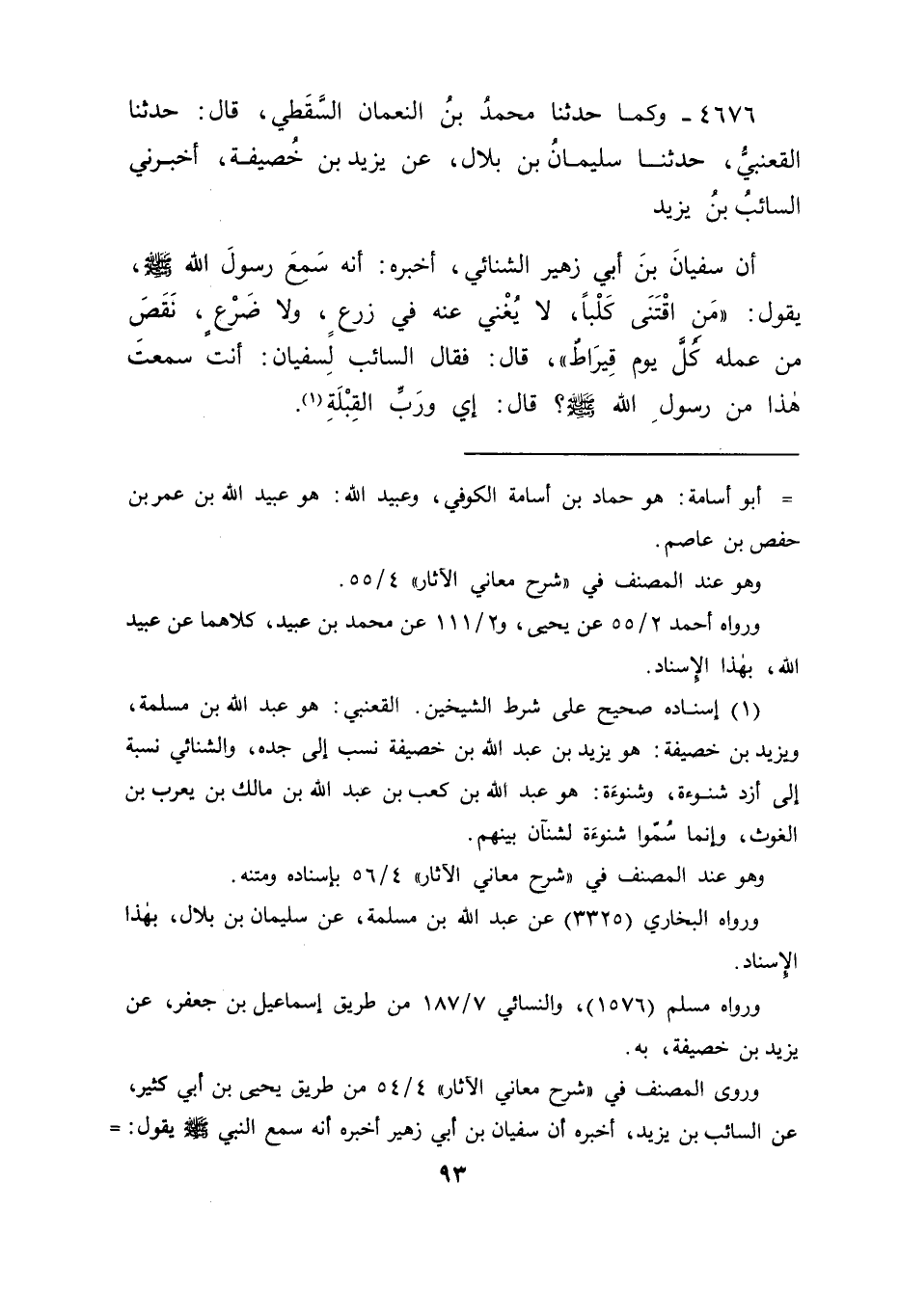 4676 - وَكَمَا حَدَّثَنَا مُحَمَّدُ بْنُ النُّعْمَانِ السَّقَطِيُّ قَالَ: حَدَّثَنَا الْقَعْنَبِيُّ , حَدَّثَنَا سُلَيْمَانُ بْنُ بِلَالٍ , عَنْ يَزِيدَ بْنِ خُصَيْفَةَ , أَخْبَرَنِي السَّائِبُ بْنُ يَزِيدَ أَنَّ سُفْيَانَ بْنَ أَبِي زُهَيْرٍ الشَّنَائِيَّ، أَخْبَرَهُ: أَنَّهُ سَمِعَ رَسُولَ اللهِ صَلَّى اللَّهُ عَلَيْهِ وَسَلَّمَ يَقُولُ: " مَنِ اقْتَنَى كَلْبًا، لَا يُغْنِي عَنْهُ فِي زَرْعٍ، وَلَا ضَرْعٍ، نَقَصَ مِنْ عَمَلِهِ كُلَّ يَوْمٍ قِيرَاطٌ " قَالَ: فَقَالَ السَّائِبُ لِسُفْيَانَ: أَنْتَ سَمِعْتَ هَذَا مِنْ رَسُولِ اللهِ صَلَّى اللَّهُ عَلَيْهِ وَسَلَّمَ؟ قَالَ: إِي وَرَبِّ الْقِبْلَةِ -[94]-