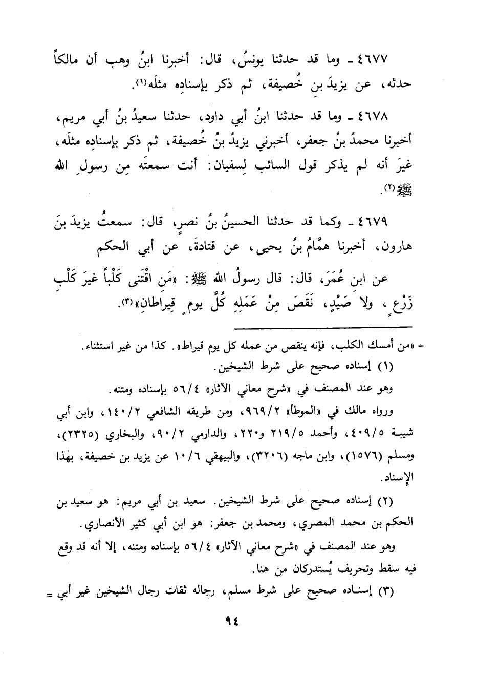 4679 - وَكَمَا قَدْ حَدَّثَنَا الْحُسَيْنُ بْنُ نَصْرٍ قَالَ: سَمِعْتُ يَزِيدَ بْنَ هَارُونَ , أَخْبَرَنَا هَمَّامُ بْنُ يَحْيَى , عَنْ قَتَادَةَ , عَنْ أَبِي الْحَكَمِ، عَنِ ابْنِ عُمَرَ قَالَ: قَالَ رَسُولُ اللهِ صَلَّى اللَّهُ عَلَيْهِ وَسَلَّمَ: " مَنِ اقْتَنَى كَلْبًا غَيْرَ كَلْبِ زَرْعٍ، وَلَا صَيْدٍ، نَقَصَ مِنْ عَمَلِهِ كُلَّ يَوْمٍ قِيرَاطَانِ " -[95]-