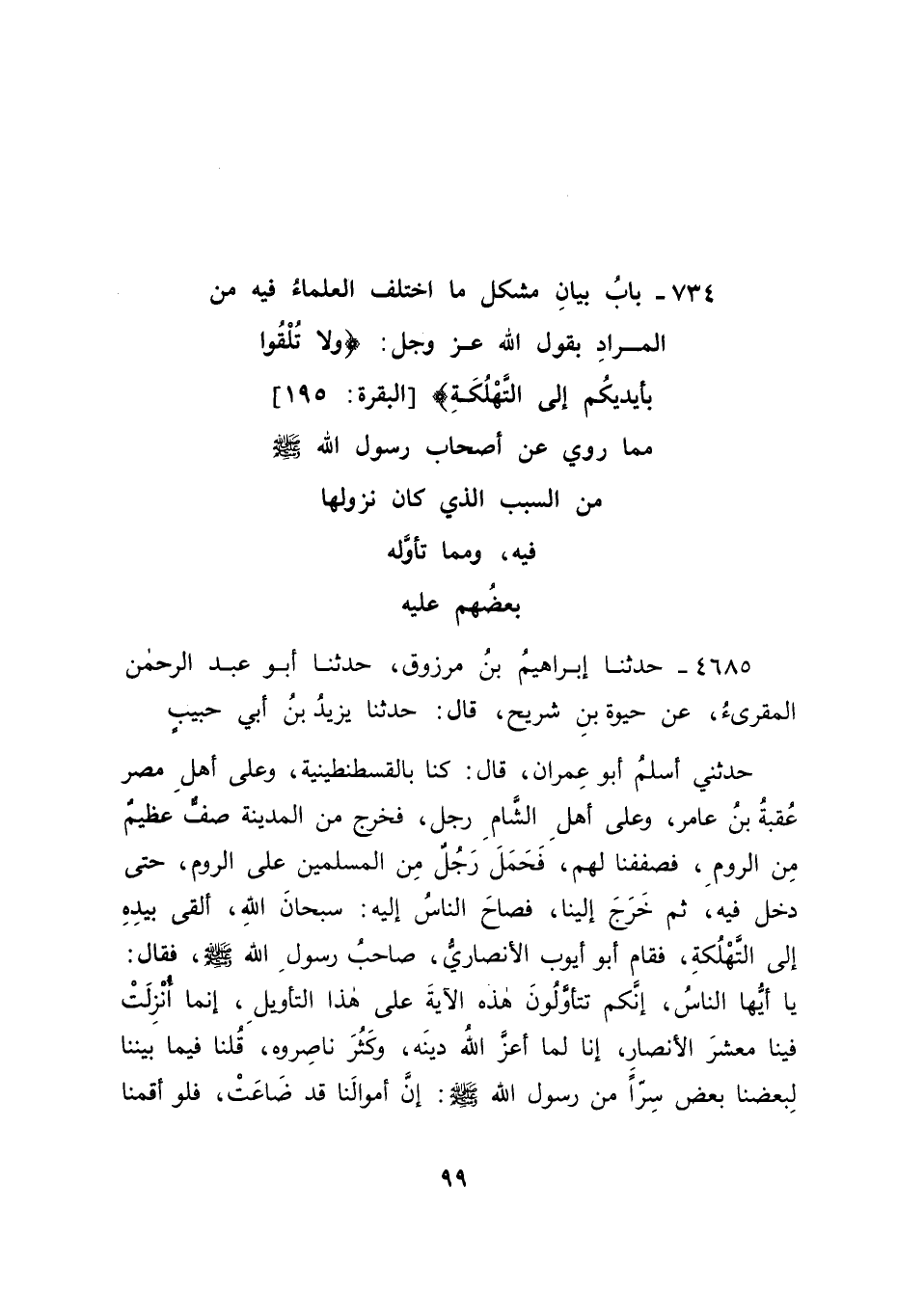 4685 - حَدَّثَنَا إِبْرَاهِيمُ بْنُ مَرْزُوقٍ , حَدَّثَنَا أَبُو عَبْدِ الرَّحْمَنِ الْمُقْرِئُ , عَنْ حَيْوَةَ بْنِ شُرَيْحٍ قَالَ: حَدَّثَنَا يَزِيدُ بْنُ أَبِي حَبِيبٍ حَدَّثَنِي أَسْلَمُ أَبُو عِمْرَانَ قَالَ: كُنَّا بِالْقُسْطَنْطِينِيَّةِ، وَعَلَى أَهْلِ مِصْرَ عُقْبَةُ بْنُ عَامِرٍ، وَعَلَى أَهْلِ الشَّامِ رَجُلٌ، فَخَرَجَ مِنَ الْمَدِينَةِ صَفٌّ عَظِيمٌ مِنَ الرُّومِ، فَصَفَفْنَا لَهُمْ، فَحَمَلَ رَجُلٌ مِنَ الْمُسْلِمِينَ عَلَى الرُّومِ حَتَّى دَخَلَ فِيهِ، ثُمَّ خَرَجَ إِلَيْنَا، فَصَاحَ النَّاسُ إِلَيْهِ: سُبْحَانَ اللهِ، أَلْقَى بِيَدِهِ إِلَى التَّهْلُكَةِ، فَقَامَ أَبُو أَيُّوبَ الْأَنْصَارِيُّ صَاحِبُ رَسُولِ اللهِ صَلَّى اللَّهُ عَلَيْهِ وَسَلَّمَ , فَقَالَ: " يَا أَيُّهَا النَّاسُ، إِنَّكُمْ تَتَأَوَّلُونَ هَذِهِ الْآيَةَ عَلَى هَذَا التَّأْوِيلِ، إِنَّمَا أُنْزِلَتْ فِينَا مَعْشَرَ الْأَنْصَارِ، إِنَّا لَمَّا أَعَزَّ اللهُ دِينَهُ، وَكَثُرَ نَاصِرُوهُ، قُلْنَا فِيمَا بَيْنَنَا لِبَعْضِنَا بَعْضٍ سِرًّا مِنْ رَسُولِ اللهِ صَلَّى اللَّهُ عَلَيْهِ وَسَلَّمَ: إِنَّ أَمْوَالَنَا قَدْ ضَاعَتْ، فَلَوْ أَقَمْنَا -[100]- فِيهَا، وَأَصْلَحْنَا مِنْهَا مَا قَدْ ضَاعَ، فَأَنْزَلَ اللهُ تَعَالَى فِي كِتَابِهِ يَرُدُّ عَلَيْنَا مَا قَدْ هَمَمْنَا بِهِ، فَقَالَ: {وَأَنْفِقُوا فِي سَبِيلِ اللهِ وَلَا تُلْقُوا بِأَيْدِيكُمْ إِلَى التَّهْلُكَةِ} [البقرة: 195] فَكَانَتِ التَّهْلُكَةُ فِي الْإِقَامَةِ الَّتِي أَرَدْنَا أَنْ نُقِيمَ فِي أَمْوَالِنَا وَنُصْلِحَهَا، فَأَمَرَنَا بِالْغَزْوِ، فَمَا زَالَ أَبُو أَيُّوبَ غَازِيًا فِي سَبِيلِ اللهِ حَتَّى قَبَضَهُ اللهُ تَعَالَى فَفِي هَذَا الْحَدِيثِ أَنَّ التَّهْلُكَةَ الْمَذْكُورَةَ فِي هَذِهِ الْآيَةِ هِيَ التَّهْلُكَةُ فِي الدِّينِ، وَالتَّهْلُكَةُ وَالْهُلْكُ وَاحِدٌ فِي كَلَامِ الْعَرَبِ، كَذَلِكَ حَدَّثَنَا وَلَّادٌ النَّحْوِيُّ، عَنِ الْمَصَادِرِيِّ، عَنْ أَبِي عُبَيْدَةَ، وَكَانَ مَعْنَى ذَلِكَ: أَنَّ مَنْ بَلَغَتْ حَالُهُ مِنْ تَرْكِ الْغَزْوِ وَالِامْتِنَاعِ مِنَ النَّفَقَةِ فِي سَبِيلِ اللهِ، كَمَا قَدْ كَانَتِ الْأَنْصَارُ عَلَيْهِ، ثُمَّ هَمَّتْ بِخِلَافِهِ، هَلَاكٌ -[101]- وَمِثْلُهُ مَا قَدْ رُوِيَ عَنْ رَسُولِ اللهِ صَلَّى اللَّهُ عَلَيْهِ وَسَلَّمَ