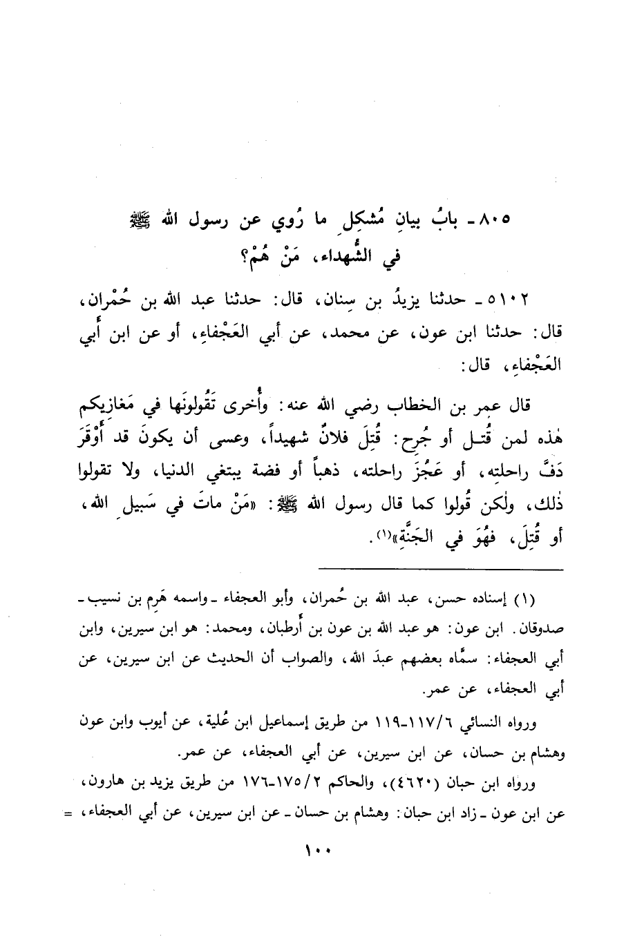 5102 - حَدَّثَنَا يَزِيدُ بْنُ سِنَانٍ قَالَ: حَدَّثَنَا عَبْدُ اللهِ بْنُ حُمْرَانَ قَالَ: حَدَّثَنَا ابْنُ عَوْنٍ، عَنْ مُحَمَّدٍ، عَنْ أَبِي الْعَجْفَاءِ، أَوْ عَنِ ابْنِ أَبِي الْعَجْفَاءِ قَالَ: قَالَ عُمَرُ بْنُ الْخَطَّابِ رَضِيَ اللهُ عَنْهُ: وَأُخْرَى تَقُولُونَهَا فِي مَغَازِيكُمْ هَذِهِ لِمَنْ قُتِلَ، أَوْ جُرِحَ: قُتِلَ فُلَانٌ شَهِيدًا، وَعَسَى أَنْ يَكُونَ قَدْ أَوْقَرَ دَفَّ رَاحِلَتِهِ، أَوْ عَجُزَ رَاحِلَتِهِ ذَهَبًا أَوْ فِضَّةً يَبْتَغِي الدُّنْيَا، وَلَا تَقُولُوا ذَلِكَ، وَلَكِنْ قُولُوا كَمَا قَالَ رَسُولُ اللهِ صَلَّى اللَّهُ عَلَيْهِ وَسَلَّمَ: " مَنْ مَاتَ فِي سَبِيلِ اللهِ، أَوْ قُتِلَ، فَهُوَ فِي الْجَنَةِ " -[101]-