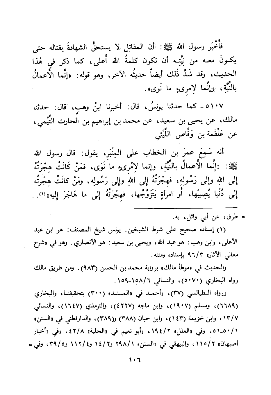 5107 - كَمَا حَدَّثَنَا يُونُسُ قَالَ: أَخْبَرَنَا ابْنُ وَهْبٍ قَالَ: حَدَّثَنَا مَالِكٌ، عَنْ يَحْيَى بْنِ سَعِيدٍ، عَنْ مُحَمَّدِ بْنِ إِبْرَاهِيمَ بْنِ الْحَارِثِ التَّيْمِيِّ، عَنْ عَلْقَمَةَ بْنِ وَقَّاصٍ اللَّيْثِيِّ، أَنَّهُ سَمِعَ عُمَرَ بْنَ الْخَطَّابِ عَلَى الْمِنْبَرِ يَقُولُ: قَالَ رَسُولُ اللهِ صَلَّى اللَّهُ عَلَيْهِ وَسَلَّمَ: " إِنَّمَا الْأَعْمَالُ بِالنِّيَّةِ، وَإِنَّمَا لِامْرِئٍ مَا نَوَى، فَمَنْ كَانَتْ هِجْرَتُهُ إِلَى اللهِ وَإِلَى رَسُولِهِ، فَهِجْرَتُهُ إِلَى اللهِ وَإِلَى رَسُولِهِ، وَمَنْ كَانَتْ هِجْرَتُهُ إِلَى دُنْيَا يُصِيبُهَا، أَوِ امْرَأَةٍ يَتَزَوَّجُهَا، فَهِجْرَتُهُ إِلَى مَا هَاجَرَ إِلَيْهِ " -[107]-