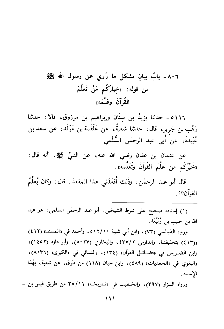 5116 - حَدَّثَنَا يَزِيدُ بْنُ سِنَانٍ، وَإِبْرَاهِيمُ بْنُ مَرْزُوقٍ قَالَا: حَدَّثَنَا وَهْبُ بْنُ جَرِيرٍ قَالَ: حَدَّثَنَا شُعْبَةُ، عَنْ عَلْقَمَةَ بْنِ مَرْثَدٍ، عَنْ سَعْدِ بْنِ عُبَيْدَةَ، عَنْ أَبِي عَبْدِ الرَّحْمَنِ السُّلَمِيِّ، عَنْ عُثْمَانَ بْنِ عَفَّانَ رَضِيَ اللهُ عَنْهُ، عَنِ النَّبِيِّ صَلَّى اللَّهُ عَلَيْهِ وَسَلَّمَ، أَنَّهُ قَالَ: " خَيْرُكُمْ مَنْ عَلَّمَ الْقُرْآنَ وَتَعَلَّمَهُ " قَالَ أَبُو عَبْدِ الرَّحْمَنِ: وَذَلِكَ أَقْعَدَنِي هَذَا الْمَقْعَدَ قَالَ: وَكَانَ يَعَلِّمُ الْقُرْآنَ -[112]-