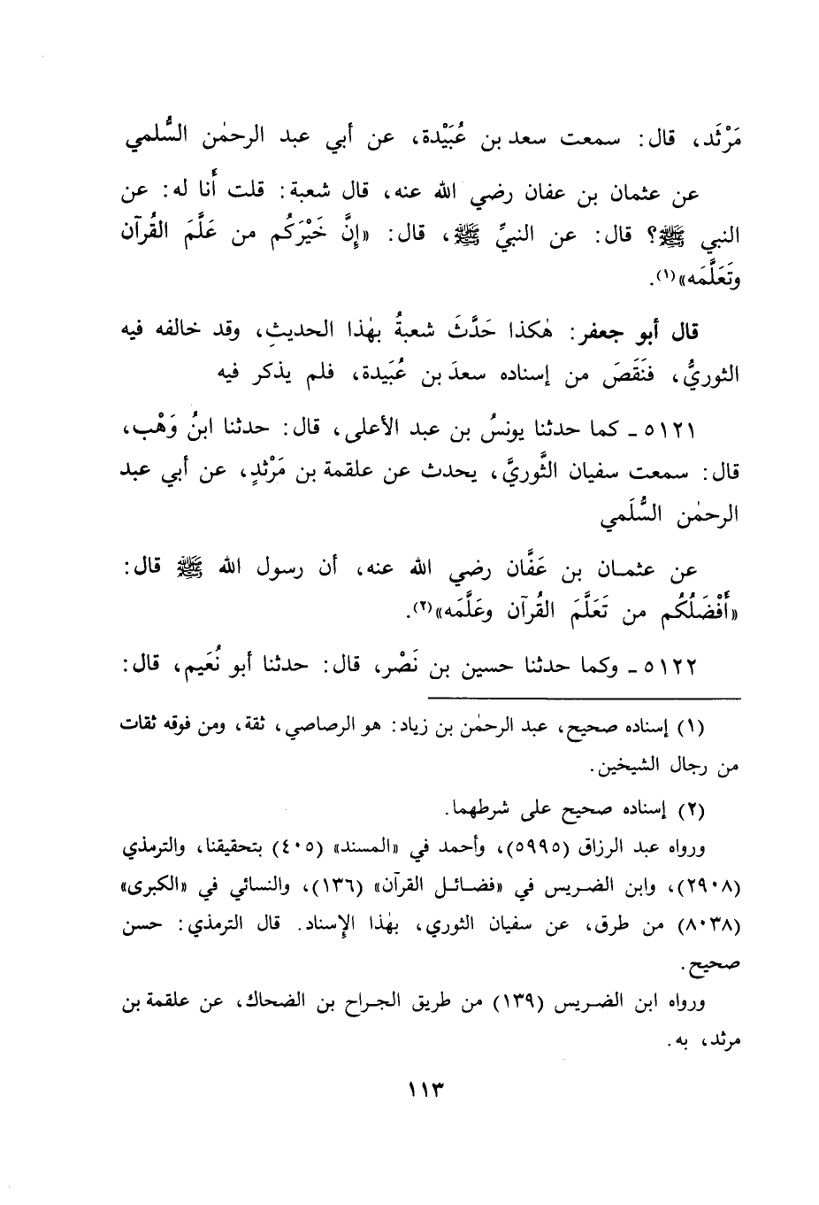 5121 - كَمَا حَدَّثَنَا يُونُسُ بْنُ عَبْدِ الْأَعْلَى قَالَ: حَدَّثَنَا ابْنُ وَهْبٍ قَالَ: سَمِعْتُ سُفْيَانَ الثَّوْرِيَّ يُحَدِّثُ، عَنْ عَلْقَمَةَ بْنِ مَرْثَدٍ، عَنْ أَبِي عَبْدِ الرَّحْمَنِ السُّلَمِيِّ، عَنْ عُثْمَانَ بْنِ عَفَّانَ رَضِيَ اللهُ عَنْهُ، أَنَّ رَسُولَ اللهِ صَلَّى اللَّهُ عَلَيْهِ وَسَلَّمَ قَالَ: " أَفْضَلُكُمْ مَنْ تَعَلَّمَ الْقُرْآنَ وَعَلَّمَهُ "
