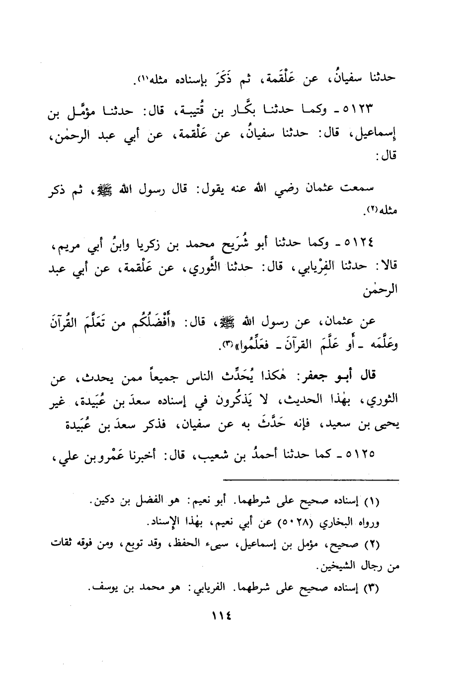 5124 - وَكَمَا حَدَّثَنَا أَبُو شُرَيْحٍ مُحَمَّدُ بْنُ زَكَرِيَّا، وَابْنُ أَبِي مَرْيَمَ قَالَا: حَدَّثَنَا الْفِرْيَابِيُّ قَالَ: حَدَّثَنَا الثَّوْرِيُّ، عَنْ عَلْقَمَةَ، عَنْ أَبِي عَبْدِ الرَّحْمَنِ، عَنْ عُثْمَانَ، عَنْ رَسُولِ اللهِ صَلَّى اللَّهُ عَلَيْهِ وَسَلَّمَ قَالَ: " أَفْضَلُكُمْ مَنْ تَعَلَّمَ الْقُرْآنَ وَعَلَّمَهُ أَوْ عَلَّمَ الْقُرْآنَ فَعَلِّمُوا " قَالَ أَبُو جَعْفَرٍ: هَكَذَا يُحَدِّثُ النَّاسُ جَمِيعًا مِمَّنْ يُحَدِّثُ عَنِ الثَّوْرِيِّ بِهَذَا الْحَدِيثِ، لَا يَذْكُرُونَ فِي إِسْنَادِهِ سَعْدَ بْنَ عُبَيْدَةَ، غَيْرَ يَحْيَى بْنِ سَعِيدٍ فَإِنَّهُ حَدَّثَ بِهِ عَنْ سُفْيَانَ، فَذَكَرَ سَعْدَ بْنَ عُبَيْدَةَ