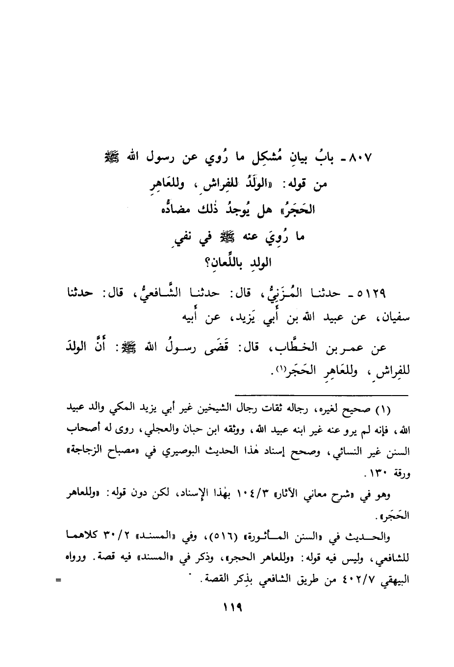 5129 - حَدَّثَنَا الْمُزَنِيُّ قَالَ: حَدَّثَنَا الشَّافِعِيُّ قَالَ: حَدَّثَنَا سُفْيَانُ، عَنْ عُبَيْدِ اللهِ بْنِ أَبِي يَزِيدَ، عَنْ أَبِيهِ، عَنْ عُمَرَ بْنِ الْخَطَّابِ قَالَ: قَضَى رَسُولُ اللهِ صَلَّى اللَّهُ عَلَيْهِ وَسَلَّمَ: " أَنَّ الْوَلَدَ لِلْفِرَاشِ، وَلِلْعَاهِرِ الْحَجَرَ "