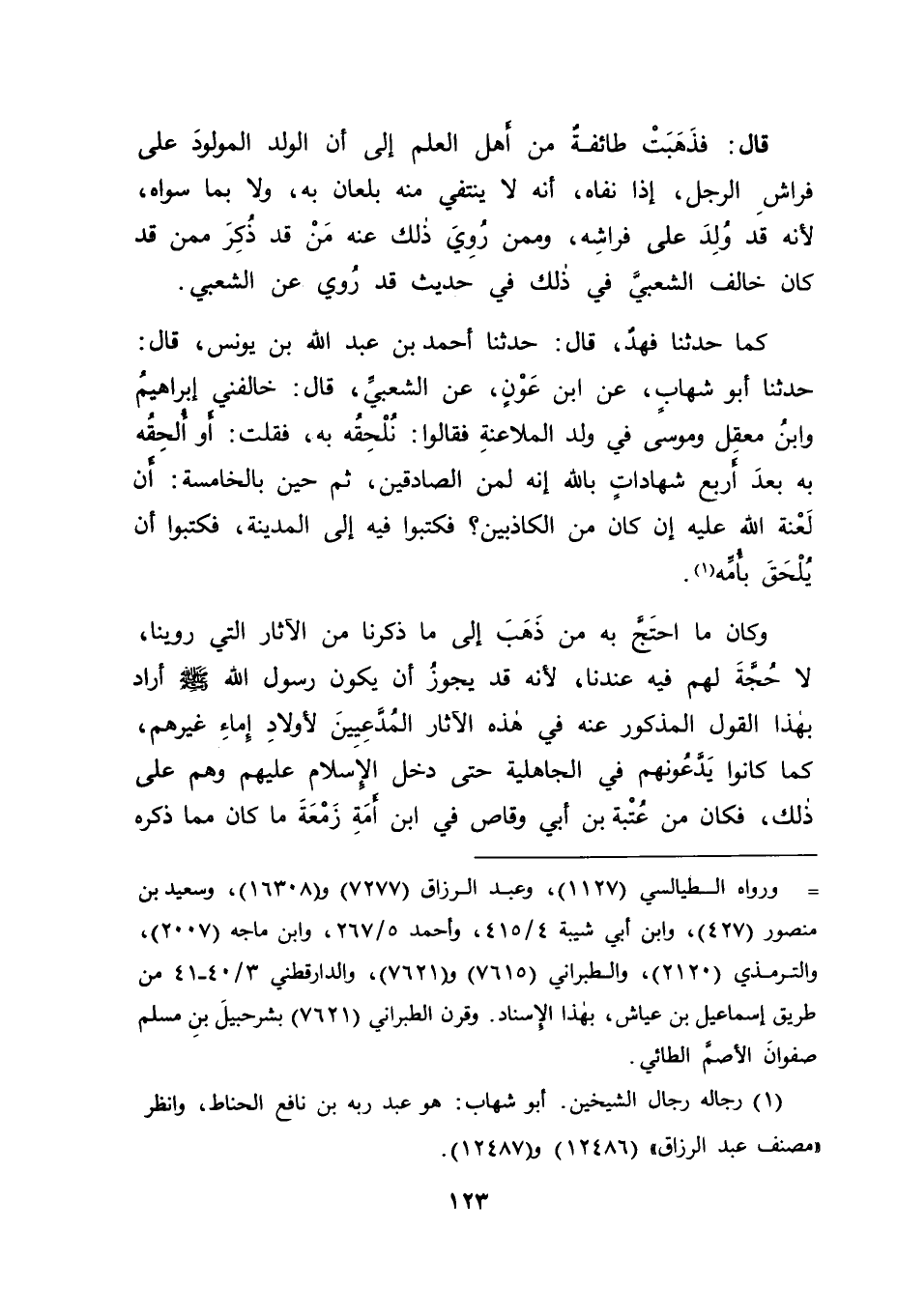 كَمَا حَدَّثَنَا فَهْدٌ قَالَ: حَدَّثَنَا أَحْمَدُ بْنُ عَبْدِ اللهِ بْنِ يُونُسَ قَالَ: حَدَّثَنَا أَبُو شِهَابٍ، عَنِ ابْنِ عَوْنٍ، عَنِ الشَّعْبِيِّ قَالَ: " خَالَفَنِي إِبْرَاهِيمُ، وَابْنُ مَعْقِلٍ، وَمُوسَى فِي وَلَدِ الْمُلَاعَنَةِ، فَقَالُوا: نُلْحِقُهُ بِهِ، فَقُلْتُ: أَوَ أُلْحِقُهُ بِهِ بَعْدَ أَرْبَعِ شَهَادَاتٍ بِاللهِ إِنَّهُ لَمِنَ الصَّادِقِينَ، ثُمَّ حِينَ بِالْخَامِسَةِ: أَنَّ لَعْنَةَ اللهِ عَلَيْهِ إِنْ كَانَ مِنَ الْكَاذِبِينَ؟، فَكَتَبُوا فِيهِ إِلَى الْمَدِينَةِ، فَكَتَبُوا أَنْ يُلْحَقَ بِأُمِّهِ " وَكَانَ مَا احْتَجَّ بِهِ مَنْ ذَهَبَ إِلَى مَا ذَكَرْنَا مِنَ الْآثَارِ الَّتِي رُوِّينَا، لَا حُجَّةَ لَهُمْ فِيهِ عِنْدَنَا، لِأَنَّهُ قَدْ يَجُوزُ أَنْ يَكُونَ رَسُولُ اللهِ صَلَّى اللَّهُ عَلَيْهِ وَسَلَّمَ أَرَادَ بِهَذَا الْقَوْلِ الْمَذْكُورِ عَنْهُ فِي هَذِهِ الْآثَارِ الْمُدَّعِيِينَ لِأَوْلَادِ إِمَاءِ غَيْرِهِمْ، كَمَا كَانُوا يَدَّعُونَهُمْ فِي الْجَاهِلِيَّةِ، حَتَّى دَخَلَ الْإِسْلَامُ عَلَيْهِمْ وَهُمْ عَلَى ذَلِكَ، فَكَانَ مِنْ عُتْبَةَ بْنِ أَبِي وَقَّاصٍ فِي ابْنِ أَمَةِ زَمْعَةَ مَا كَانَ مِمَّا ذَكَرَهُ -[124]- لِرَسُولِ اللهِ صَلَّى اللَّهُ عَلَيْهِ وَسَلَّمَ أَخُوهُ سَعْدٌ عَلَيْهِ، حَتَّى قَالَ لَهُ رَسُولُ اللهِ صَلَّى اللَّهُ عَلَيْهِ وَسَلَّمَ مَا ذُكِرَ عَنْهُ فِي هَذِهِ الْآثَارِ، وَقَدْ ذَكَرْنَا ذَلِكَ بِأَسَانِيدِهِ فِيمَا تَقَدَّمَ مِنَّا فِي كِتَابِنَا هَذَا فَأَمَّا نَفْيُ أَوْلَادِ الزَّوْجَاتِ فَلَيْسَ مِنْ ذَلِكَ فِي شَيْءٍ، لِأَنَّ رَسُولَ اللهِ صَلَّى اللَّهُ عَلَيْهِ وَسَلَّمَ قَدْ قَضَى فِي ذَلِكَ بِالْمُلَاعَنَةِ، وَرَدَّ الْوَلَدَ الْمُلَاعَنَ بِهِ إِلَى أُمِّهِ دُونَ الْمَوْلُودِ عَلَى فِرَاشِهِ