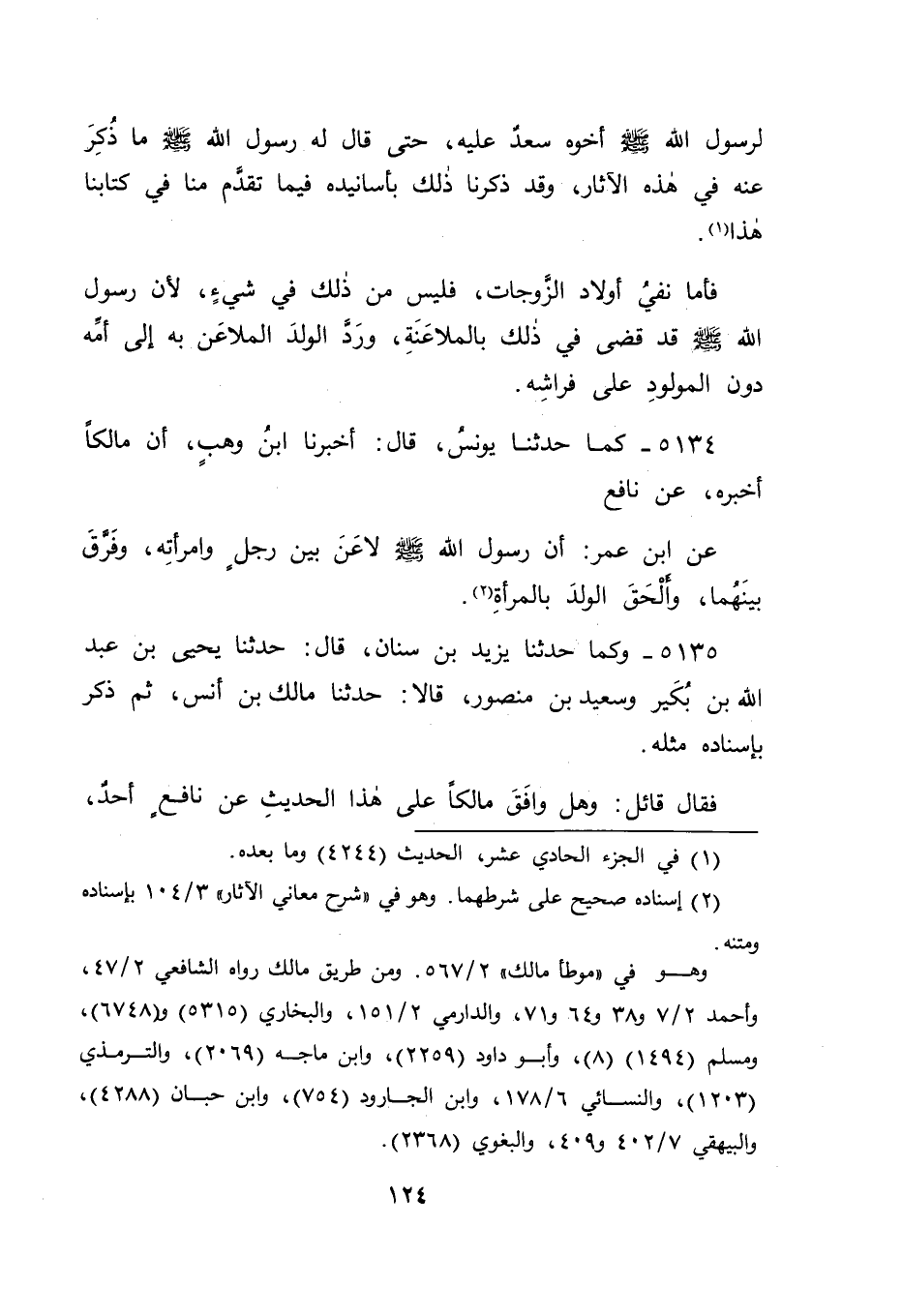 5135 - وَكَمَا حَدَّثَنَا يَزِيدُ بْنُ سِنَانٍ قَالَ: حَدَّثَنَا يَحْيَى بْنُ عَبْدِ اللهِ بْنِ بُكَيْرٍ، وَسَعِيدُ بْنُ مَنْصُورٍ قَالَا: حَدَّثَنَا مَالِكُ بْنُ أَنَسٍ، ثُمَّ ذَكَرَ بِإِسْنَادِهِ مِثْلَهُ فَقَالَ قَائِلٌ: وَهَلْ وَافَقَ مَالِكًا عَلَى هَذَا الْحَدِيثِ، عَنْ نَافِعٍ أَحَدٌ، -[125]- وَقَدْ رَوَاهُ غَيْرُهُ مِنْ أَصْحَابِ نَافِعٍ، فَلَمْ يَذْكُرُوا فِيهِ هَذَا الْحَرْفَ، وَالْجَمَاعَةُ أَوْلَى مِنَ الْوَاحِدِ؟ فَكَانَ جَوَابُنَا لَهُ فِي ذَلِكَ بِتَوْفِيقِ اللهِ، وَعَوْنِهِ: أَنَّ مَالِكًا إِمَامٌ حَافَظٌ ثَبْتٌ فِي رِوَايَتِهِ، مِمَّنْ لَوْ رُوِيَ حَدِيثًا فَانْفَرَدَ بِهِ كَانَ مَقْبُولًا مِنْهُ، وَإِذَا كَانَ كَذَلِكَ كَانَ إِذَا زَادَ زِيَادَةً فِي حَدِيثٍ مَقْبُولَةً مِنْهُ، مَعَ أَنَّا قَدْ وَجَدْنَا هَذَا الْمَعْنَى فِي الْوَلَدِ الْمُلَاعَنِ بِهِ عَنْ رَسُولِ اللهِ صَلَّى اللَّهُ عَلَيْهِ وَسَلَّمَ مِنْ غَيْرِ حَدِيثِ ابْنِ عُمَرَ
