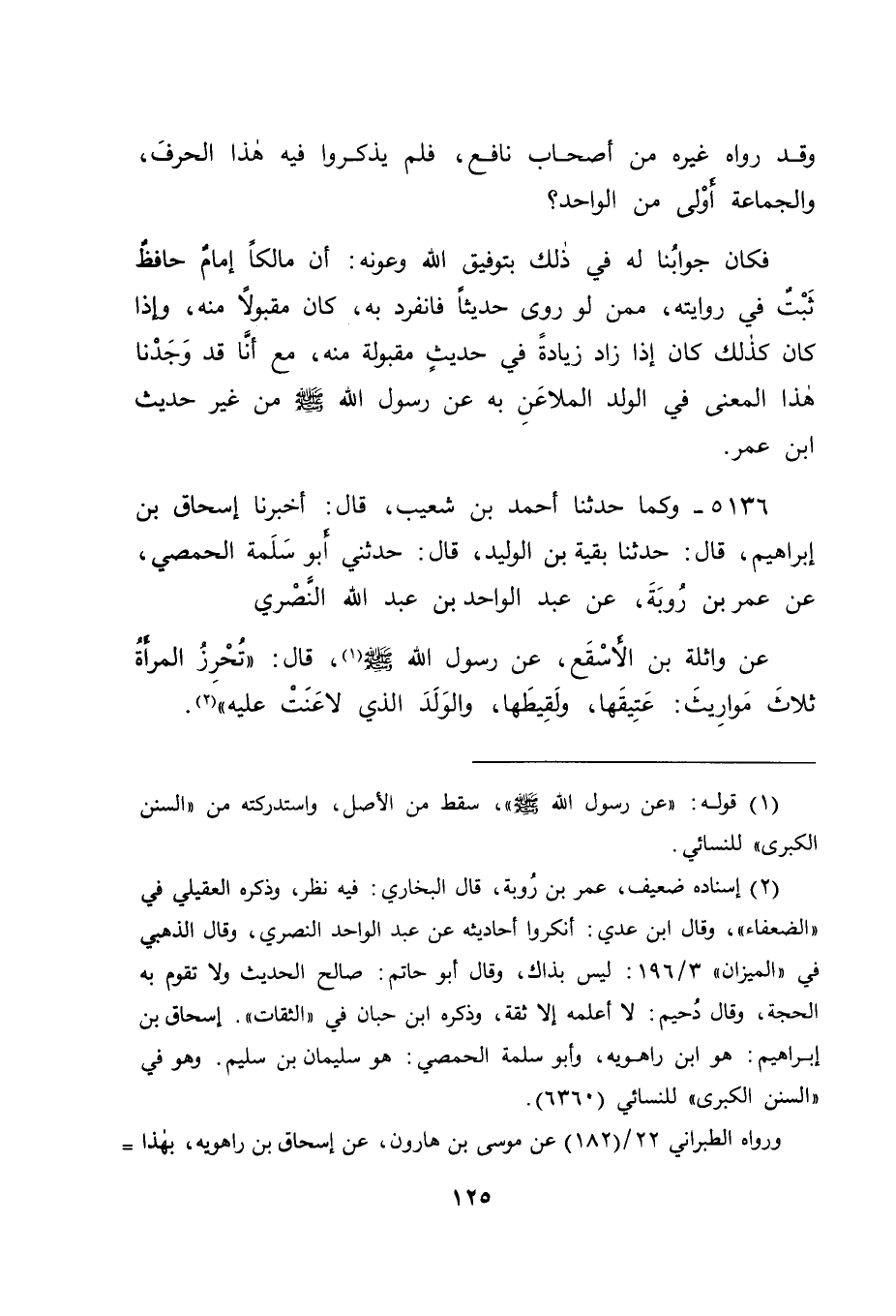 5136 - وَكَمَا حَدَّثَنَا أَحْمَدُ بْنُ شُعَيْبٍ قَالَ: أَخْبَرَنَا إِسْحَاقُ بْنُ إِبْرَاهِيمَ قَالَ: حَدَّثَنَا بَقِيَّةُ بْنُ الْوَلِيدِ قَالَ: حَدَّثَنِي أَبُو سَلَمَةَ الْحِمْصِيُّ، عَنْ عُمَرَ بْنِ رُؤْبَةَ، عَنْ عَبْدِ الْوَاحِدِ بْنِ عَبْدِ اللهِ النَّصْرِيِّ، عَنْ وَاثِلَةَ بْنِ الْأَسْقَعِ، عَنْ رَسُولِ اللهِ صَلَّى اللَّهُ عَلَيْهِ وَسَلَّمَ قَالَ: " تُحْرِزُ الْمَرْأَةُ ثَلَاثَ مَوَارِيثَ: عَتِيقَهَا، وَلَقِيطَهَا، وَالْوَلَدَ الَّذِي لَاعَنَتْ عَلَيْهِ " -[126]-