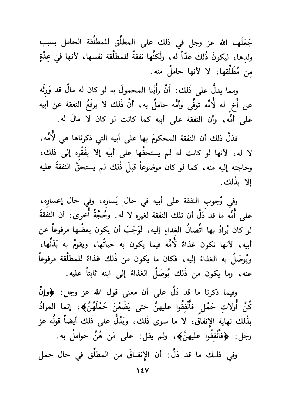 جَعَلَهَا اللهُ عَزَّ وَجَلَّ فِي ذَلِكَ عَلَى الْمُطَلِّقِ لِلْمُطَلَّقَةِ الْحَامِلِ بِسَبَبِ وَلَدِهَا، لِيَكُونَ ذَلِكَ عَدًّا لَهُ، وَلَكِنَّهَا نَفَقَةٌ لِلْمُطَلَّقَةِ نَفْسِهَا، لِأَنَّهَا فِي عِدَّةٍ مِنْ مُطَلِّقِهَا، لَا لِأَنَّهَا حَامِلٌ مِنْهُ وَمِمَّا يَدُلُّ عَلَى ذَلِكَ: أَنْ رَأَيْنَا الْمَحْمُولَ بِهِ، لَوْ كَانَ لَهُ مَالٌ قَدْ وَرِثَهُ عَنْ أَخٍ لَهُ لِأُمِّهِ تُوُفِّيَ، وَأُمُّهُ حَامِلٌ بِهِ، أَنَّ ذَلِكَ لَا يَرْفَعُ النَّفَقَةَ عَنْ أَبِيهِ عَلَى أُمِّهِ، وَأَنَّ النَّفَقَةَ عَلَى أَبِيهِ كَمَا كَانَتْ لَوْ كَانَ لَا مَالَ لَهُ فَدَلَّ ذَلِكَ أَنَّ النَّفَقَةَ الْمَحْكُومَ بِهَا عَلَى أَبِيهِ الَّتِي ذَكَرْنَاهَا هِيَ لِأُمِّهِ، لَا لَهُ، لِأَنَّهَا لَوْ كَانَتْ لَهُ لَمْ يَسْتَحِقَّهَا عَلَى أَبِيهِ، إِلَّا بِفَقْرِهِ إِلَى ذَلِكَ، وَحَاجَتِهِ إِلَيْهِ مِنْهُ، كَمَا لَوْ كَانَ مَوْضُوعًا قَبْلَ ذَلِكَ، لَمْ يَسْتَحِقَّ النَّفَقَةَ عَلَيْهِ إِلَّا بِذَلِكَ وَفِي وُجُوبِ النَّفَقَةِ عَلَى أَبِيهِ فِي حَالِ يَسَارِهِ، وَفِي حَالِ إِعْسَارِهِ عَلَى أُمِّهِ مَا قَدْ دَلَّ أَنَّ تِلْكَ النَّفَقَةَ لِغَيْرِهِ لَا لَهُ، وَحُجَّةٌ أُخْرَى: أَنَّ النَّفَقَةَ لَوْ كَانَ يُرَادُ بِهَا اتِّصَالُ الْغِذَاءِ إِلَيْهِ، لَوَجَبَ أَنْ يَكُونَ بَعْضُهَا مَرْفُوعًا عَنْ أَبِيهِ، لِأَنَّهَا تَكُونُ غِذَاءً لِأُمِّهِ، فِيمَا يَكُونُ بِهِ حَيَاتُهَا، وَيَقُومُ بِهِ بَدَنُهَا، وَيُوصَلُ بِهِ الْغِذَاءُ إِلَيْهِ، فَكَانَ مَا يَكُونُ مِنْ ذَلِكَ غِذَاءً لِلْمُطَلَّقَةِ مَرْفُوعًا عَنْهُ، وَمَا يَكُونُ مِنْ ذَلِكَ يُوصَلُ الْغِذَاءُ إِلَى ابْنِهِ ثَابِتًا عَلَيْهِ وَفِيمَا ذَكَرْنَا مَا قَدْ دَلَّ عَلَى أَنَّ مَعْنَى قَوْلِ اللهِ عَزَّ وَجَلَّ: {وَإِنْ كُنَّ أُولَاتِ حَمْلٍ فَأَنْفِقُوا عَلَيْهِنَّ حَتَّى يَضَعْنَ حَمْلَهُنَّ} [الطلاق: 6] ، إِنَّمَا الْمُرَادُ بِذَلِكَ نَهَايَةَ الْإِنْفَاقِ، لَا مَا سِوَى ذَلِكَ، وَيَدُلُّ عَلَى ذَلِكَ أَيْضًا قَوْلُهُ عَزَّ وَجَلَّ: {فَأَنْفِقُوا عَلَيْهِنَّ} [الطلاق: 6] ، وَلَمْ يَقُلْ: عَلَى مَنْ هُنَّ حَوَامِلُ بِهِ وَفِي ذَلِكَ مَا قَدْ دَلَّ: أَنَّ الْإِنْفَاقَ مِنَ الْمُطَلِّقِ فِي حَالِ حَمْلِ