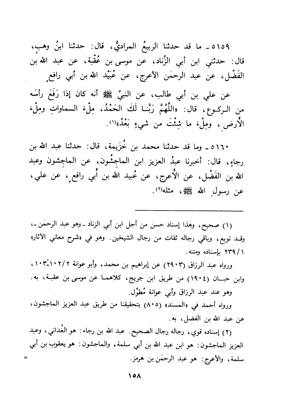 5160 - وَمَا قَدْ حَدَّثَنَا مُحَمَّدُ بْنُ خُزَيْمَةَ قَالَ: حَدَّثَنَا عَبْدُ اللهِ بْنُ رَجَاءٍ قَالَ: أَخْبَرَنَا عَبْدُ الْعَزِيزِ بْنُ الْمَاجِشُونَ، عَنِ الْمَاجِشُونَ، وَعَبْدِ اللهِ بْنِ الْفَضْلِ، عَنِ الْأَعْرَجِ، عَنْ عُبَيْدِ اللهِ بْنِ أَبِي رَافِعٍ، عَنْ عَلِيٍّ، عَنْ رَسُولِ اللهِ صَلَّى اللَّهُ عَلَيْهِ وَسَلَّمَ مِثْلَهُ -[159]-