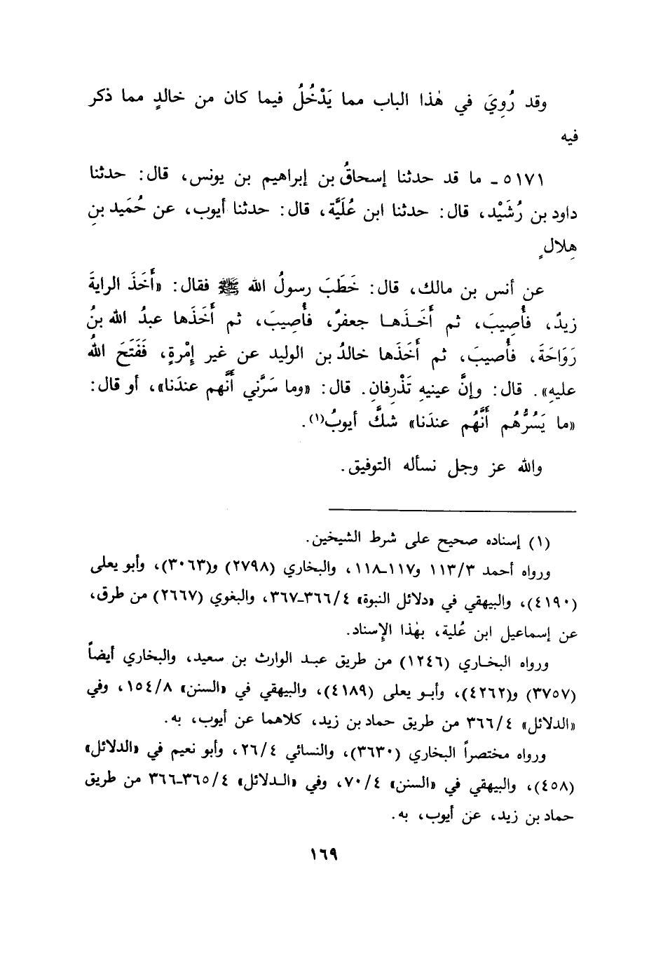 5171 - مَا قَدْ حَدَّثَنَا إِسْحَاقُ بْنُ إِبْرَاهِيمَ بْنِ يُونُسَ قَالَ: حَدَّثَنَا دَاوُدُ بْنُ رُشَيْدٍ قَالَ: حَدَّثَنَا ابْنُ عُلَيَّةَ قَالَ: حَدَّثَنَا أَيُّوبُ، عَنْ حُمَيْدِ بْنِ هِلَالٍ، عَنْ أَنَسِ بْنِ مَالِكٍ قَالَ: خَطَبَ رَسُولُ اللهِ صَلَّى اللَّهُ عَلَيْهِ وَسَلَّمَ، فَقَالَ: " أَخَذَ الرَّايَةَ زَيْدٌ فَأُصِيبَ، ثُمَّ أَخَذَهَا جَعْفَرٌ فَأُصِيبَ، ثُمَّ أَخَذَهَا عَبْدُ اللهِ بْنُ رَوَاحَةَ فَأُصِيبَ، ثُمَّ أَخَذَهَا خَالِدُ بْنُ الْوَلِيدِ عَنْ غَيْرِ إِمْرَةٍ، فَفَتَحَ اللهُ عَلَيْهِ "، قَالَ: وَإِنَّ عَيْنَيْهِ تَذْرِفَانِ قَالَ: " وَمَا سَرَّنِي أَنَّهُمْ عِنْدَنَا "، أَوْ قَالَ: " مَا يَسُرُّهُمْ أَنَّهُمْ عِنْدَنَا " شَكَّ أَيُّوبُ وَاللهَ عَزَّ وَجَلَّ نَسْأَلُهُ التَّوْفِيقَ
