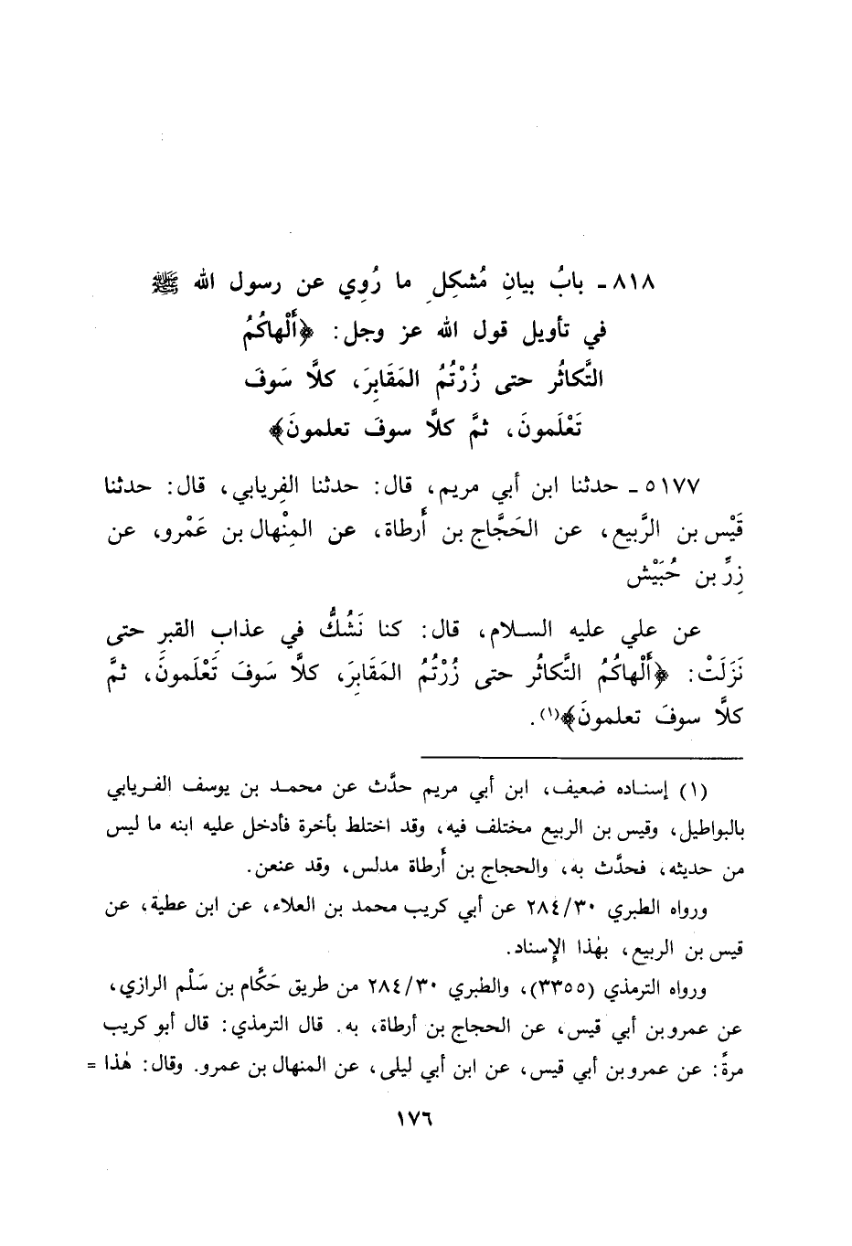 5177 - حَدَّثَنَا ابْنُ أَبِي مَرْيَمَ قَالَ: حَدَّثَنَا الْفِرْيَابِيُّ قَالَ: حَدَّثَنَا قَيْسُ بْنُ الرَّبِيعِ، عَنِ الْحَجَّاجِ بْنِ أَرْطَأَةَ، عَنِ الْمِنْهَالِ بْنِ عَمْرٍو، عَنْ زِرِّ بْنِ حُبَيْشٍ، عَنْ عَلِيٍّ عَلَيْهِ السَّلَامُ، قَالَ: " كُنَّا نَشُكُّ فِي عَذَابِ الْقَبْرِ، حَتَّى نَزَلَتْ: {أَلْهَاكُمُ التَّكَاثُرُ حَتَّى زُرْتُمُ الْمَقَابِرَ كَلَّا سَوْفَ تَعْلَمُونَ ثُمَّ كَلَّا سَوْفَ تَعْلَمُونَ} [التكاثر: 2] " -[177]- قَالَ أَبُو جَعْفَرٍ: سَمِعْتُ مُحَمَّدَ بْنَ عَبْدِ الرَّحْمَنِ الْهَرَوِيَّ يَقُولُ: قَالَ أَحْمَدُ بْنُ حَنْبَلٍ: " مَا حَدَّثَ الْفِرْيَابِيُّ بِحَدِيثٍ أَحْسَنَ مِنْ هَذَا الْحَدِيثِ، يَعْنِي حَدِيثَ قَيْسٍ هَذَا " قَالَ أَبُو جَعْفَرٍ: فَكَانَ هَذَا الْحَدِيثُ فِيهِ إِثْبَاتُ عَذَابِ الْقَبْرِ، وَقَدْ رُوِيَتْ عَنْ رَسُولِ اللهِ صَلَّى اللَّهُ عَلَيْهِ وَسَلَّمَ آثَارٌ بِاسْتِعَاذَتِهِ مِنْهُ مُتَوَاتِرَةٌ، مِنْهَا