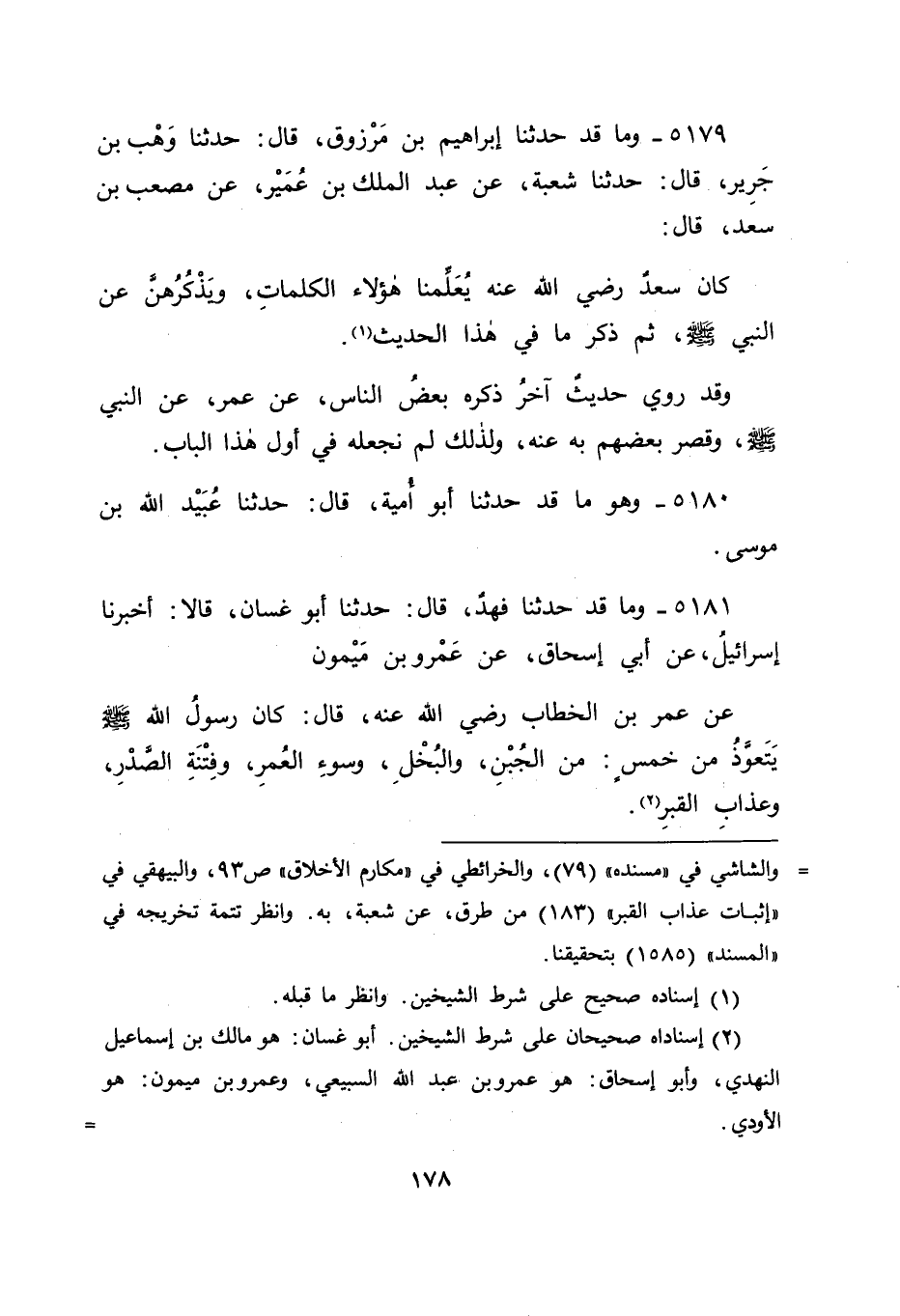 5181 - وَمَا قَدْ حَدَّثَنَا فَهْدٌ قَالَ: حَدَّثَنَا أَبُو غَسَّانَ قَالَا: أَخْبَرَنَا إِسْرَائِيلُ، عَنْ أَبِي إِسْحَاقَ، عَنْ عَمْرِو بْنِ مَيْمُونٍ، عَنْ عُمَرَ بْنِ الْخَطَّابِ رَضِيَ اللهُ عَنْهُ قَالَ: " كَانَ رَسُولُ اللهِ صَلَّى اللَّهُ عَلَيْهِ وَسَلَّمَ يَتَعَوَّذُ مِنْ خَمْسٍ: مِنَ الْجُبْنِ، وَالْبُخْلِ، وَسُوءِ الْعُمُرِ، وَفِتْنَةِ الصَّدْرِ، وَعَذَابِ الْقَبْرِ " -[179]-