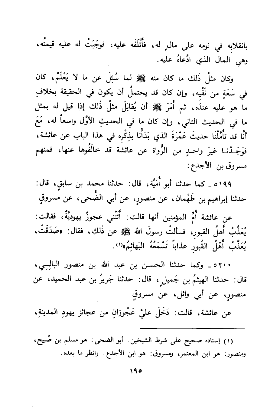5200 - وَكَمَا حَدَّثَنَا الْحَسَنُ بْنُ عَبْدِ اللهِ بْنِ مَنْصُورٍ الْبَالِسِيُّ قَالَ: حَدَّثَنَا الْهَيْثَمُ بْنُ جَمِيلٍ قَالَ: حَدَّثَنَا جَرِيرُ بْنُ عَبْدِ الْحَمِيدِ، عَنْ مَنْصُورٍ، عَنْ أَبِي وَائِلٍ، عَنْ مَسْرُوقٍ، عَنْ عَائِشَةَ قَالَتْ: دَخَلَ عَلَيَّ عَجُوزَانِ مِنْ عَجَائِزِ يَهُودَ الْمَدِينَةِ، -[196]- فَقَالَتَا لِي: إِنَّ أَهْلَ الْقُبُورِ يُعَذَّبُونَ فِي قُبُورِهِمْ، فَكَذَّبْتُهُمَا، وَلَمْ أُصَدِّقْهُمَا، فَخَرَجَتَا، وَدَخَلَ عَلَيَّ رَسُولُ اللهِ صَلَّى اللَّهُ عَلَيْهِ وَسَلَّمَ، فَقُلْتُ: يَا رَسُولَ اللهِ، إِنَّ عَجُوزَيْنِ دَخَلَتَا عَلَيَّ، فَزَعَمَتَا أَنَّ أَهْلَ الْقُبُورِ يُعَذَّبُونَ، فَقَالَ: " صَدَقَتَا، إِنَّهُمْ لَيُعَذَّبُونَ عَذَابًا تَسْمَعُهُ الْبَهَائِمُ كُلُّهَا " فَقَالَتْ عَائِشَةُ: " فَمَا رَأَيْتُهُ بَعْدَ ذَلِكَ فِي صَلَاةٍ، إِلَّا يَتَعَوَّذُ مِنْ عَذَابِ الْقَبْرِ " وَمِنْهُمْ: ذَكْوَانُ