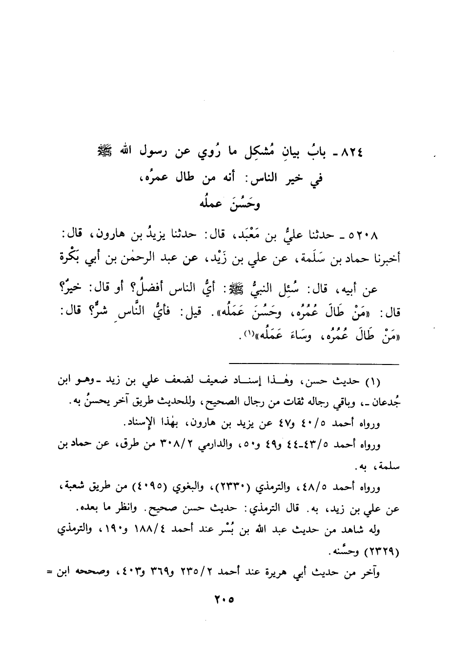 5208 - حَدَّثَنَا عَلِيُّ بْنُ مَعْبَدٍ قَالَ: حَدَّثَنَا يَزِيدُ بْنُ هَارُونَ قَالَ: أَخْبَرَنَا حَمَّادُ بْنُ سَلَمَةَ، عَنْ عَلِيِّ بْنِ زَيْدٍ، عَنْ عَبْدِ الرَّحْمَنِ بْنِ أَبِي بَكْرَةَ، عَنْ أَبِيهِ قَالَ: " سُئِلَ النَّبِيُّ صَلَّى اللَّهُ عَلَيْهِ وَسَلَّمَ: أَيُّ النَّاسِ أَفْضَلُ؟، أَوْ قَالَ: خَيْرٌ؟، قَالَ: " مَنْ طَالَ عُمْرُهُ، وَحَسُنَ عَمَلُهُ "، قِيلَ: فَأَيُّ النَّاسِ شَرٌّ؟، قَالَ: " مَنْ طَالَ عُمْرُهُ، وَسَاءَ عَمَلُهُ " -[206]-
