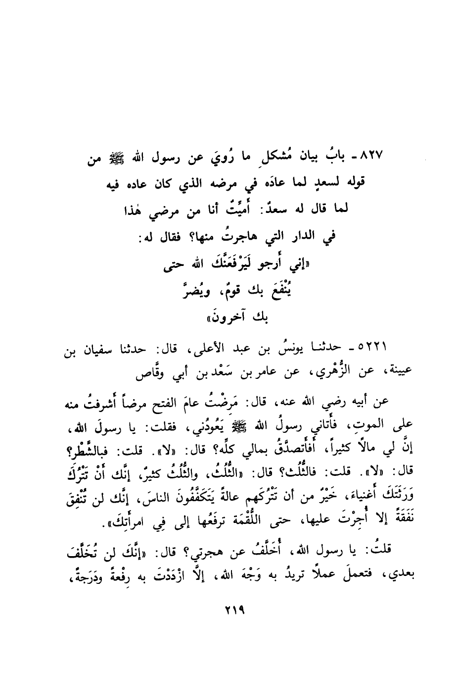5221 - حَدَّثَنَا يُونُسُ بْنُ عَبْدِ الْأَعْلَى قَالَ: حَدَّثَنَا سُفْيَانُ بْنُ عُيَيْنَةَ، عَنِ الزُّهْرِيِّ، عَنْ عَامِرِ بْنِ سَعْدِ بْنِ أَبِي وَقَّاصٍ، عَنْ أَبِيهِ رَضِيَ اللهُ عَنْهُ قَالَ: " مَرِضْتُ عَامَ الْفَتْحِ مَرَضًا أَشْرَفْتُ مِنْهُ عَلَى الْمَوْتِ، فَأَتَانِي رَسُولُ اللهِ صَلَّى اللَّهُ عَلَيْهِ وَسَلَّمَ يَعُودُنِي، فَقُلْتُ: يَا رَسُولَ اللهِ، إِنَّ لِي مَالًا كَثِيرًا، أَفَأَتَصَدَّقُ بِمَالِي كُلِّهِ؟ قَالَ: " لَا "، قُلْتُ: فَبَالشَّطْرِ؟ قَالَ: " لَا "، قُلْتُ: فَالثُّلُثُ؟ قَالَ: " الثُّلُثُ، وَالثُّلُثُ كَثِيرٌ، إِنَّكَ أَنْ تَتْرُكْ وَرَثَتَكَ أَغْنِيَاءَ خَيْرٌ مِنْ أَنْ تَتْرُكَهُمْ عَالَةً يَتَكَفَّفُونَ النَّاسَ، إِنَّكَ لَنْ تُنْفِقَ نَفَقَةً، إِلَّا أُجِرْتَ عَلَيْهَا، حَتَّى اللُّقْمَةَ تَرْفَعُهَا إِلَى فِيِّ امْرَأَتِكَ " قُلْتُ: يَا رَسُولَ اللهِ، أُخَلَّفَ عَنْ هِجْرَتِي؟ قَالَ: " إِنَّكَ لَنْ تُخَلَّفَ بَعْدِي فَتَعْمَلَ عَمَلًا تُرِيدُ بِهِ وَجْهَ اللهِ إِلَّا ازْدَدْتَ بِهِ رِفْعَةً وَدَرَجَةً، -[220]- وَلَعَلَّكَ أَنْ تُخَلَّفَ بَعْدِي، حَتَّى يَنْتَفِعَ بِكَ أَقْوَامٌ، وَيُضَرَّ بِكَ آخَرُونَ، اللهُمَّ أَمْضِ لِأَصْحَابِي هِجْرَتَهُمْ، وَلَا تَرُدَّهُمْ عَلَى أَعْقَابِهِمْ، لَكِنِ الْبَائِسُ سَعْدُ بْنُ خَوْلَةَ "، يَرْثِي لَهُ رَسُولُ اللهِ صَلَّى اللَّهُ عَلَيْهِ وَسَلَّمَ أَنْ مَاتَ بِمَكَّةَ "