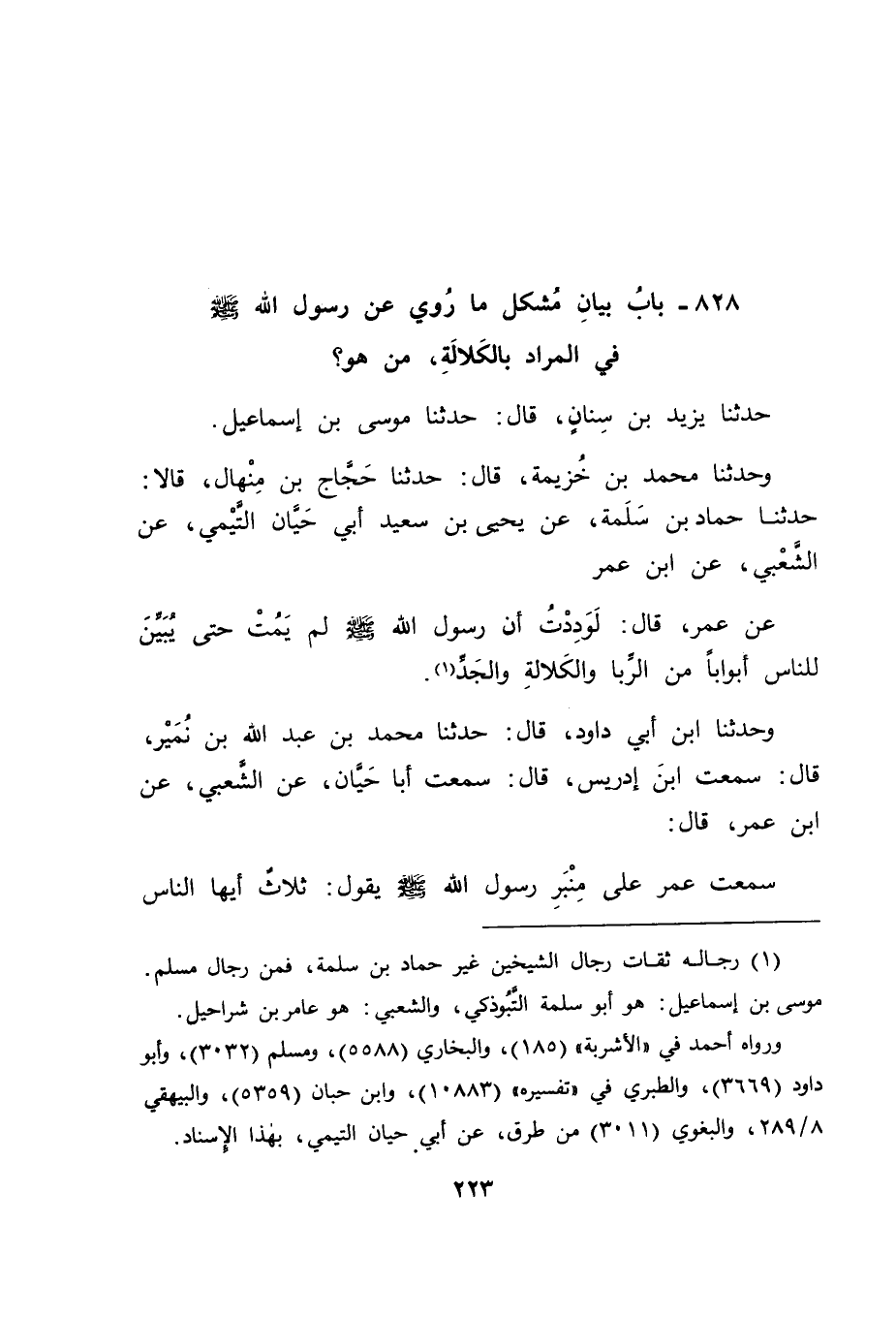 وَحَدَّثَنَا ابْنُ أَبِي دَاوُدَ قَالَ: حَدَّثَنَا مُحَمَّدُ بْنُ عَبْدِ اللهِ بْنِ نُمَيْرٍ قَالَ: سَمِعْتُ ابْنَ إِدْرِيسَ قَالَ: سَمِعْتُ أَبَا حَيَّانَ، عَنِ الشَّعْبِيِّ، عَنِ ابْنِ عُمَرَ قَالَ: سَمِعْتُ عُمَرَ عَلَى مِنْبَرِ رَسُولِ اللهِ صَلَّى اللَّهُ عَلَيْهِ وَسَلَّمَ يَقُولُ: " ثَلَاثٌ أَيُّهَا النَّاسُ، -[224]- وَدِدْتُ أَنَّ رَسُولَ اللهِ صَلَّى اللَّهُ عَلَيْهِ وَسَلَّمَ عَهْدَ إِلَيْنَا فِيهِنَّ عَهْدًا نَنْتَهِي إِلَيْهِ: الْجَدُّ، وَالْكَلَالَةُ، وَأَبْوَابٌ مِنْ أَبْوَابِ الرِّبَا "