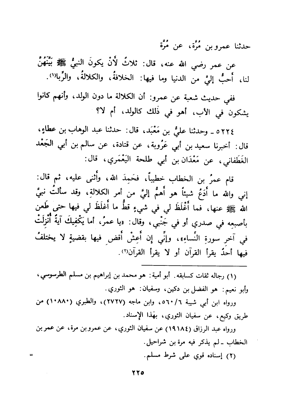 5224 - وَحَدَّثَنَا عَلِيُّ بْنُ مَعْبَدٍ قَالَ: حَدَّثَنَا عَبْدُ الْوَهَّابِ بْنُ عَطَاءٍ قَالَ: أَخْبَرَنَا سَعِيدُ بْنُ أَبِي عَرُوبَةَ، عَنْ قَتَادَةَ، عَنْ سَالِمِ بْنِ أَبِي الْجَعْدِ الْغَطَفَانِيِّ، عَنْ مَعْدَانَ بْنِ أَبِي طَلْحَةَ الْيَعْمُرِيِّ قَالَ: " قَامَ عُمَرُ بْنُ الْخَطَّابِ خَطِيبًا، فَحَمِدَ اللهَ، وَأَثْنَى عَلَيْهِ، ثُمَّ قَالَ: إِنِّي وَاللهِ مَا أَدَعُ شَيْئًا هُوَ أَهَمُّ إِلَيَّ مِنْ أَمْرِ الْكَلَالَةِ، وَقَدْ سَأَلْتُ نَبِيَّ اللهِ صَلَّى اللَّهُ عَلَيْهِ وَسَلَّمَ عَنْهَا، فَمَا أَغْلَظَ لِي فِي شَيْءٍ قَطُّ، مَا أَغْلَظَ لِي فِيهَا، حَتَّى طَعَنَ بِأُصْبُعِهِ فِي صَدْرِي، أَوْ فِي جَنْبِي، وَقَالَ: " يَا عُمَرُ، أَمَا يَكْفِيكَ آيَةٌ أُنْزِلَتْ فِي آخِرِ سُورَةِ النِّسَاءِ "، وَإِنِّي إِنْ أَعِشْ أَقْضِ فِيهَا بِقَضِيَّةٍ، لَا يَخْتَلِفُ فِيهَا أَحَدٌ يَقْرَأُ الْقُرْآنَ، أَوْ لَا يَقْرَأُ الْقُرْآنَ "