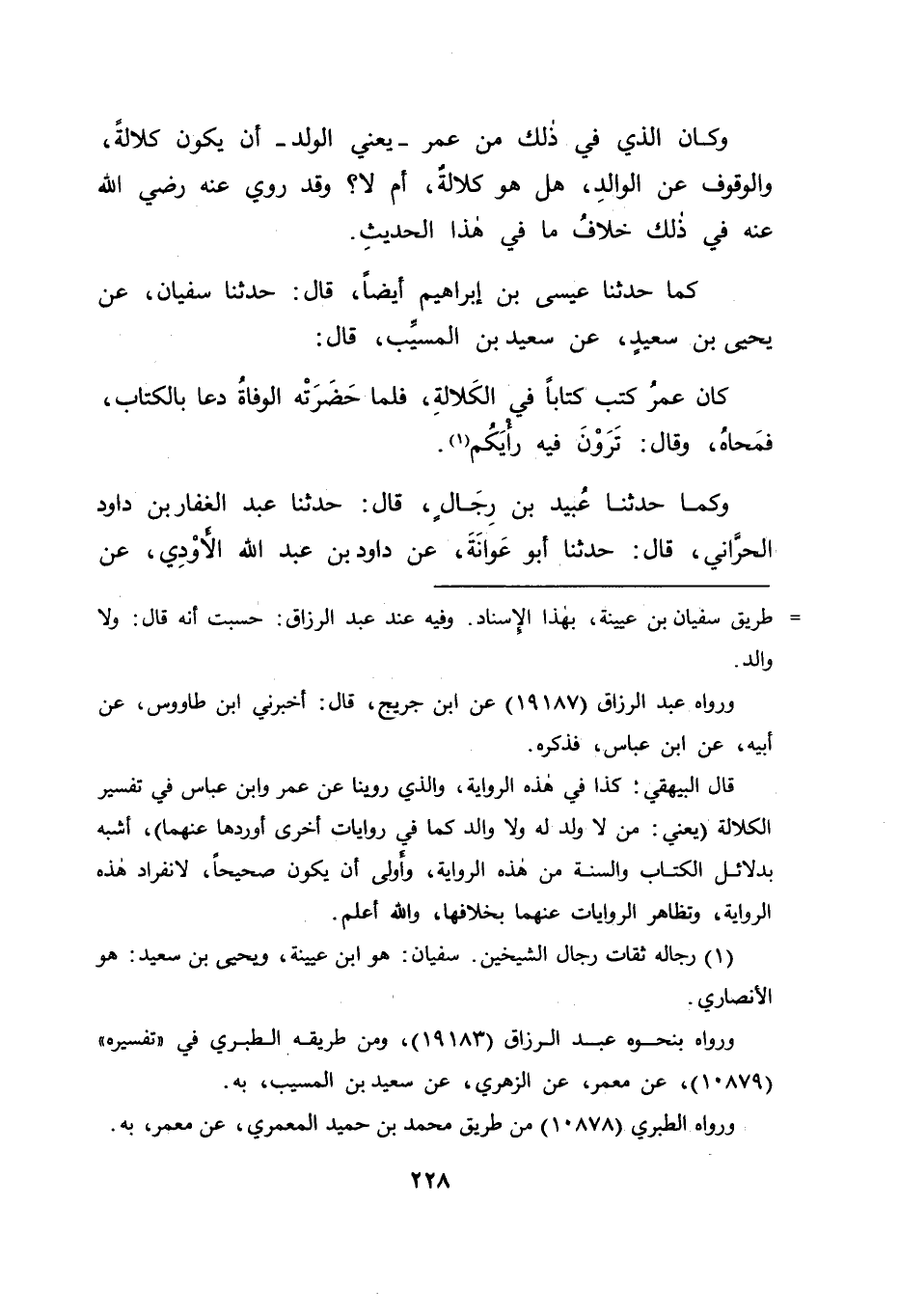 وَكَمَا حَدَّثَنَا عُبَيْدُ بْنُ رِجَالٍ قَالَ: حَدَّثَنَا عَبْدُ الْغَفَّارِ بْنُ دَاوُدَ الْحَرَّانِيُّ قَالَ: حَدَّثَنَا أَبُو عَوَانَةَ، عَنْ دَاوُدَ بْنِ عَبْدِ اللهِ الْأَوْدِيِّ، عَنْ -[229]- حُمَيْدِ بْنِ عَبْدِ الرَّحْمَنِ الْحِمْيَرِيِّ قَالَ: حَدَّثَنَا ابْنُ عَبَّاسٍ بِالْبَصْرَةِ قَالَ: قَالَ عُمَرُ لَمَّا طُعِنَ: " أَمَّا أَنَا فَلَمْ أَقْضِ فِي الْكَلَالَةِ قَضَاءً " ثُمَّ نَظَرْنَا فِيمَا رُوِيَ فِي الْكَلَالَةِ سِوَى ذَلِكَ؟