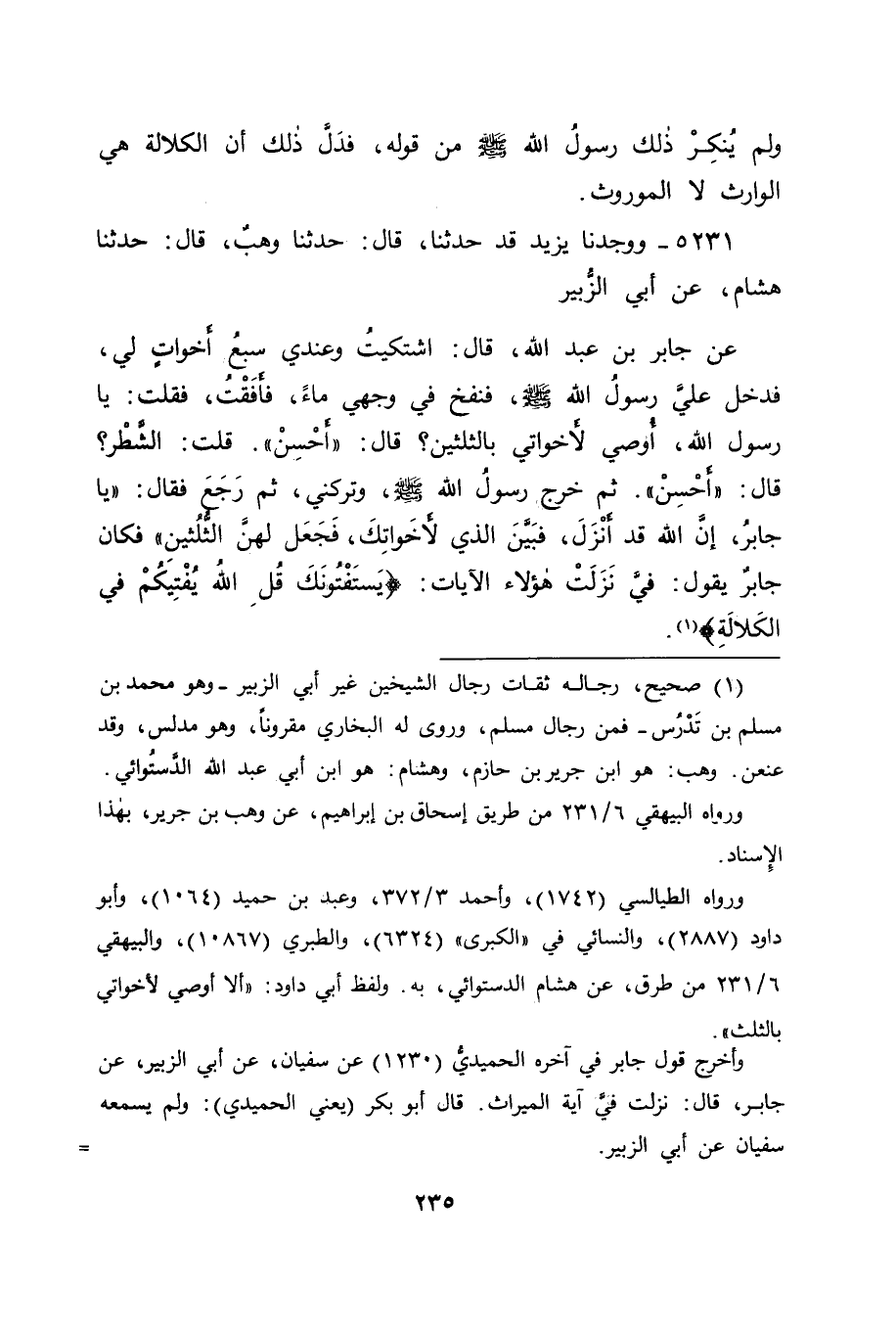 5231 - وَوَجَدْنَا يَزِيدَ قَدْ حَدَّثَنَا قَالَ: حَدَّثَنَا وَهْبٌ قَالَ: حَدَّثَنَا هِشَامٌ، عَنْ أَبِي الزُّبَيْرِ، عَنْ جَابِرِ بْنِ عَبْدِ اللهِ قَالَ: " اشْتَكَيْتُ، وَعِنْدِي سَبْعُ أَخَوَاتٍ لِي، فَدَخَلَ عَلَيَّ رَسُولُ اللهِ صَلَّى اللَّهُ عَلَيْهِ وَسَلَّمَ، فَنَفَخَ فِي وَجْهِي مَاءً، فَأَفَقْتُ، فَقُلْتُ: يَا رَسُولَ اللهِ، أُوصِي لِأَخَوَاتِي بِالثُّلُثَيْنِ؟ قَالَ: " أَحْسِنْ "، قُلْتُ: الشَّطْرُ؟ قَالَ: " أَحْسِنْ "، ثُمَّ خَرَجَ رَسُولُ اللهِ صَلَّى اللَّهُ عَلَيْهِ وَسَلَّمَ، وَتَرَكَنِي، ثُمَّ رَجَعَ، فَقَالَ: " يَا جَابِرُ، إِنَّ اللهَ قَدْ أَنْزَلَ، فَبَيَّنَ الَّذِي لِأَخَوَاتِكَ، فَجَعَلَ لَهُنَّ الثُّلُثَيْنِ " فَكَانَ جَابِرٌ يَقُولُ: فِيَّ نَزَلَتْ هَؤُلَاءِ الْآيَاتُ: {يَسْتَفْتُونَكَ قُلِ اللهُ يُفْتِيكُمْ فِي الْكَلَالَةِ} [النساء: 176] " -[236]- فَفِي هَذَا الْحَدِيثِ: أَنَّ الْأَخَوَاتِ اللَّاتِي ذَكَرَ جَابِرٌ لِلنَّبِيِّ صَلَّى اللَّهُ عَلَيْهِ وَسَلَّمَ أَنَّهُ كَلَالَةٌ مِمَّا لَمْ يُنْكِرْهُ رَسُولُ اللهِ صَلَّى اللَّهُ عَلَيْهِ وَسَلَّمَ وَكَانَ الْوَلَدُ، وَقَدْ تَكُونُ بِحَجْبِ الْأَخَوَاتِ إِذَا كَانَ ذَكَرًا، وَلَا يَحْجُبُهُنَّ إِذَا كَانَ أُنْثَى، لَيْسَ بِكَلَالَةٍ، كَانَ الْوَالِدُ الَّذِي لَا يَحْجُبُهُنَّ فِي الْأَحْوَالِ كُلِّهَا أَحْرَى أَنْ لَا يَكُونَ كَلَالَةً وَفِيمَا قَدْ ذَكَرْنَا مَا قَدْ دَلَّ أَنَّ الْكَلَالَةَ مَنْ يَرِثُ، لَا مَنْ يُورَثُ، وَفِي ذَلِكَ مَا قَدْ دَلَّ عَلَى صِحَّةِ قِرَاءَةِ مَنْ قَرَأَ: (وَإنْ كَانَ رَجُلٌ يُوَرِّثُ كَلَالَةً) ، وَاللهُ أَعْلَمُ