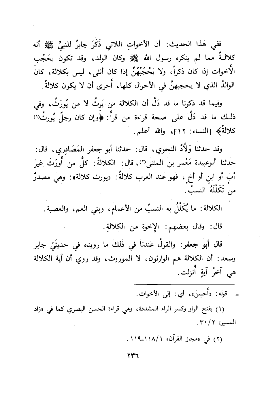 وَقَدْ حَدَّثَنَا وَلَّادٌ النَّحْوِيُّ قَالَ: حَدَّثَنَا أَبُو جَعْفَرٍ الْمَصَادِرِيُّ قَالَ: حَدَّثَنَا أَبُو عُبَيْدَةَ مَعْمَرُ بْنُ الْمُثَنَّى قَالَ: " الْكَلَالَةُ: كُلُّ مَنْ أُورِثَ غَيْرَ أَبٍ، أَوِ ابْنٍ، أَوْ أَخٍ، فَهُوَ عِنْدَ الْعَرَبِ كَلَالَةٌ: " يُورَثُ كَلَالَةً ": وَهِيَ مَصْدَرٌ مِنْ تَكَلَّلَهُ النَّسَبُ " الْكَلَالَةُ: مَا يُكَلَّلُ بِهِ النَّسَبُ مِنَ الْأَعْمَامِ وَبَنِي الْعَمِّ وَالْعَصَبَةِ قَالَ: وَقَالَ بَعْضُهُمُ: الْإِخْوَةُ مِنَ الْكَلَالَةِ " قَالَ أَبُو جَعْفَرٍ: وَالْقَوْلُ عِنْدَنَا فِي ذَلِكَ مَا رُوِّينَاهُ فِي حَدِيثَيْ جَابِرٍ، وَسَعْدٍ: أَنَّ الْكَلَالَةَ هُمُ الْوَارِثُونَ، لَا الْمَوْرُوثُ، وَقَدْ رُوِيَ أَنَّ آيَةَ الْكَلَالَةِ، هِيَ آخِرُ آيَةٍ أُنْزِلَتْ
