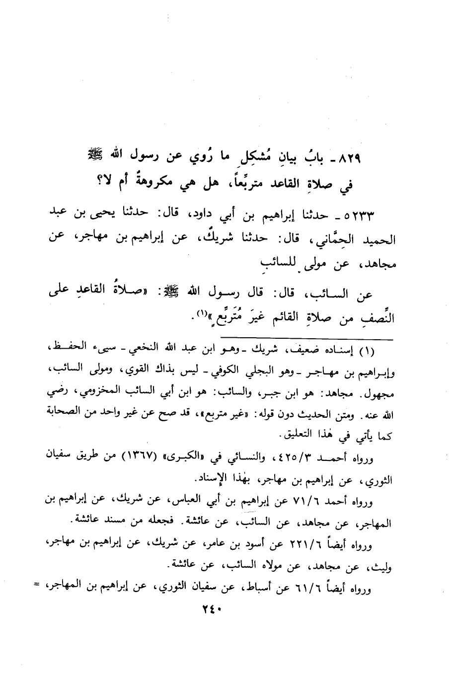 5233 - حَدَّثَنَا إِبْرَاهِيمُ بْنُ أَبِي دَاوُدَ قَالَ: حَدَّثَنَا يَحْيَى بْنُ عَبْدِ الْحَمِيدِ الْحِمَّانِيُّ قَالَ: حَدَّثَنَا شَرِيكٌ، عَنْ إِبْرَاهِيمَ بْنِ مُهَاجِرٍ، عَنْ مُجَاهِدٍ، عَنْ مَوْلًى لِلسَّائِبِ، عَنِ السَّائِبِ قَالَ: قَالَ رَسُولُ اللهِ صَلَّى اللَّهُ عَلَيْهِ وَسَلَّمَ: " صَلَاةُ الْقَاعِدِ عَلَى النِّصْفِ مِنْ صَلَاةِ الْقَائِمِ غَيْرَ مُتَرَبِّعٍ " -[241]- فَفِي هَذَا الْحَدِيثِ مَا يَدُلُّ عَلَى نَقْصِ صَلَاةِ الْقَاعِدِ مُتَرَبِّعًا عَنْ -[242]- صَلَاةِ غَيْرِهِ، قَاعِدًا غَيْرَ مُتَرَبِّعٍ، فَكَانَ هَذَا الْحَدِيثُ عِنْدَنَا مِمَّنْ لَا يُحْتَجُّ بِمِثْلِهِ؛ لِأَنَّ مَوْلَى السَّائِبِ الْمَذْكُورَ فِي إِسْنَادِهِ لَا يُدْرَى مَنْ هُوَ، وَلِأَنَّ إِبْرَاهِيمَ بْنَ الْمُهَاجِرِ لَيْسَ بِالْقَوِيِّ مِنْ رِوَايَتِهِ فَقَالَ قَائِلٌ: فَقَدْ رُوِيَ عَنِ ابْنِ مَسْعُودٍ فِي كَرَاهَةِ التَّرَبُّعِ فِي الصَّلَاةِ