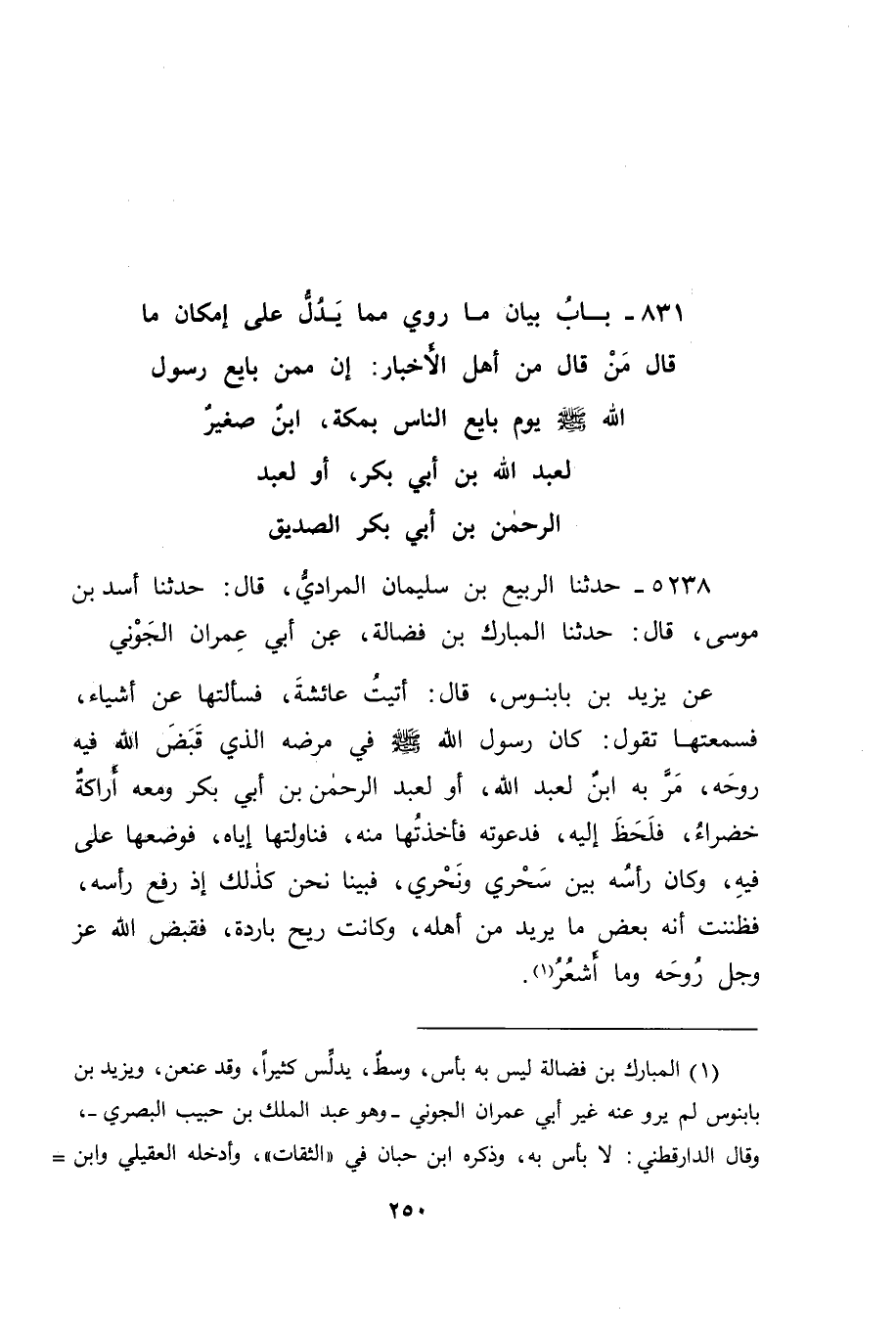 5238 - حَدَّثَنَا الرَّبِيعُ بْنُ سُلَيْمَانَ الْمُرَادِيُّ قَالَ: حَدَّثَنَا أَسَدُ بْنُ مُوسَى قَالَ: حَدَّثَنَا الْمُبَارَكُ بْنُ فَضَالَةَ، عَنْ أَبِي عِمْرَانَ الْجَوْنِيِّ، عَنْ يَزِيدَ بْنِ بَابَنُوسَ قَالَ: أَتَيْتُ عَائِشَةَ، فَسَأَلْتُهَا عَنْ أَشْيَاءَ، فَسَمِعْتُهَا تَقُولُ: " كَانَ رَسُولُ اللهِ صَلَّى اللَّهُ عَلَيْهِ وَسَلَّمَ فِي مَرَضِهِ الَّذِي قَبَضَ اللهُ فِيهِ رُوحَهُ، مَرَّ بِهِ ابْنٌ لِعَبْدِ اللهِ، أَوْ لِعَبْدِ الرَّحْمَنِ بْنِ أَبِي بَكْرٍ، وَمَعَهُ أَرَاكَةٌ خَضْرَاءُ، فَلَحَظَ إِلَيْهِ، فَدَعَوْتُهُ، فَأَخَذْتُهَا مِنْهُ، فَنَاوَلْتُهَا إِيَّاهُ، فَوَضَعَهَا عَلَى فِيهِ، وَكَانَ رَأْسُهُ بَيْنَ سَحْرِي وَنَحْرِي، فَفِينَا نَحْنُ كَذَلِكَ، إِذْ رَفَعَ رَأْسَهُ، فَظَنَنْتُ أَنَّهُ بَعْضُ مَا يُرِيدُ مِنْ أَهْلِهِ، وَكَانَتْ رِيحٌ بَارِدَةٌ، فَقَبَضَ اللهُ عَزَّ وَجَلَّ رُوحَهُ، وَمَا أَشْعُرُ " -[251]- فَعَلِمْنَا بِهَذَا الْحَدِيثِ أَنَّهُ قَدْ كَانَ لِعَبْدِ اللهِ، أَوْ لِعَبْدِ الرَّحْمَنِ حِينَئِذٍ ابْنٌ، وَمُحَالٌ أَنْ يَكُونَ كَانَ حِينَئِذٍ فِي حَالِ مَنْ يَسْعَى، إِلَّا وَسِنُّهُ مُتَقَدِّمَةٌ لَفَتْحِ مَكَّةَ، وَقَدْ كَانَ النَّاسُ بِمَكَّةَ جَاءُوا بِأَبْنَائِهِمُ الَّذِينَ لَمْ يَبْلُغُوا إِلَى رَسُولِ اللهِ صَلَّى اللَّهُ عَلَيْهِ وَسَلَّمَ، حَتَّى بَايَعُوهُ مَعَ آبَائِهِمْ، كَمَا قَدْ بَايَعَهُ قَبْلَ ذَلِكَ مِمَّنْ -[252]- لَمْ يَكُنْ بَلَغَ: عَلِيٌّ، وَالزُّبَيْرُ رَضِيَ اللهُ عَنْهُمَا وَكَانَ ابْنُ عَبْدِ اللهِ، أَوْ عَبْدِ الرَّحْمَنِ بْنِ أَبِي بَكْرٍ فِي ذَلِكَ الْمَعْنَى كَذَلِكَ، وَاللهُ أَعْلَمُ، وَقَدْ كَانَ النَّاسُ يَوْمَئِذٍ يَأْتُونَ رَسُولَ اللهِ صَلَّى اللَّهُ عَلَيْهِ وَسَلَّمَ بِأَبْنَائِهِمْ، فَيَمْسَحُ عَلَى رُءُوسِهِمْ، وَيَدْعُو لَهُمْ