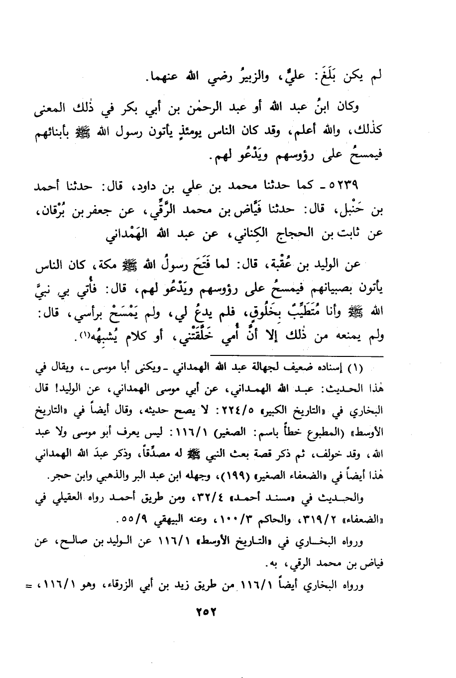 5239 - كَمَا حَدَّثَنَا مُحَمَّدُ بْنُ عَلِيِّ بْنِ دَاوُدَ قَالَ: حَدَّثَنَا أَحْمَدُ بْنُ حَنْبَلٍ قَالَ: حَدَّثَنَا فَيَّاضُ بْنُ مُحَمَّدٍ الرَّقِّيُّ، عَنْ جَعْفَرِ بْنِ بُرْقَانَ، عَنْ ثَابِتِ بْنِ الْحَجَّاجِ الْكِنَانِيِّ، عَنْ عَبْدِ اللهِ الْهَمْدَانِيِّ، عَنِ الْوَلِيدِ بْنِ عُقْبَةَ قَالَ: " لَمَّا فَتَحَ رَسُولُ اللهِ صَلَّى اللَّهُ عَلَيْهِ وَسَلَّمَ مَكَّةَ كَانَ النَّاسُ يَأْتُونَ بِصِبْيَانِهِمْ، فَيَمْسَحُ عَلَى رُءُوسِهِمْ، وَيَدْعُو لَهُمْ قَالَ: فَأُتِيَ بِي نَبِيَّ اللهِ صَلَّى اللَّهُ عَلَيْهِ وَسَلَّمَ، وَأَنَا مُتَطَيِّبٌ بِخَلُوقٍ، فَلَمْ يَدْعُ لِي، وَلَمْ يَمْسَحْ بِرَأْسِي قَالَ: وَلَمْ يَمْنَعْهُ مِنْ ذَلِكَ، إِلَّا أَنَّ أُمِّي خَلَّقَتْنِي، أَوْ كَلَامٌ يُشْبِهُهُ " -[253]- فَكَانَ ابْنُ عَبْدِ اللهِ، أَوْ عَبْدِ الرَّحْمَنِ مِنْ أُولَئِكَ الصِّبْيَانِ، وَقَدْ يُحْتَمَلُ أَنْ يَكُونَ كَانَ قَدْ عَقَلَ الْبَيْعَةَ حِينَئِذٍ كَيْفَ هِيَ؟ فَبَايَعَهُ، فَيَكُونَ ذَلِكَ كَمَا قَدْ قِيلَ فِيهِ، وَيَكُونُ أَبُو بَكْرٍ رَضِيَ اللهُ عَنْهُ، قَدْ تَفَرَّدَ بِالْبَيْعَةِ مِنْ نَفْسِهِ يَوْمَئِذٍ، وَبَالْبَيْعَةِ مِنْ أَبِيهِ، وَبَالْبَيْعَةِ مِنَ ابْنِهِ، وَبَالْبَيْعَةِ مِنَ ابْنِ ابْنِهِ رَسُولَ اللهِ صَلَّى اللَّهُ عَلَيْهِ وَسَلَّمَ عَلَى مَا بَايَعُوهُ عَلَيْهِ يَوْمَئِذٍ، وَلَا نَعْلَمُ ذَلِكَ اجْتَمَعَ لِأَحَدٍ مِنَ النَّاسِ سِوَاهُ رِضْوَانُ اللهِ عَلَيْهِ، وَاللهَ نَسْأَلُهُ التَّوْفِيقَ