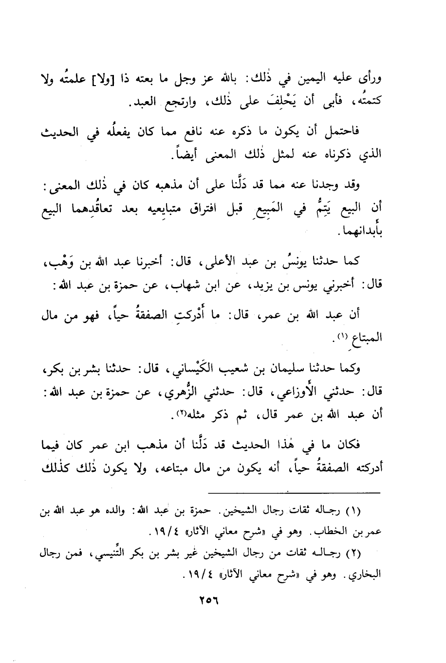 كَمَا حَدَّثَنَا يُونُسُ بْنُ عَبْدِ الْأَعْلَى قَالَ: أَخْبَرَنَا عَبْدُ اللهِ بْنُ وَهْبٍ قَالَ: أَخْبَرَنِي يُونُسُ بْنُ يَزِيدَ، عَنِ ابْنِ شِهَابٍ، عَنْ حَمْزَةَ بْنِ عَبْدِ اللهِ: أَنَّ عَبْدَ اللهِ بْنَ عُمَرَ قَالَ: " مَا أَدْرَكَتِ الصَّفْقَةُ حَيًّا، فَهُوَ مِنْ مَالِ الْمُبْتَاعِ " وَكَمَا حَدَّثَنَا سُلَيْمَانُ بْنُ شُعَيْبٍ الْكَيْسَانِيُّ قَالَ: حَدَّثَنَا بِشْرُ بْنُ بَكْرٍ قَالَ: حَدَّثَنِي الْأَوْزَاعِيُّ قَالَ: حَدَّثَنِي الزُّهْرِيُّ، عَنْ حَمْزَةَ بْنِ عَبْدِ اللهِ: أَنَّ عَبْدَ اللهِ بْنَ عُمَرَ قَالَ: ثُمَّ ذَكَرَ مِثْلَهُ فَكَانَ مَا فِي هَذَا الْحَدِيثِ قَدْ دَلَّنَا أَنَّ مَذْهَبَ ابْنِ عُمَرَ كَانَ فِيمَا أَدْرَكَتْهُ الصَّفْقَةُ حَيًّا، أَنَّهُ يَكُونُ مِنْ مَالِ مُبْتَاعِهِ، وَلَا يَكُونُ ذَلِكَ كَذَلِكَ، -[257]- إِلَّا وَقَدْ وَقَعَ مِلْكُهُ عَلَيْهِ بِالصَّفْقَةِ، وَإِنْ لَمْ يُفَارِقْ بَائِعَهُ بِبَدَنِهِ وَكَانَ حَدِيثُ هُشَيْمٍ عَنْ يَحْيَى الَّذِي ذَكَرْنَاهُ مِنْ قَوْلِ رَسُولِ اللهِ صَلَّى اللَّهُ عَلَيْهِ وَسَلَّمَ: " الْمُتَبَايِعَانِ لَا بَيْعَ بَيْنَهُمَا، حَتَّى يَتَفَرَّقَا، إِلَّا بَيْعَ الْخِيَارِ " غَيْرَ مُخَالِفٍ عِنْدَنَا لِحَدِيثِهِ الْآخَرِ الَّذِي ذَكَرْنَاهُ، وَيَكُونُ مَعْنَى: " لَا بَيْعَ بَيْنَهُمَا حَتَّى يَفْتَرِقَا "؛ أَيْ: لَا بَيْعَ بَيْنَهُمَا، لَا خِيَارَ فِيهِ، حَتَّى يَفْتَرِقَا، فَإِذَا تَفَرَّقَا قَطَعَ ذَلِكَ التَّفَرُّقُ خَيَارَهُمَا فِيهِ، إِلَّا بَيْعَ الْخِيَارِ، بِمَعْنَى: فَإِنَّ الْخِيَارَ يَبْقَى لِصَاحِبِهِ بَعْدَ ذَلِكَ إِلَى الْمُدَّةِ الْمَشْرُوطِ لَهُ الْخِيَارُ فِيهَا وَكَانَ ذَلِكَ التَّفَرُّقُ الْمَذْكُورُ فِي هَذَا الْحَدِيثِ، مِمَّا قَدْ تَنَازَعَ أَهْلُ الْعِلْمِ فِي تَأْوِيلِهِ مَا هُوَ؟ فَقَالَتْ طَائِفَةٌ مِنْهُمْ: هُوَ بَيْنَ قَوْلِ الْبَائِعِ لِلْمُبْتَاعِ: قَدْ بِعْتُكَ، وَقَوْلِ الْمُبْتَاعِ: قَدْ قَبِلْتُ ذَلِكَ مِنْكَ، يَكُونُ لِلْبَائِعِ الرُّجُوعُ عَنْ مَا قَالَ قَبْلَ قَوْلِ الْمُبْتَاعِ لَهُ، قَدْ قَبِلْتُ ذَلِكَ مِنْكَ، وَيَكُونُ لِلْمُبْتَاعِ قَبُولُ ذَلِكَ الْقَوْلِ، مَا لَمْ يُفَارِقِ الْبَائِعَ بِبَدَنِهِ، فَإِنْ فَارَقَهُ بِبَدَنِهِ، لَمْ يَكُنْ لَهُ بَعْدَ ذَلِكَ أَنْ يَقْبَلَ مِنْهُ الْقَوْلَ الَّذِي قَالَهُ لَهُ وَقَالَ قَائِلُو هَذَا الْقَوْلِ: وَلَوْلَا أَنَّ ذَلِكَ كَذَلِكَ، لَكَانَ لَهُ قَبُولُ ذَلِكَ الْقَوْلِ بَعْدَ الْمُدَّةِ الطَّوِيلَةِ، وَبَعْدَ مُفَارَقَتِهِ قَائِلَهُ بِهِ بِبَدَنِهِ، وَمِمَّنْ كَانَ يَقُولُ هَذَا الْقَوْلَ، وَيَذْهَبُ بِمَعْنَى هَذَا الْحَدِيثِ إِلَى ذَلِكَ التَّأْوِيلِ أَبُو يُوسُفَ كَمَا حَدَّثَنَا جَعْفَرُ بْنُ أَحْمَدَ بْنِ الْوَلِيدِ، عَنْ بِشْرِ بْنِ الْوَلِيدِ، عَنْ أَبِي يُوسُفَ، وَذَكَرْنَاهُ بَعْدَ ذَلِكَ لِأَحْمَدَ بْنِ أَبِي عِمْرَانَ، فَوَافَقَهُ عَلَى ذَلِكَ فِي رِوَايَتِهِ إِيَّاهُ عَنْ بِشْرِ بْنِ الْوَلِيدِ، وَوَافَقَ أَبَا يُوسُفَ عَلَى هَذَا التَّأْوِيلِ أَيْضًا عِيسَى بْنُ أَبَانَ -[258]- وَقَالَ آخَرُونَ مِنْ أَهْلِ الْعِلْمِ: إِنَّ قَوْلَ الْبَائِعِ لِلْمُبْتَاعِ: قَدْ بِعْتُكَ، وَقَوْلَ الْمُبْتَاعِ لَهُ: قَدْ قَبِلْتُ مِنْكَ، يَكُونَانِ بِهِ مُفْتَرِقَيْنِ، وَيَكُونُ ذَلِكَ كَمَعْنَى قَوْلِ اللهِ عَزَّ وَجَلَّ فِي الطَّلَاقِ: {وَإِنْ يَتَفَرَّقَا يُغْنِ اللهُ كُلًّا مِنْ سَعَتِهِ} [النساء: 130] ، فَكَأَنَّ الزَّوْجَ إِذَا قَالَ لِامْرَأَتِهِ: قَدْ طَلَّقْتُكِ عَلَى كَذَا، فَقَالَتْ هِيَ لَهُ: قَدْ قَبِلْتُ ذَلِكَ مِنْكَ، صَارَا مُفْتَرِقَيْنِ الْفُرْقَةَ الَّتِي قَالَ اللهُ عَزَّ وَجَلَّ، وَإِنْ لَمْ يَتَفَ