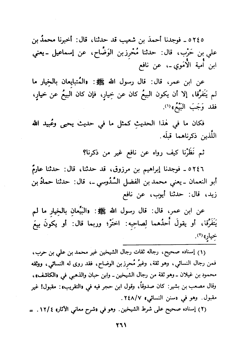 5245 - فَوَجَدْنَا أَحْمَدَ بْنَ شُعَيْبٍ قَدْ حَدَّثَنَا قَالَ: أَخْبَرَنَا مُحَمَّدُ بْنُ عَلِيِّ بْنِ حَرْبٍ قَالَ: حَدَّثَنَا مُحْرِزُ بْنُ الْوَضَّاحِ، عَنْ إِسْمَاعِيلَ يَعْنِي: ابْنَ أُمَيَّةَ الْأُمَوِيَّ، عَنْ نَافِعٍ، عَنِ ابْنِ عُمَرَ قَالَ: قَالَ رَسُولُ اللهِ صَلَّى اللَّهُ عَلَيْهِ وَسَلَّمَ: " الْمُتَبَايِعَانِ بِالْخِيَارِ مَا لَمْ يَتَفَرَّقَا، إِلَّا أَنْ يَكُونَ الْبَيْعُ كَانَ عَنْ خِيَارٍ، فَإِنْ كَانَ الْبَيْعُ عَنْ خِيَارٍ، فَقَدْ وَجَبَ الْبَيْعُ " فَكَانَ مَا فِي هَذَا الْحَدِيثِ كَمِثْلِ مَا فِي حَدِيثِ يَحْيَى، وَعُبَيْدِ اللهِ اللَّذَيْنِ ذَكَرْنَاهُمَا قَبْلَهُ ثُمَّ نَظَرْنَا كَيْفَ رَوَاهُ عَنْ نَافِعٍ غَيْرُ مَنْ ذَكَرْنَا؟