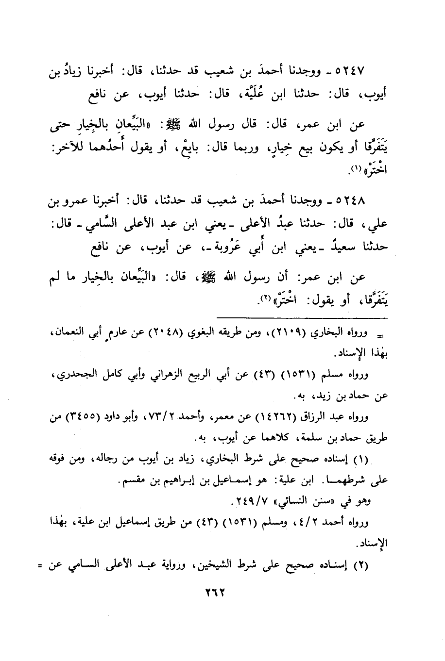 5247 - وَوَجَدْنَا أَحْمَدَ بْنَ شُعَيْبٍ قَدْ حَدَّثَنَا قَالَ: أَخْبَرَنَا زِيَادُ بْنُ أَيُّوبَ قَالَ: حَدَّثَنَا ابْنُ عُلَيَّةَ قَالَ: حَدَّثَنَا أَيُّوبُ، عَنْ نَافِعٍ، عَنِ ابْنِ عُمَرَ قَالَ: قَالَ رَسُولُ اللهِ صَلَّى اللَّهُ عَلَيْهِ وَسَلَّمَ: " الْبَيِّعَانِ بِالْخِيَارِ حَتَّى يَتَفَرَّقَا، أَوْ يَكُونَ بَيْعَ خِيَارٍ "، وَرُبَّمَا قَالَ: " بَايِعْ، أَوْ يَقُولُ أَحَدُهُمَا لِلْآخَرِ: اخْتَرْ "