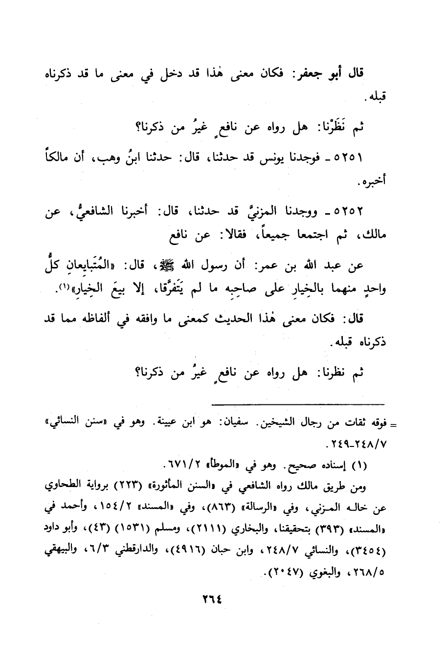 5252 - وَوَجَدْنَا الْمُزَنِيَّ قَدْ حَدَّثَنَا قَالَ: أَخْبَرَنَا الشَّافِعِيُّ، عَنْ مَالِكٍ، ثُمَّ اجْتَمَعَا جَمِيعًا، فَقَالَا: عَنْ نَافِعٍ، عَنْ عَبْدِ اللهِ بْنِ عُمَرَ: أَنَّ رَسُولَ اللهِ صَلَّى اللَّهُ عَلَيْهِ وَسَلَّمَ قَالَ: " الْمُتَبَايِعَانِ كُلُّ وَاحِدٍ مِنْهُمَا بِالْخِيَارِ عَلَى صَاحِبِهِ، مَا لَمْ يَتَفَرَّقَا، إِلَّا بَيْعَ الْخِيَارِ " قَالَ: فَكَانَ مَعْنَى هَذَا الْحَدِيثِ كَمَعْنَى مَا وَافَقَهُ فِي أَلْفَاظِهِ مِمَّا قَدْ ذَكَرْنَاهُ قَبْلَهُ ثُمَّ نَظَرْنَا: هَلْ رَوَاهُ عَنْ نَافِعٍ غَيْرُ مَنْ ذَكَرْنَا؟