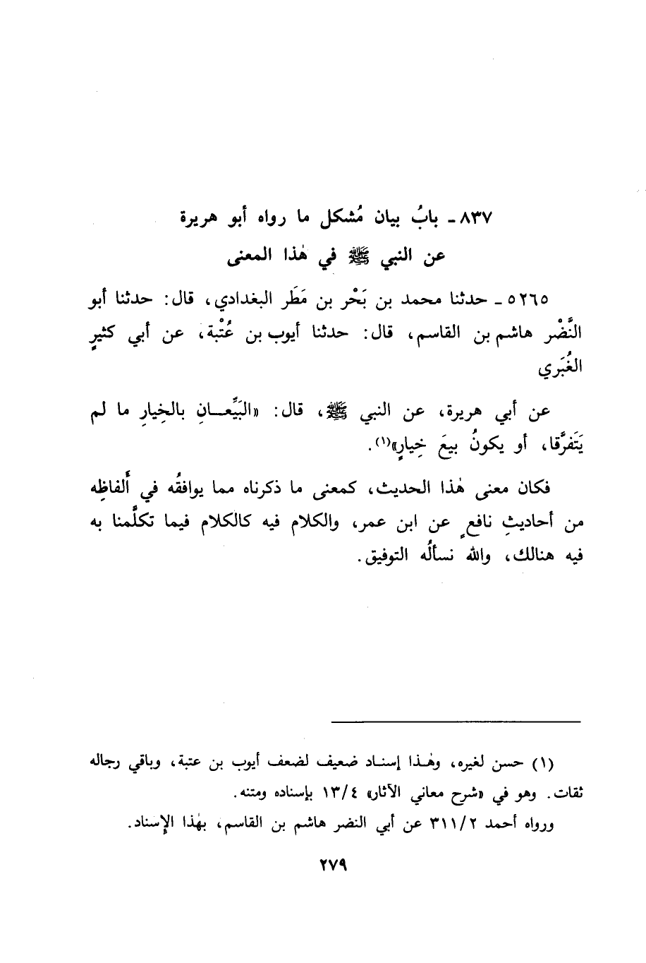 5265 - حَدَّثَنَا مُحَمَّدُ بْنُ بَحْرِ بْنِ مَطَرٍ الْبَغْدَادِيُّ قَالَ: حَدَّثَنَا أَبُو النَّضْرِ هَاشِمُ بْنُ الْقَاسِمِ قَالَ: حَدَّثَنَا أَيُّوبُ بْنُ عُتْبَةَ، عَنْ أَبِي كَثِيرٍ الْغُبَرِيِّ، عَنْ أَبِي هُرَيْرَةَ، عَنِ النَّبِيِّ صَلَّى اللَّهُ عَلَيْهِ وَسَلَّمَ قَالَ: " الْبَيِّعَانِ بِالْخِيَارِ، مَا لَمْ يَتَفَرَّقَا، أَوْ يَكُونُ بَيْعَ خِيَارٍ " فَكَانَ مَعْنَى هَذَا الْحَدِيثِ، كَمَعْنَى مَا ذَكَرْنَاهُ مِمَّا يُوَافِقُهُ فِي أَلْفَاظِهِ مِنْ أَحَادِيثِ نَافِعٍ، عَنِ ابْنِ عُمَرَ، وَالْكَلَامُ فِيهِ كَالْكَلَامِ فِيمَا تَكَلَّمْنَا بِهِ فِيهِ هُنَالِكَ، وَاللهَ نَسْأَلُهُ التَّوْفِيقَ