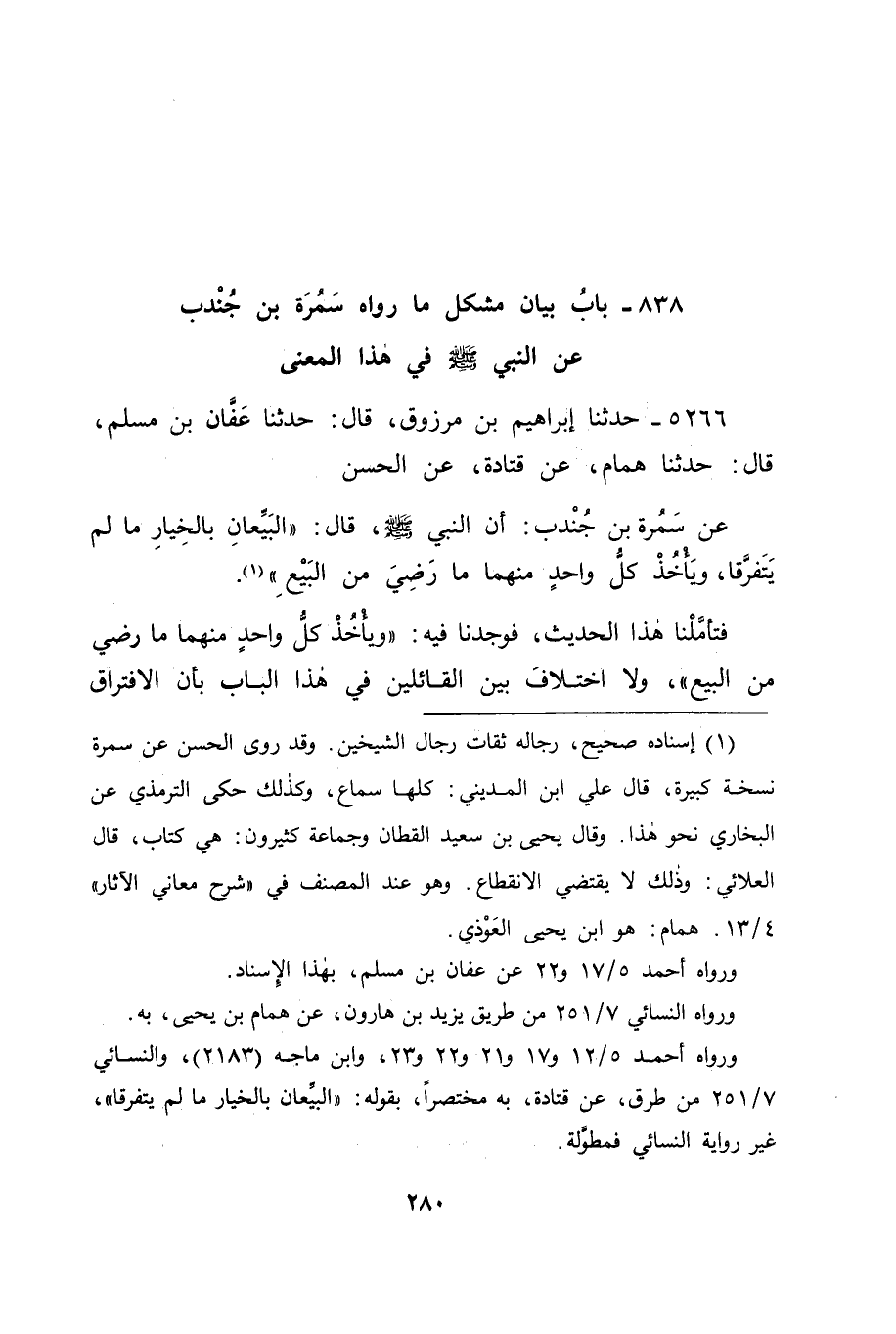 5266 - حَدَّثَنَا إِبْرَاهِيمُ بْنُ مَرْزُوقٍ قَالَ: حَدَّثَنَا عَفَّانُ بْنُ مُسْلِمٍ قَالَ: حَدَّثَنَا هَمَّامٌ، عَنْ قَتَادَةَ، عَنِ الْحَسَنِ، عَنْ سَمُرَةَ بْنِ جُنْدُبٍ: أَنَّ النَّبِيَّ صَلَّى اللَّهُ عَلَيْهِ وَسَلَّمَ قَالَ: " الْبَيِّعَانِ بِالْخِيَارِ مَا لَمْ يَتَفَرَّقَا، وَيَأْخُذُ كُلُّ وَاحِدٍ مِنْهُمَا مَا رَضِيَ مِنَ الْبَيْعِ " فَتَأَمَّلْنَا هَذَا الْحَدِيثَ، فَوَجَدْنَا فِيهِ: " وَيَأْخُذُ كُلُّ وَاحِدٍ مِنْهُمَا مَا رَضِيَ مِنَ الْبَيْعِ "، وَلَا اخْتِلَافَ بَيْنَ الْقَائِلِينَ فِي هَذَا الْبَابِ بِأَنَّ الِافْتِرَاقَ -[281]- الْمَذْكُورَ فِي هَذَا الْحَدِيثِ، هُوَ بَعْدَ الْبَيْعِ بِالْأَبْدَانِ، أَنَّهُ لَيْسَ لِلْمُبْتَاعِ أَنْ يَأْخُذَ مَا رَضِيَ مِنَ الْبَيْعِ، وَيَتْرُكَ بَقِيَّتَهُ، إِنَّمَا لَهُ عِنْدَهُ، أَنْ يَأْخُذَهُ كُلَّهُ، أَوْ يَدَعَهُ كُلَّهُ، وَإِنَّمَا يَأْخُذُ بَعْضَهُ، وَيَتْرُكُ بَعْضَهُ قَبْلَ عَقْدِ الْبَيْعِ، فَيَكُونُ الْبَيْعُ يَنْعَقِدُ بَيْنَهُ وَبَيْنَ صَاحِبِهِ فِيمَا يَرْضَاهُ مِنْهُ، لَا فِيمَا سِوَاهُ مِمَّا لَا يَرْضَاهُ مِنْهُ وَفِي ذَلِكَ مَا قَدْ دَلَّ أَنَّ الْخِيَارَ لِلْمُتَبَايِعَيْنِ قَبْلَ انْعِقَادِ الْبَيْعِ بَيْنَهُمَا، وَهُوَ بَيْنَ قَوْلِ أَحَدِهِمَا لِصَاحِبِهِ: قَدْ بِعْتُكَ، وَقَوْلِ الْآخَرِ: قَدْ قَبِلْتُ مِنْكَ، وَاللهَ نَسْأَلُهُ التَّوْفِيقَ