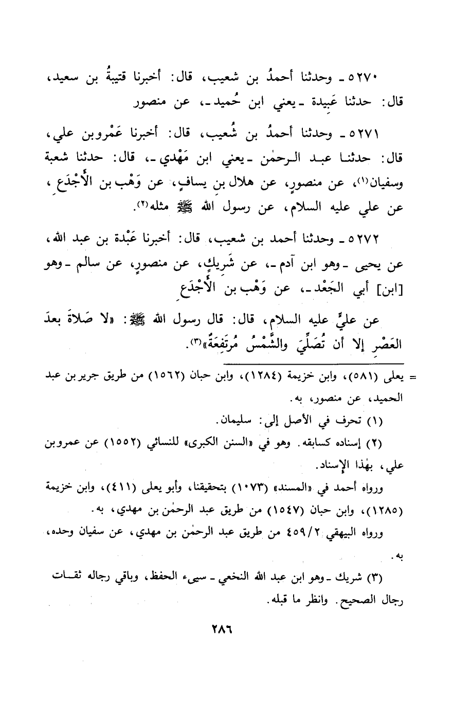 5272 - وَحَدَّثَنَا أَحْمَدُ بْنُ شُعَيْبٍ قَالَ: أَخْبَرَنَا عَبْدَةُ بْنُ عَبْدِ اللهِ، عَنْ يَحْيَى وَهُوَ: ابْنُ آدَمَ، عَنْ شَرِيكٍ، عَنْ مَنْصُورٍ، عَنْ سَالِمٍ وَهُوَ ابْنُ أَبِي الْجَعْدِ، عَنْ وَهْبِ بْنِ الْأَجْدَعِ، عَنْ عَلِيٍّ عَلَيْهِ السَّلَامُ قَالَ: قَالَ رَسُولُ اللهِ صَلَّى اللَّهُ عَلَيْهِ وَسَلَّمَ: " لَا صَلَاةَ بَعْدَ الْعَصْرِ، إِلَّا أَنْ تُصَلِّيَ وَالشَّمْسُ مُرْتَفِعَةٌ " -[287]- قَالَ أَبُو جَعْفَرٍ: فَتَأَمَّلْنَا هَذَا الْحَدِيثَ، فَوَجَدْنَا فِيهِ إِبَاحَةَ رَسُولِ اللهِ صَلَّى اللَّهُ عَلَيْهِ وَسَلَّمَ لِلنَّاسِ الصَّلَاةَ بَعْدَ الْعَصْرِ وَالشَّمْسُ مُرْتَفِعَةٌ، وَهِيَ الْحَالُ الَّتِي تَكُونُ فِيهَا بَيْضَاءَ، لَمْ يَدْخُلْهَا صُفْرَةٌ، وَنَهْيَهُ عَنِ الصَّلَاةِ بَعْدَ الْعَصْرِ فِي غَيْرِ تِلْكَ الْحَالِ، وَهِيَ تَدَلِّي الشَّمْسُ لِلْغُرُوبِ وَهِيَ الْحَالُ الَّتِي يَكُونُ مَعَهَا فِيهَا اصْفِرَارُهَا، وَتَوَرُّدُهَا فَقَالَ قَائِلٌ: فَقَدْ رُوِّيتُمْ عَنْ عُمَرَ رَضِيَ اللهُ عَنْهُ بِمَا كَانَ خَاطِبَ بِهِ عَلِيًّا عَلَيْهِ السَّلَامُ، مَا قَدْ دَلَّ أَنَّ الْأَمْرَ عِنْدَ عَلِيٍّ عَلَيْهِ السَّلَامُ عَنِ النَّبِيِّ صَلَّى اللَّهُ عَلَيْهِ وَسَلَّمَ عَلَى خِلَافِ مَا رُوِّيتُمُوهُ عَنْ عَلِيٍّ عَنْ النَّبِيِّ صَلَّى اللَّهُ عَلَيْهِ وَسَلَّمَ، وَذَكَرَ فِي ذَلِكَ:
