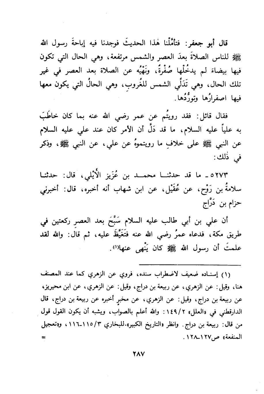 5273 - مَا قَدْ حَدَّثَنَا مُحَمَّدُ بْنُ عَزِيزٍ الْأَيْلِيُّ قَالَ: حَدَّثَنَا سَلَامَةُ بْنُ رَوْحٍ، عَنْ عُقَيْلٍ، عَنِ ابْنِ شِهَابٍ، أَنَّهُ أَخْبَرَهُ قَالَ: أَخْبَرَنِي حِزَامُ بْنُ دَرَّاجٍ: أَنَّ عَلِيَّ بْنَ أَبِي طَالِبٍ عَلَيْهِ السَّلَامُ سَبَّحَ بَعْدَ الْعَصْرِ رَكْعَتَيْنِ فِي طَرِيقِ مَكَّةَ، فَدَعَاهُ عُمَرُ رَضِيَ اللهُ عَنْهُ، فَتَغَيَّظَ عَلَيْهِ، ثُمَّ قَالَ: " وَاللهِ لَقَدْ عَلِمْتَ أَنَّ رَسُولَ اللهِ صَلَّى اللَّهُ عَلَيْهِ وَسَلَّمَ كَانَ يَنْهَى عَنْهَا "