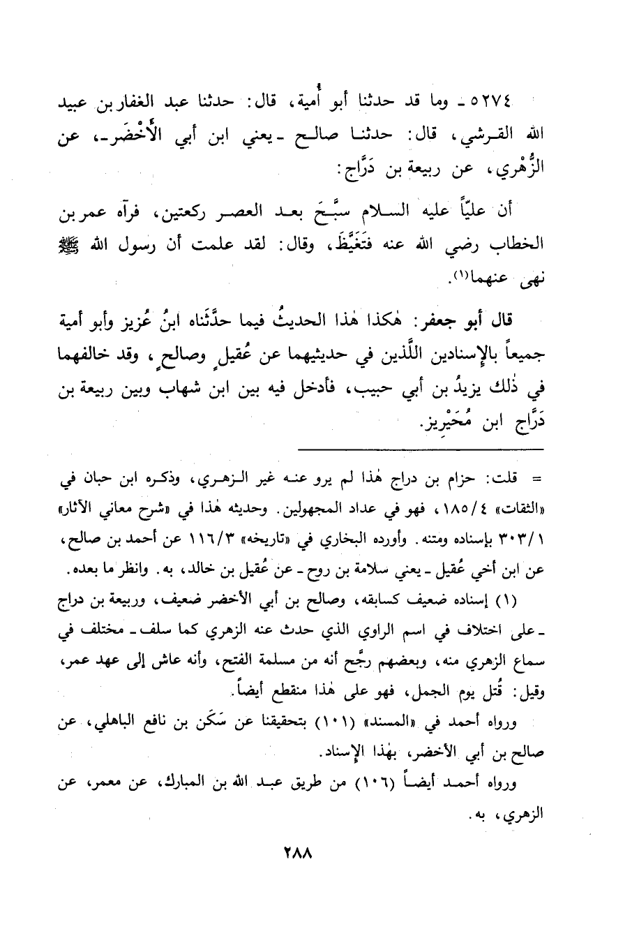 5274 - وَمَا قَدْ حَدَّثَنَا أَبُو أُمَيَّةَ قَالَ: حَدَّثَنَا عَبْدُ الْغَفَّارِ بْنُ عُبَيْدِ اللهِ الْقُرَشِيُّ قَالَ: حَدَّثَنَا صَالِحٌ يَعْنِي: ابْنَ أَبِي الْأَخْضَرِ، عَنِ الزُّهْرِيِّ، عَنْ رَبِيعَةَ بْنِ دَرَّاجٍ: أَنَّ عَلِيٍّا عَلَيْهِ السَّلَامُ سَبَّحَ بَعْدَ الْعَصْرِ رَكْعَتَيْنِ، فَرَآهُ عُمَرُ بْنُ الْخَطَّابِ رَضِيَ اللهُ عَنْهُ، فَتَغَيَّظَ، وَقَالَ: " لَقَدْ عَلِمْتَ أَنَّ رَسُولَ اللهِ صَلَّى اللَّهُ عَلَيْهِ وَسَلَّمَ نَهَى عَنْهُمَا " قَالَ أَبُو جَعْفَرٍ: هَكَذَا هَذَا الْحَدِيثُ فِيمَا حَدَّثَنَاهُ ابْنُ عَزِيزٍ، وَأَبُو أُمَيَّةَ جَمِيعًا بِالْإِسْنَادَيْنِ اللَّذَيْنِ فِي حَدِيثَيْهِمَا، عَنْ عُقَيْلٍ، وَصَالِحٍ، وَقَدْ خَالَفَهُمَا فِي ذَلِكَ يَزِيدُ بْنُ أَبِي حَبِيبٍ، فَأَدْخَلَ فِيهِ بَيْنَ ابْنِ شِهَابٍ، وَبَيْنَ رَبِيعَةَ بْنِ دَرَّاجِ ابْنَ مُحَيْرِيزٍ