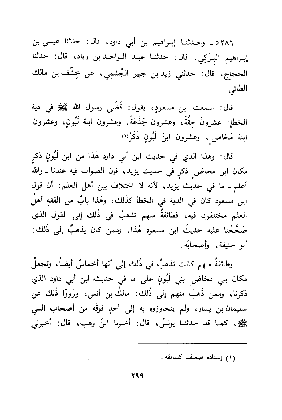 5286 - وَحَدَّثَنَا إِبْرَاهِيمُ بْنُ أَبِي دَاوُدَ قَالَ: حَدَّثَنَا عِيسَى بْنُ إِبْرَاهِيمَ الْبِرَكِيُّ قَالَ: حَدَّثَنَا عَبْدُ الْوَاحِدِ بْنُ زِيَادٍ قَالَ: حَدَّثَنَا الْحَجَّاجُ قَالَ: حَدَّثَنِي زَيْدُ بْنُ جُبَيْرٍ الْجُشَمِيُّ، عَنْ خِشْفِ بْنِ مَالِكٍ الطَّائِيِّ قَالَ: سَمِعْتُ ابْنَ مَسْعُودٍ يَقُولُ: " قَضَى رَسُولُ اللهِ صَلَّى اللَّهُ عَلَيْهِ وَسَلَّمَ فِي دِيَةِ الْخَطَأِ: عِشْرُونَ حِقَّةً، وَعِشْرُونَ جَذَعَةً، وَعِشْرُونَ ابْنَةَ لَبُونٍ، وَعِشْرُونَ ابْنَةَ مَخَاضٍ، وَعِشْرُونَ ابْنَ لَبُونٍ ذَكَرٌ " قَالَ: وَهَذَا الَّذِي فِي حَدِيثِ ابْنِ أَبِي دَاوُدَ هَذَا مِنَ ابْنِ لَبُونٍ ذَكَرٍ مَكَانَ ابْنِ مَخَاضٍ ذَكَرٍ فِي حَدِيثِ يَزِيدَ، فَإِنَّ الصَّوَابَ فِيهِ عِنْدَنَا، وَاللهُ أَعْلَمُ، مَا فِي حَدِيثِ يَزِيدَ؛ لِأَنَّهُ لَا اخْتِلَافَ بَيْنَ أَهْلِ الْعِلْمِ أَنَّ قَوْلَ ابْنِ مَسْعُودٍ كَانَ فِي الدِّيَةِ فِي الْخَطَأِ كَذَلِكَ، وَهَذَا بَابٌ مِنَ الْفِقْهِ أَهْلُ الْعِلْمِ مُخْتَلِفُونَ فِيهِ، فَطَائِفَةٌ مِنْهُمْ تَذْهَبُ فِي ذَلِكَ إِلَى الْقَوْلِ الَّذِي صَحَّحْنَا عَلَيْهِ حَدِيثَ ابْنِ مَسْعُودٍ هَذَا، وَمِمَّنْ كَانَ يَذْهَبُ إِلَى ذَلِكَ: أَبُو حَنِيفَةَ، وَأَصْحَابُهُ، وَطَائِفَةٌ مِنْهُمْ كَانَتْ تَذْهَبُ فِي ذَلِكَ إِلَى أَنَّهَا أَخْمَاسٌ أَيْضًا، وَتَجْعَلُ مَكَانَ ابَنِ مَخَاضٍ ابَنَ لَبُونٍ، عَلَى مَا فِي حَدِيثِ ابْنِ أَبِي دَاوُدَ الَّذِي ذَكَرْنَا، وَمِمَّنْ ذَهَبَ مِنْهُمْ إِلَى ذَلِكَ مَالِكُ بْنُ أَنَسٍ، وَرَوَوْا ذَلِكَ عَنْ سُلَيْمَانَ بْنِ يَسَارٍ، وَلَمْ يَتَجَاوَزُوهُ بِهِ إِلَى أَحَدٍ فَوَقَهُ مِنْ أَصْحَابِ النَّبِيِّ صَلَّى اللَّهُ عَلَيْهِ وَسَلَّمَ كَمَا حَدَّثَنَا يُونُسُ قَالَ: أَخْبَرَنَا ابْنُ وَهْبٍ قَالَ: أَخْبَرَنِي -[300]- مَخْرَمَةُ بْنُ بُكَيْرٍ، عَنْ أَبِيهِ، عَنْ سُلَيْمَانَ بْنِ يَسَارٍ، كَمَا ذَكَرْنَاهُ عَنْهُ وَكَانَ مَا ذَهَبَ إِلَيْهِ أَبُو حَنِيفَةَ، وَأَصْحَابُهُ أَوْلَى فِي ذَلِكَ عِنْدَنَا، لِأَنَّ بَنِي الْمَخَاضِ دُونَ بَنِي اللَّبُونِ، فَكَانَ الْأَوْلَى بِنَا أَنْ لَا نُوجِبَ فِي ذَلِكَ شَيْئًا، إِلَّا مَا قَدْ أَحَطْنَا عِلْمًا بِوُجُوبِهِ، وَقَدْ أَحَطْنَا عِلْمًا بِوُجُوبِ السِّنِّ الْأَدْنَى، وَلَمْ نُحِطْ عِلْمًا بِوُجُوبِ السِّنِّ الْأَعْلَى وَقَدْ كُنَّا ذَكَرْنَا عَنْ رَسُولِ اللهِ صَلَّى اللَّهُ عَلَيْهِ وَسَلَّمَ فِيمَا قَدْ تَقَدَّمَ مِنَّا فِي كِتَابِنَا هَذَا، فِي الدِّيَةِ الْمُغَلَّظَةِ الْوَاجِبَةِ فِي شِبْهِ الْعَمْدِ: أَنَّهَا مِائَةٌ مِنَ الْإِبِلِ، مِنْهَا أَرْبَعُونَ خَلِفَةً، فِي بُطُونِهَا أَوْلَادُهَا، وَكَانَتِ السُّنُونُ الْبَاقِيَةُ مِنْهَا فِي قَوْلِ كُلِّ مَنْ يَذْهَبُ إِلَى هَذَا الْقَوْلِ، مِنْهَا: ثَلَاثُونَ حِقَّةً، وَثَلَاثُونَ جَذَعَةً، وَلِمَا ثَبَتَ عَنْ رَسُولِ اللهِ صَلَّى اللَّهُ عَلَيْهِ وَسَلَّمَ فِيهَا مَا قَدْ ذَكَرْنَا ثُبُوتَهُ عَنْهُ فِيهَا، كَانَ رَسُولُ اللهِ هُوَ الْحُجَّةُ، وَلَمْ يَسَعْ أَحَدًا خِلَافُ مَا قَدْ ثَبَتَ عَنْهُ فِي شَيْءٍ مِنَ الْأَشْيَاءِ، وَكَانَ شِبْهُ الْعَمْدِ أَغْلَظَ مِنَ الْخَطَأِ، لِأَنَّ فِيهِ الْعَمْدُ إِلَى الْقَتْلِ، وَالْخَطَأُ لَيْسَ فِيهِ شَيْءٌ مِنْ ذَلِكَ، فَوَجَبَ بِذَلِكَ أَنْ يَكُونَ الَّذِي يَجِبُ مِنَ الدِّيَةِ فِي الْخَطَأِ أَخَفَّ مِنَ الَّذِي يَجِبُ مِنَ الدِّيَةِ فِي شِبْهِ الْعَمْدِ، فَإِذَا كَانَ الَّذِي يَجِبُ فِي شِبْهِ الْعَمْدِ مِنَ الْإِبِلِ: الْحِقَاقَ، وَالْجَذَاعَ، وَالْخَلِفَاتِ مِنْهَا، كَانَ الَّذِي يَجِبُ فِي الْخَطَأِ أَخَفَّ مِنْهَا فِي ذَلِكَ، وَهُوَ مَا قَدْ رُوِّين