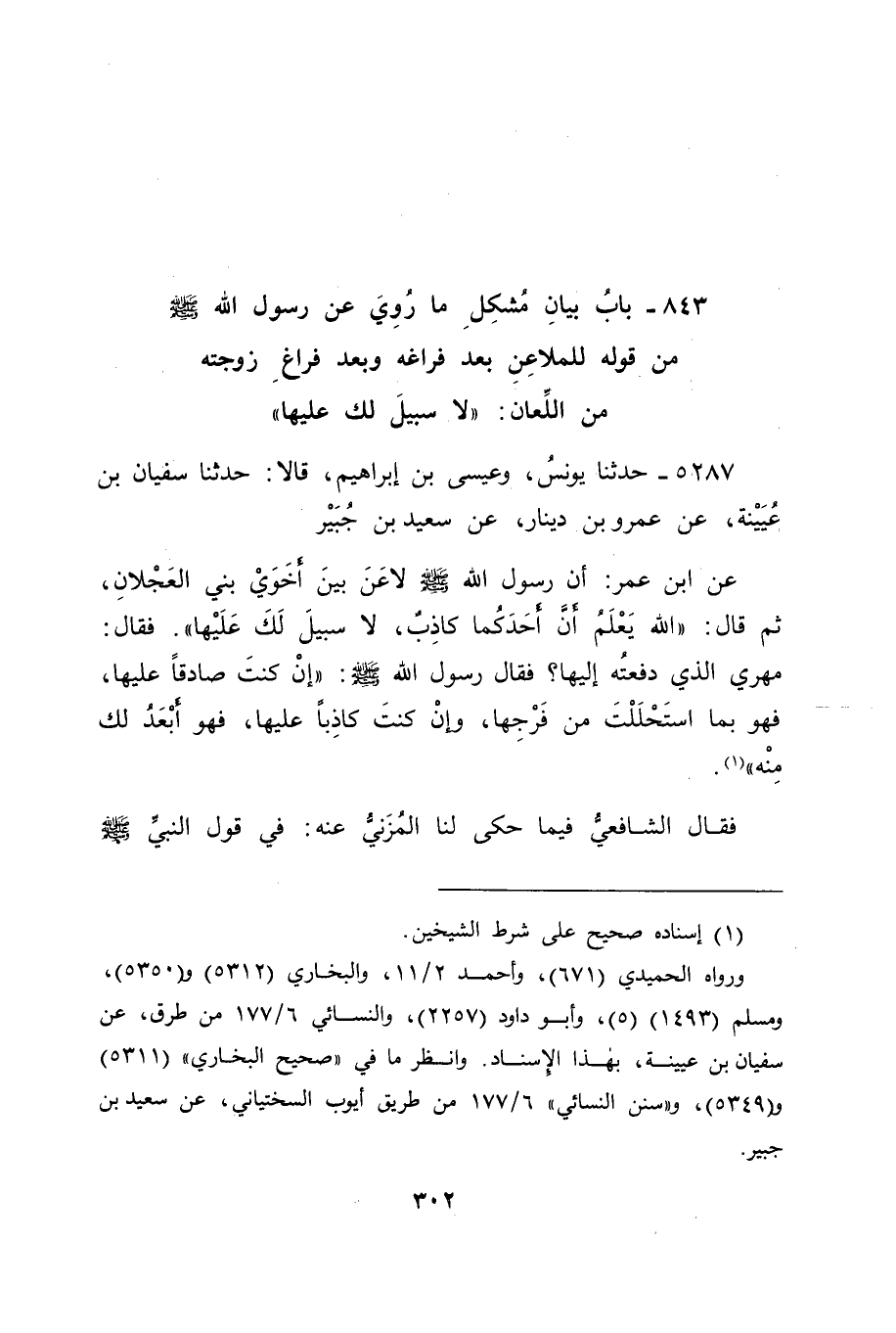 5287 - حَدَّثَنَا يُونُسُ، وَعِيسَى بْنُ إِبْرَاهِيمَ قَالَا: حَدَّثَنَا سُفْيَانُ بْنُ عُيَيْنَةَ، عَنْ عَمْرِو بْنِ دِينَارٍ، عَنْ سَعِيدِ بْنِ جُبَيْرٍ، عَنِ ابْنِ عُمَرَ: أَنَّ رَسُولَ اللهِ صَلَّى اللَّهُ عَلَيْهِ وَسَلَّمَ لَاعَنَ بَيْنَ أَخَوَيْ بَنِي الْعَجْلَانِ، ثُمَّ قَالَ: " اللهُ يَعْلَمُ أَنَّ أَحَدَكُمَا كَاذِبٌ، لَا سَبِيلَ لَكَ عَلَيْهَا " فَقَالَ: مَهْرِيَ الَّذِي دَفَعْتُهُ إِلَيْهَا؟، فَقَالَ رَسُولُ اللهِ صَلَّى اللَّهُ عَلَيْهِ وَسَلَّمَ: " إِنْ كُنْتَ صَادِقًا عَلَيْهَا، فَهُوَ بِمَا اسْتَحْلَلْتَ مِنْ فَرْجِهَا، وَإِنْ كُنْتُ كَاذِبًا عَلَيْهَا، فَهُوَ أَبْعَدُ لَكَ مِنْهُ " فَقَالَ الشَّافِعِيُّ فِيمَا حَكَى لَنَا الْمُزَنِيُّ عَنْهُ: فِي قَوْلِ النَّبِيِّ صَلَّى اللَّهُ عَلَيْهِ وَسَلَّمَ -[303]- لِلْمُلَاعِنِ: " لَا سَبِيلَ لَكَ عَلَيْهَا "، مَا قَدْ دَلَّ أَنَّهُ لَا يَجُوزُ أَنْ يَتَزَوَّجَهَا أَبَدًا وَكَانَتْ هَذِهِ الْمَسْأَلَةُ مِمَّا قَدِ اخْتَلَفَ أَهْلُ الْعِلْمِ فِي الْوَاجِبِ فِيهَا، فَكَانَتْ طَائِفَةٌ مِنْهُمْ تَذْهَبُ إِلَى أَنَّهُ لَا يَتَزَوَّجُهَا أَبَدًا وَمِمَّنْ كَانَ يَذْهَبُ إِلَى ذَلِكَ مِنْهُمْ: مَالِكٌ، وَأَبُو يُوسُفَ وَكَانَتْ طَائِفَةٌ مِنْهُمْ تَذْهَبُ إِلَى أَنَّهُ لَا يَجُوزُ لَهُ أَنْ يَتَزَوَّجَهَا، مَا كَانَ مُقِيمًا عَلَى قَوْلِهِ الَّذِي كَانَ مِنْهُ لَهَا، وَأَنَّهُ مَتَى مَا رَجَعَ عَنْهُ، وَأَكْذَبَ نَفْسَهُ، فَحُدَّ لِذَلِكَ، جَازَ لَهُ أَنْ يَتَزَوَّجَهَا، وَمِمَّنْ كَانَ ذَهَبَ إِلَى ذَلِكَ أَبُو حَنِيفَةَ، وَمُحَمَّدُ بْنُ الْحَسَنِ فَتَأَمَّلْنَا مَا قَالَ الشَّافِعِيُّ فِي ذَلِكَ، فَوَجَدْنَاهُ لَا حُجَّةَ لَهُ فِيهِ، إِذْ كَانَ قَوْلُ النَّبِيِّ صَلَّى اللَّهُ عَلَيْهِ وَسَلَّمَ لِلْمُلَاعِنِ: " لَا سَبِيلَ لَكَ عَلَيْهَا "، إِنَّمَا كَانَ جَوَابًا فِي طَلَبِهِ مِنْهَا الْمَهْرَ الَّذِي كَانَ دَفَعَهُ إِلَيْهَا، فَقَالَ لَهُ النَّبِيِّ صَلَّى اللَّهُ عَلَيْهِ وَسَلَّمَ مِنْ أَجْلِ ذَلِكَ الْقَوْلَ الَّذِي قَالَهُ لَهُ، وَكَانَ هَذَا أَوْلَى بِالْحَدِيثِ، إِذْ كَانَ إِنَّمَا يَدُورُ عَلَى سَعِيدِ بْنِ جُبَيْرٍ، وَإِذْ كَانَ سَعِيدٌ مَذْهَبُهُ فِي الْمُتَلَاعِنَيْنِ