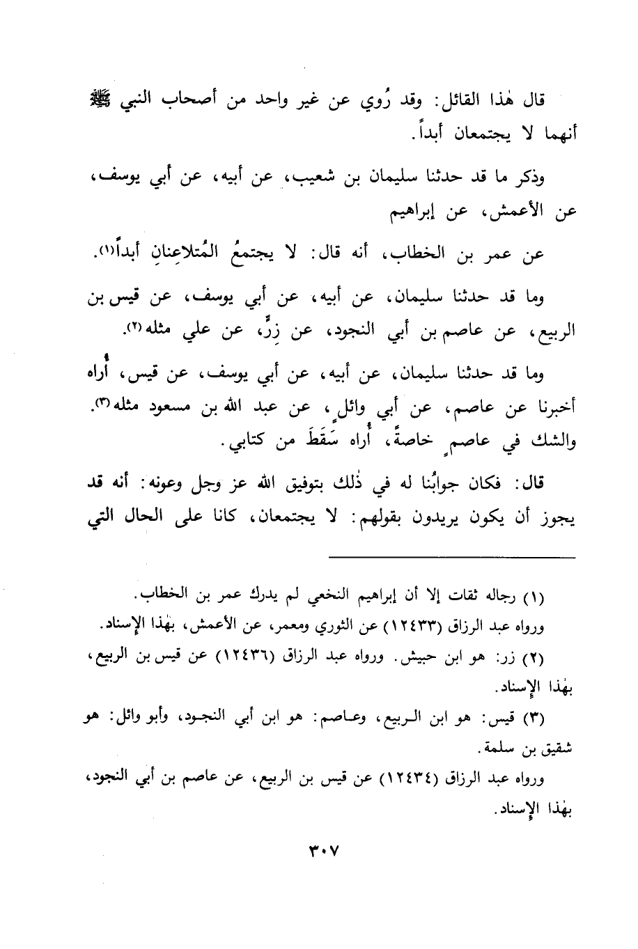 وَذَكَرَ مَا قَدْ حَدَّثَنَا سُلَيْمَانُ بْنُ شُعَيْبٍ، عَنْ أَبِيهِ، عَنْ أَبِي يُوسُفَ، عَنِ الْأَعْمَشِ، عَنْ إِبْرَاهِيمَ، عَنْ عُمَرَ بْنِ الْخَطَّابِ أَنَّهُ قَالَ: " لَا يَجْتَمِعُ الْمُتَلَاعِنَانِ أَبَدًا " وَمَا قَدْ حَدَّثَنَا سُلَيْمَانُ، عَنْ أَبِيهِ، عَنْ أَبِي يُوسُفَ، عَنْ قَيْسِ بْنِ الرَّبِيعِ، عَنْ عَاصِمِ بْنِ أَبِي النَّجُودِ، عَنْ زِرٍّ، عَنْ عَلِيٍّ مِثْلَهُ وَمَا قَدْ حَدَّثَنَا سُلَيْمَانُ، عَنْ أَبِيهِ، عَنْ أَبِي يُوسُفَ، عَنْ قَيْسٍ، أُرَاهُ أَخْبَرَنَا عَنْ عَاصِمٍ، عَنْ أَبِي وَائِلٍ، عَنْ عَبْدِ اللهِ بْنِ مَسْعُودٍ مِثْلَهُ وَالشَّكُّ فِي عَاصِمٍ خَاصَّةً، أُرَاهُ سَقَطَ مِنْ كِتَابِي قَالَ: فَكَانَ جَوَابُنَا لَهُ فِي ذَلِكَ بِتَوْفِيقِ اللهِ عَزَّ وَجَلَّ وَعَوْنِهِ: أَنَّهُ قَدْ يَجُوزُ أَنْ يَكُونَ يُرِيدُونَ بِقَوْلِهِمْ: لَا يَجْتَمِعَانِ، كَانَا عَلَى الْحَالِ الَّتِي -[308]- فُرِّقَ بَيْنَهُمَا عَلَيْهَا، كَمَا حَمَلَ الزُّهْرِيُّ مَعْنَى أَبَدًا عَلَى مِثْلِ ذَلِكَ، فَكَانَ هَذَا الْقَوْلُ أَوْلَى بِالْقِيَاسِ عِنْدَنَا؛ لَأَنَّا قَدْ وَجَدْنَاهُمَا فِي الْبَدْءِ لِلْمَرْأَةِ أَنْ تَطْلُبَ الزَّوْجَ، حَتَّى يُلَاعَنُ بَيْنَهَا وَبَيْنَهُ اللِّعَانَ الَّذِي يُوجِبُ الْفُرْقَةَ بَيْنَهُمَا وَوَجَدْنَا الزَّوْجَ لَوْ أَكْذَبَ نَفْسَهُ، فَحُدَّ فِي ذَلِكَ، ثُمَّ طَلَبَتِ الْمَرْأَةُ فِرَاقَهُ بِقَوْلِهِ الَّذِي كَانَ مِنْهُ لَهَا، لَمْ يَكُنْ لَهَا ذَلِكَ، فَكَانَتِ الْعِلَّةُ الَّتِي لَهَا يُلَاعَنُ بَيْنَهُمَا اللِّعَانَ الَّذِي يَكُونُ عَنْهُ الْفُرْقَةُ بَيْنَهُمَا، هِيَ ثُبُوتُ الزَّوْجِ عَلَى مَا كَانَ مِنْهُ إِلَى زَوْجَتِهِ، وَإِنَّ ذَلِكَ يَزُولُ بِزَوَالِ تِلْكَ الْعِلَّةِ، وَبِإِقَامَةِ الْحَدِّ عَلَيْهِ، فِيمَا يَجِبُ إِقَامَتُهُ عَلَيْهِ، وَيَثْبُتَانِ بَعْدَ ذَلِكَ زَوْجَيْنِ، كَمَا كَانَا قَبْلَ ذَلِكَ الْقَوْلِ، فَكَانَ مِثْلُ ذَلِكَ فِي الْقِيَاسِ، إِذَا فُرِّقَ بَيْنَهُمَا بَعْدَ اللِّعَانِ، أَنْ يَكُونَ ذَلِكَ الْحُكْمَ الْمَانِعَ أَنْ يَجْتَمِعَا قَائِمًا بَيْنَهُمَا، مَا كَانَ مُقِيمًا عَلَى الْقَوْلِ الَّذِي كَانَ يُوجِبُ اللِّعَانَ فِي الْبَدْءِ، حَتَّى تَكُونَ بِهِ الْفُرْقَةُ، وَأَنْ يَكُونَ إِذَا زَالَ ذَلِكَ الْقَوْلُ، وَوَسِعَهُمَا أَنْ يُقِيمَا عَلَى مَا كَانَا عَلَيْهِ قَبْلَ ذَلِكَ الْقَوْلِ فِي الْبَدْءِ أَنْ يَكُونَ بَعْدَ الْفُرْقَةِ أَيْضًا كَذَلِكَ، وَأَنْ يَكُونَ الْمَانِعُ مِنَ الِاجْتِمَاعِ فِي الْمُسْتَأْنَفِ هُوَ الَّذِي كَانَ يُوجِبُ اللِّعَانَ الَّذِي يَكُونُ عَنْهُ ضِدُّ الِاجْتِمَاعِ، وَأَنْ يَكُونَ ذَلِكَ الْمَعْنَى إِذَا زَالَ زَالَ مَا يَمْنَعُهُمَا مِنَ الِاجْتِمَاعِ، وَاللهَ عَزَّ وَجَلَّ نَسْأَلُهُ التَّوْفِيقَ