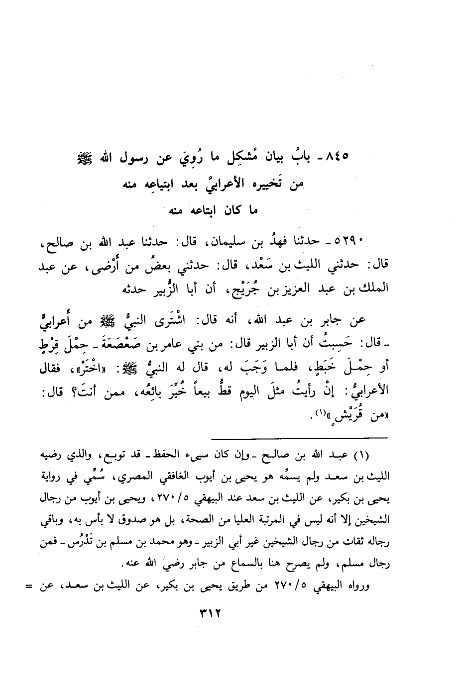 5290 - حَدَّثَنَا فَهْدُ بْنُ سُلَيْمَانَ قَالَ: حَدَّثَنَا عَبْدُ اللهِ بْنُ صَالِحٍ قَالَ: حَدَّثَنِي اللَّيْثُ بْنُ سَعْدٍ قَالَ: حَدَّثَنِي بَعْضُ مَنْ أَرْضَى، عَنْ عَبْدِ الْمَلِكِ بْنِ عَبْدِ الْعَزِيزِ بْنِ جُرَيْجٍ، أَنَّ أَبَا الزُّبَيْرِ، حَدَّثَهُ، عَنْ جَابِرِ بْنِ عَبْدِ اللهِ أَنَّهُ قَالَ: " اشْتَرَى النَّبِيُّ صَلَّى اللَّهُ عَلَيْهِ وَسَلَّمَ مِنْ أَعْرَابِيٍّ، قَالَ: حَسِبْتُ أَنَّ أَبَا الزُّبَيْرِ قَالَ: مِنْ بَنِي عَامِرِ بْنِ صَعْصَعَةَ، حِمْلَ قِرْطٍ، أَوْ حِمْلَ خَبَطٍ، فَلَمَّا وَجَبَ لَهُ قَالَ لَهُ النَّبِيُّ صَلَّى اللَّهُ عَلَيْهِ وَسَلَّمَ: " اخْتَرْ "، فَقَالَ الْأَعْرَابِيُّ: إِنْ رَأَيْتُ مِثْلَ الْيَوْمِ قَطُّ بَيْعًا خُيِّرَ بَائِعُهُ، مِمَّنْ أَنْتَ؟ قَالَ: " مِنْ قُرَيْشٍ " -[313]- قَالَ أَبُو جَعْفَرٍ: وَبَعْضُ النَّاسِ يَزْعُمُ أَنَّ الرَّجُلَ الَّذِي سَكَتَ اللَّيْثُ عَنِ اسْمِهِ فِي هَذَا الْحَدِيثِ هُوَ عَبْدُ اللهِ بْنُ وَهْبٍ، فَكَانَ بَعْضُ النَّاسِ مِمَّنْ يَذْهَبُ إِلَى أَنَّ لِلْمُتَبَايِعَيْنِ الْخِيَارَ، فِيمَا يَتَبَايَعَانِهِ بَعْدَ تَعَاقُدِهِمَا الْبَيْعَ، حَتَّى يَتَفَرَّقَا بَعْدَ الْبَيْعِ، يَحْتَجُّ لِمَا يَقُولُ فِي ذَلِكَ، بِمَا فِي هَذَا الْحَدِيثِ، لِأَنَّ فِي بَعْضِ مَا رُوِيَ فِي ذَلِكَ: أَوْ يَقُولُ أَحَدُهُمَا لِصَاحِبِهِ: اخْتَرْ، اخْتَرْ وَقَدْ ذَكَرْنَا ذَلِكَ، وَمَا قَدْ رُوِيَ فِيهِ، وَمَا قَالَهُ أَهْلُ الْعِلْمِ فِيهِ، فِيمَا تَقَدَّمَ مِنَّا فِي كِتَابِنَا هَذَا، وَكَانَ فِيمَا ذَكَرْنَا مِنْ ذَلِكَ تَحْقِيقُنَا أَنَّ ذَلِكَ التَّخْيِيرَ -[314]- مِمَّا يُعْقَدُ الْبَيْعُ عَلَيْهِ، وَيَنْقَطِعُ بِتَمَامِ الْعِقْدِ، وَاحْتَجَجْنَا لِذَلِكَ بِحَدِيثِ اللَّيْثِ الَّذِي رَوَاهُ فِي ذَلِكَ عَنْ نَافِعٍ، عَنِ ابْنِ عُمَرَ عَنِ النَّبِيِّ صَلَّى اللَّهُ عَلَيْهِ وَسَلَّمَ مِنْ قَوْلِهِ: " أَوْ يُخَيِّرَ أَحَدُهُمَا الْآخَرَ، فَإِذَا خَيَّرَ أَحَدُهُمَا الْآخَرَ وَتَبَايَعَا عَنْ ذَلِكَ، فَقَدْ وَجَبَ الْبَيْعُ " فَحَقَّقْنَا أَنَّ ذَلِكَ التَّخْيِيرَ مِمَّا يُعْقَدُ الْبَيْعُ عَلَيْهِ، لَيْسَ عَلَى تَخْيِيرٍ يَكُونُ مِنْ أَحَدِ الْمُتَبَايِعَيْنِ صَاحِبَهُ بَعْدَ الْبَيْعِ، فَكَانَ مَا فِي هَذَا الْحَدِيثِ الَّذِي رُوِّينَاهُ فِي هَذَا الْبَابِ، فَلَمَّا وَجَبَ يَعْنِي الْمَبِيعَ، قَالَ لَهُ النَّبِيُّ صَلَّى اللَّهُ عَلَيْهِ وَسَلَّمَ يَعْنِي الْأَعْرَابِيَّ: " اخْتَرْ "، فَكَانَ فِي ذَلِكَ مَا قَدْ دَلَّ عَلَى وُجُوبِ الْبَيْعِ بَيْنَهُمَا قَبْلَ ذَلِكَ التَّخْيِيرِ فَقَالَ قَائِلٌ: فَمَا كَانَ مَعْنَى تَخْيِيرِ النَّبِيِّ صَلَّى اللَّهُ عَلَيْهِ وَسَلَّمَ الْمَذْكُورِ فِي هَذَا الْحَدِيثِ لِلْأَعْرَابِيِّ الَّذِي خَيَّرَهُ فِيهِ؟ فَكَانَ جَوَابُنَا لَهُ فِي ذَلِكَ بِتَوْفِيقِ اللهِ عَزَّ وَجَلَّ وَعَوْنِهِ: أَنَّ ذَلِكَ كَانَ مِنَ النَّبِيِّ صَلَّى اللَّهُ عَلَيْهِ وَسَلَّمَ لِلَّذِي قَدْ رَوَاهُ أَبُو هُرَيْرَةَ عَنْهُ