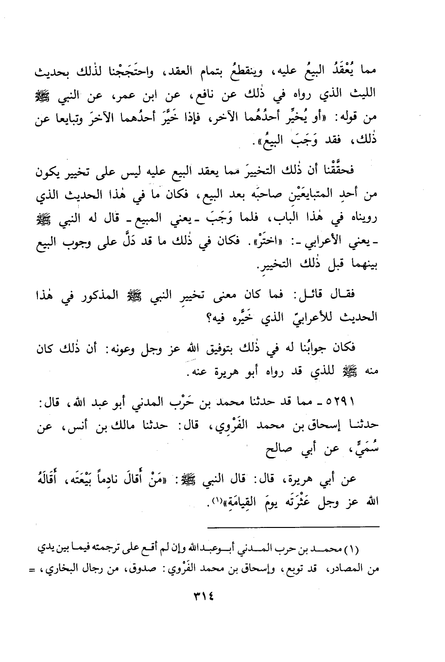 5291 - مِمَّا قَدْ حَدَّثَنَا مُحَمَّدُ بْنُ حَرْبٍ الْمَدَنِيُّ أَبُو عَبْدِ اللهِ قَالَ: حَدَّثَنَا إِسْحَاقُ بْنُ مُحَمَّدٍ الْفَرْوِيُّ قَالَ: حَدَّثَنَا مَالِكُ بْنُ أَنَسٍ، عَنْ سُمَيٍّ، عَنْ أَبِي صَالِحٍ، عَنْ أَبِي هُرَيْرَةَ قَالَ: قَالَ النَّبِيُّ صَلَّى اللَّهُ عَلَيْهِ وَسَلَّمَ: " مَنْ أَقَالَ نَادِمًا بَيْعَتَهُ، أَقَالَهُ اللهُ عَزَّ وَجَلَّ عَثْرَتَهُ يَوْمَ الْقِيَامَةِ " -[316]- فَخَيَّرَ النَّبِيُّ صَلَّى اللَّهُ عَلَيْهِ وَسَلَّمَ ذَلِكَ الْأَعْرَابِيَّ فِيمَا كَانَ ابْتَاعَهُ مِنْهُ لِيَكُونَ لَهُ ثَوَابُ مُقِيلِ نَادِمٍ فِيمَا بَاعَ الْمَذْكُورَ ذَلِكَ الثَّوَابَ فِي هَذَا الْحَدِيثِ إِنْ كَانَ نَادِمًا بَاعَهُ فِيمَا إِيَّاهُ، وَقَدْ رُوِيَ أَنَّ ذَلِكَ الِابْتِيَاعَ الَّذِي كَانَ مِنَ النَّبِيُّ صَلَّى اللَّهُ عَلَيْهِ وَسَلَّمَ لِبَائِعِهِ ذَلِكَ الْمَبِيعَ، كَانَ فِي بَيْعٍ تَبَايَعَاهُ قَبْلَ أَنْ يُبْعَثَ النَّبِيُّ صَلَّى اللَّهُ عَلَيْهِ وَسَلَّمَ، وَقَبْلَ أَنْ يُنَبَّأَ
