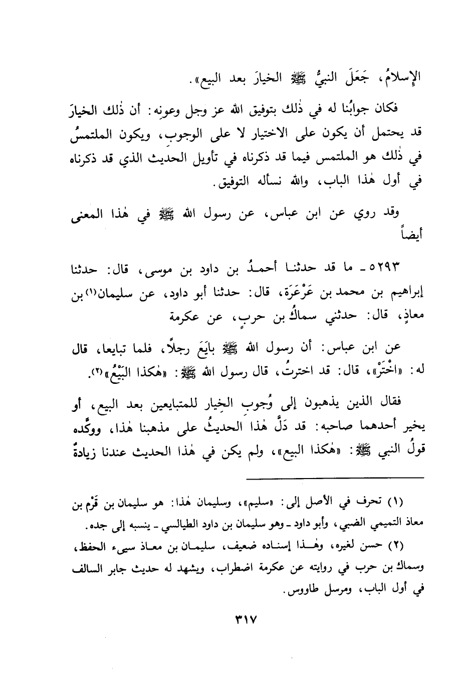 5293 - مَا قَدْ حَدَّثَنَا أَحْمَدُ بْنُ دَاوُدَ بْنِ مُوسَى قَالَ: حَدَّثَنَا إِبْرَاهِيمُ بْنُ مُحَمَّدِ بْنِ عَرْعَرَةَ قَالَ: حَدَّثَنَا أَبُو دَاوُدَ، عَنْ سُلَيْمَانَ بْنِ مُعَاذٍ قَالَ: حَدَّثَنِي سِمَاكُ بْنُ حَرْبٍ، عَنْ عِكْرِمَةَ، عَنِ ابْنِ عَبَّاسٍ: أَنَّ رَسُولَ اللهِ صَلَّى اللَّهُ عَلَيْهِ وَسَلَّمَ بَايَعَ رَجُلًا، فَلَمَّا تَبَايَعَا قَالَ لَهُ: " اخْتَرْ " قَالَ: قَدِ اخْتَرْتُ، قَالَ رَسُولُ اللهِ صَلَّى اللَّهُ عَلَيْهِ وَسَلَّمَ: " هَكَذَا الْبَيْعُ " فَقَالَ الَّذِينَ يَذْهَبُونَ إِلَى وُجُوبِ الْخِيَارِ لِلْمُتَبَايِعَيْنِ بَعْدَ الْبَيْعِ، أَوْ يُخَيِّرُ أَحَدُهُمَا صَاحِبَهُ: قَدْ دَلَّ هَذَا الْحَدِيثُ عَلَى مَذْهَبِنَا هَذَا، وَوَكَّدَهُ قَوْلُ النَّبِيُّ صَلَّى اللَّهُ عَلَيْهِ وَسَلَّمَ: " هَكَذَا الْبَيْعُ "، وَلَمْ يَكُنْ فِي هَذَا الْحَدِيثِ عِنْدَنَا زِيَادَةٌ -[318]- عَلَى مَا ذَكَرْنَاهُ مِنْ مَعْنَى الْحَدِيثِ الْأَوَّلِ، وَكَانَ مَعْنَى قَوْلِهِ صَلَّى اللَّهُ عَلَيْهِ وَسَلَّمَ: " هَكَذَا الْبَيْعُ " مُحْتَمِلًا أَنْ يَكُونَ هَكَذَا الْبَيْعُ الَّذِي يَبِيعُ النَّاسُ، أَنْ يُجْرُوا بِيَاعَاتِهِمْ عَلَيْهِ مِنْ تَخْيِيرِ بَعْضِهِمْ بَعْضًا فِيهَا، حَتَّى يُصِيبُوا بِذَلِكَ الْمَعْنَى الَّذِي فِي حَدِيثِ أَبِي هُرَيْرَةَ الَّذِي ذَكَرْنَاهُ فِي هَذَا الْبَابِ فِي إِقَالَةِ النَّادِمِ بَيْعَتَهُ، وَبِاللهِ التَّوْفِيقُ