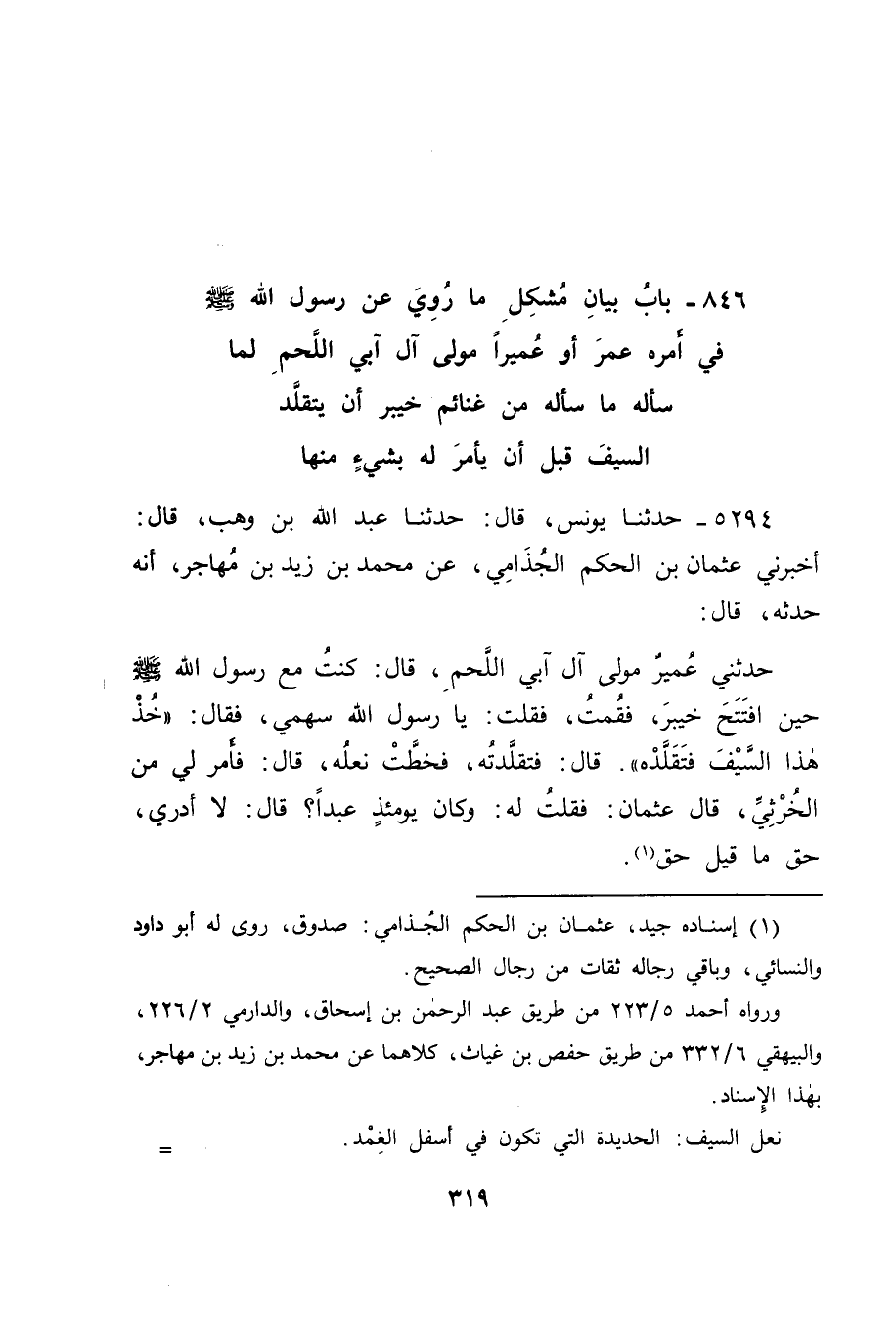 5294 - حَدَّثَنَا يُونُسُ قَالَ: حَدَّثَنَا عَبْدُ اللهِ بْنُ وَهْبٍ قَالَ: أَخْبَرَنِي عُثْمَانُ بْنُ الْحَكَمِ الْجُذَامِيُّ، عَنْ مُحَمَّدِ بْنِ زَيْدِ بْنِ مُهَاجِرٍ أَنَّهُ حَدَّثَهُ قَالَ: حَدَّثَنِي عُمَيْرٌ مَوْلَى آلِ أَبِيِّ اللَّحْمِ قَالَ: " كُنْتُ مَعَ رَسُولِ اللهِ صَلَّى اللَّهُ عَلَيْهِ وَسَلَّمَ حِينَ افْتَتَحَ خَيْبَرَ فَقُمْتُ، فَقُلْتُ: يَا رَسُولَ اللهِ، سَهْمِي، فَقَالَ: " خُذْ هَذَا السَّيْفَ، فَتَقَلَّدْهُ "، قَالَ: فَتَقَلَّدْتُهُ، فَخَطَّتْ نَعْلُهُ، قَالَ: فَأَمَرَ لِي مِنَ الْخُرْثِيِّ " قَالَ عُثْمَانُ: فَقُلْتُ لَهُ: وَكَانَ يَوْمَئِذٍ عَبْدًا؟ قَالَ: " لَا أَدْرِي؛ حَقٌّ مَا قِيلَ حَقٌّ " -[320]- فَفِي هَذَا الْحَدِيثِ: أَنَّ رَسُولَ اللهِ صَلَّى اللَّهُ عَلَيْهِ وَسَلَّمَ أَمَرَ هَذَا الرَّجُلَ الْمَذْكُورَ فِيهِ أَنْ يَتَقَلَّدَ السَّيْفَ، وَأَنَّهُ لَمَّا تَقَلَّدَهُ، خَطَّتْ نَعْلُهُ فِي الْأَرْضِ، فَأَمَرَ لَهُ مِنَ الْخُرْثِيِّ بِمَا أَمَرَ لَهُ بِهِ مِنْهُ فَتَأَمَّلْنَا هَذَا الْحَدِيثَ لِنَقِفَ عَلَى الْمَعْنَى الَّذِي مِنْ أَجْلِهِ أَمَرَ رَسُولُ اللهِ صَلَّى اللَّهُ عَلَيْهِ وَسَلَّمَ أَنْ يَتَقَلَّدَ السَّيْفَ، مَعَ تَرْكِهِ أَمْرَ غَيْرِهِ مِنَ النَّاسِ مِمَّنْ كَانَ مَعَهُ حِينَئِذٍ بِذَلِكَ، لِنَقِفَ عَلَى الْمُرَادِ بِهِ، إِنْ شَاءَ اللهُ، فَنَظَرْنَا: هَلْ كَانَ فِي ذَلِكَ الرَّجُلِ مَعْنًى يَبِينُ بِهِ مِنْ غَيْرِهِ، مِمَّنْ كَانَ حِينَئِذٍ حَاضِرًا لِذَلِكَ الْفَتْحِ؟