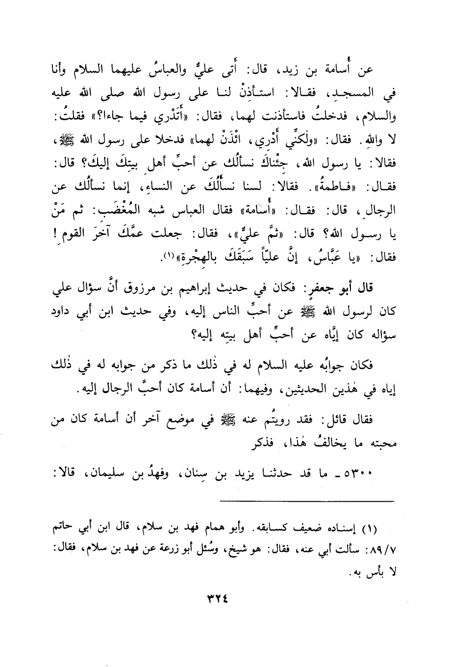 5302 - وَمَا قَدْ حَدَّثَنَا يُوسُفُ بْنُ يَزِيدَ قَالَ: حَدَّثَنَا حَجَّاجُ بْنُ إِبْرَاهِيمَ، ثُمَّ اجْتَمَعَا، فَقَالَ كُلُّ وَاحِدٍ مِنْهُمَا: قَالَ حَدَّثَنَا إِسْمَاعِيلُ بْنُ جَعْفَرٍ، عَنْ عَبْدِ اللهِ بْنِ دِينَارٍ، عَنِ ابْنِ عُمَرَ: أَنَّ رَسُولَ اللهِ صَلَّى اللَّهُ عَلَيْهِ وَسَلَّمَ، ثُمَّ ذَكَرَ هَذَا الْحَدِيثَ -[326]- قَالَ: فَفِي هَذَا الْحَدِيثِ مِنْ قَوْلِ رَسُولِ اللهِ صَلَّى اللَّهُ عَلَيْهِ وَسَلَّمَ: أَنَّ أُسَامَةَ مِنْ أَحَبِّ النَّاسِ إِلَيْهِ، وَفِي الْحَدِيثِ الَّذِي رَوَيْتَهُ قَبْلَهُ أَنَّهُ أَحَبُّ الرِّجَالِ إِلَيْهِ، فَهَذَانِ حَدِيثَانِ مُتَضَادَّانِ فَكَانَ جَوَابُنَا لَهُ فِي ذَاكَ بِتَوْفِيقِ اللهِ عَزَّ وَجَلَّ وَعَوْنِهِ: أَنَّهُمَا لَيْسَا بِمُتَضَادَّيْنِ كَمَا ظَنَّ؛ لِأَنَّ الْحَدِيثَ الْأَوَّلَ إِنَّمَا كَانَ فِيهِ سُؤَالُ عَلِيٍّ رَسُولَ اللهِ صَلَّى اللَّهُ عَلَيْهِ وَسَلَّمَ عَنْ أَحَبِّ النَّاسِ إِلَيْهِ، وَعَنْ أَحَبِّ أَهْلِ بَيْتِهِ إِلَيْهِ، وَإِخْبَارِهِ إِيَّاهُ جَوَابًا لَهُ أَنَّهُ فَاطِمَةُ وَفِي الْحَدِيثِ الثَّانِي قَوْلُ رَسُولِ اللهِ صَلَّى اللَّهُ عَلَيْهِ وَسَلَّمَ فِي أُسَامَةَ: " أَنَّهُ مِنْ أَحَبِّ النَّاسِ إِلَيْهِ "، وَالنَّاسُ فِيهِمْ فَاطِمَةُ، فَلَمَّا كَانَتْ فَاطِمَةُ عَلَيْهَا السَّلَامُ فِي مَحَبَّتِهِ عَلَيْهِ السَّلَامُ فَوْقَ أُسَامَةَ مِنْ مَحَبَّتِهِ، كَانَ مَوْضِعُ أُسَامَةَ مِنْ مَحَبَّتِهِ دُونَ ذَلِكَ، فَكَانَ مِنْ أَحَبِّ النَّاسِ إِلَيْهِ إِذَا كَانَ فِي النَّاسِ النِّسَاءُ وَالرِّجَالُ، وَكَانَ أَحَبَّ الرِّجَالِ إِلَيْهِ، إِذْ لَيْسَتْ فَاطِمَةُ مِنَ الرِّجَالِ، وَلَكِنَّهَا مِنَ النِّسَاءِ، وَفِي ذَلِكَ مَا قَدْ دَلَّ عَلَى أَنْ لَا تَضَادَ فِي وَاحِدٍ مِنْ هَذَيْنِ الْحَدِيثَيْنِ لِلْآخَرِ مِنْهُمَا قَالَ: فَقَدْ رُوِّيتُمْ مِنْ جَوَابِهِ كَانَ لِعَمْرِو بْنِ الْعَاصِ لَمَّا سَأَلَهُ عَنْ أَحَبِّ النَّاسِ إِلَيْهِ، فَذَكَرَ: