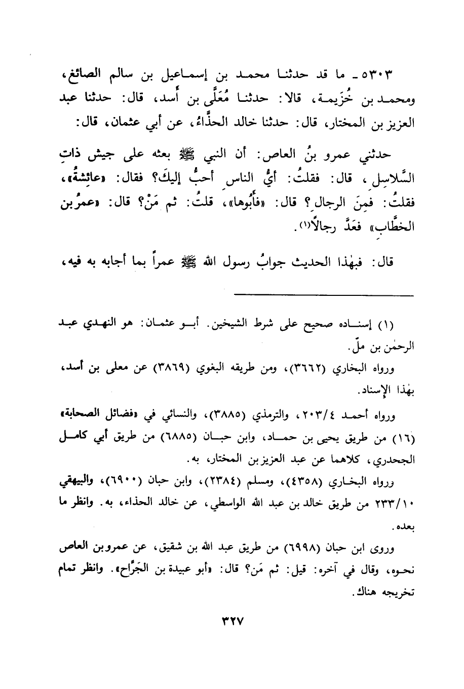 5303 - مَا قَدْ حَدَّثَنَا مُحَمَّدُ بْنُ إِسْمَاعِيلَ بْنِ سَالِمٍ الصَّائِغُ، وَمُحَمَّدُ بْنُ خُزَيْمَةَ قَالَا: حَدَّثَنَا مُعَلَّى بْنُ أَسَدٍ قَالَ: حَدَّثَنَا عَبْدُ الْعَزِيزِ بْنُ الْمُخْتَارِ قَالَ: حَدَّثَنَا خَالِدٌ الْحَذَّاءُ، عَنْ أَبِي عُثْمَانَ قَالَ: حَدَّثَنِي عَمْرُو بْنُ الْعَاصِ: " أَنَّ النَّبِيَّ صَلَّى اللَّهُ عَلَيْهِ وَسَلَّمَ بَعَثَهُ عَلَى جَيْشِ ذَاتِ السَّلَاسِلِ، قَالَ: فَقُلْتُ: أَيُّ النَّاسِ أَحَبُّ إِلَيْكَ؟ فَقَالَ: " عَائِشَةُ "، فَقُلْتُ: فَمِنَ الرِّجَالِ؟ قَالَ: " فَأَبُوهَا "، قُلْتُ: ثُمَّ مَنْ؟ قَالَ: " عُمَرُ بْنُ الْخَطَّابِ "، فَعَدَّ رِجَالًا " قَالَ: فَبِهَذَا الْحَدِيثِ جَوَابُ رَسُولِ اللهِ صَلَّى اللَّهُ عَلَيْهِ وَسَلَّمَ عَمْرًا بِمَا أَجَابَهُ بِهِ فِيهِ، -[328]- وَهُوَ خِلَافُ مَا أَجَابَ بِهِ عَلِيًّا فِي حَدِيثِ أُسَامَةَ الَّذِي قَدْ ذَكَرْتَهُ فِي هَذَا الْبَابِ وَذَكَرَ فِي ذَلِكَ أَيْضًا
