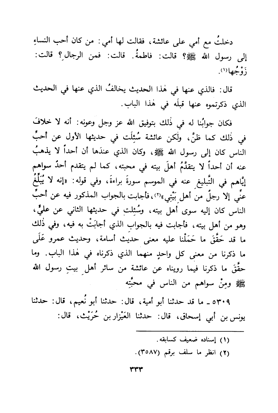 5309 - مَا قَدْ حَدَّثَنَا أَبُو أُمَيَّةَ قَالَ: حَدَّثَنَا أَبُو نُعَيْمٍ قَالَ: حَدَّثَنَا يُونُسُ بْنُ أَبِي إِسْحَاقَ قَالَ: حَدَّثَنَا الْعَيْزَارُ بْنُ حُرَيْثٍ قَالَ: -[334]- قَالَ النُّعْمَانُ بْنُ بَشِيرٍ: " اسْتَأْذَنَ أَبُو بَكْرٍ رَضِيَ اللهُ عَنْهُ عَلَى رَسُولِ اللهِ صَلَّى اللَّهُ عَلَيْهِ وَسَلَّمَ، فَسَمِعَ صَوْتَ عَائِشَةَ تَقُولُ: وَاللهِ لَقَدْ عَرَفْتُ أَنَّ عَلِيًّا أَحَبَّ إِلَيْكَ مِنْ أَبِي، مَرَّتَيْنِ أَوْ ثَلَاثًا، فَاسْتَأْذَنَ أَبُو بَكْرٍ رَضِيَ اللهُ عَنْهُ، فَدَخَلَ، فَأَهْوَى إِلَيْهَا، وَقَالَ: يَا بِنْتَ فُلَانَةَ، أَلَا أَسْمَعُكِ تَرْفَعِينَ صَوْتَكِ عَلَى رَسُولِ اللهِ صَلَّى اللَّهُ عَلَيْهِ وَسَلَّمَ " فَكَانَ فِي هَذَا الْحَدِيثِ وُقُوفُ رَسُولِ اللهِ صَلَّى اللَّهُ عَلَيْهِ وَسَلَّمَ عَلَى مَا قَالَتْ عَائِشَةُ مِنْ ذَلِكَ، فَلَمْ يُنْكِرْهُ عَلَيْهَا، وَخَرَجَ جَمِيعُ مَعَانِي كُلِّ مَا رُوِّينَاهُ فِي هَذَا الْبَابِ خُرُوجًا لَا تَضَادَ فِيهِ، وَلَمْ يَكُنْ مَا ذَكَرْنَاهُ مِنْ تَقْدِيمِ عَلِيٍّ عَلَيْهِ السَّلَامُ فِي مَحَبَّةِ رَسُولِ اللهِ صَلَّى اللَّهُ عَلَيْهِ وَسَلَّمَ أَبَا بَكْرٍ فِيهَا، بِمَانِعٍ أَنْ يَكُونَ أَبُو بَكْرٍ يَتَقَدَّمُهُ بِالْفَضْلِ عِنْدَ رَسُولِ اللهِ صَلَّى اللَّهُ عَلَيْهِ وَسَلَّمَ، وَلَكِنَّ كُلَّ وَاحِدٍ مِنْهُمَا لَهُ مَوْضِعُهُ مِنْ رَسُولِ اللهِ صَلَّى اللَّهُ عَلَيْهِ وَسَلَّمَ مِنْ مَحَبَّةٍ، وَمِنْ فَضْلٍ، رِضْوَانُ اللهِ عَلَيْهِمَا، وَعَلَى سَائِرِ أَصْحَابِهِ سِوَاهُمَا، وَاللهَ نَسْأَلُهُ التَّوْفِيقَ