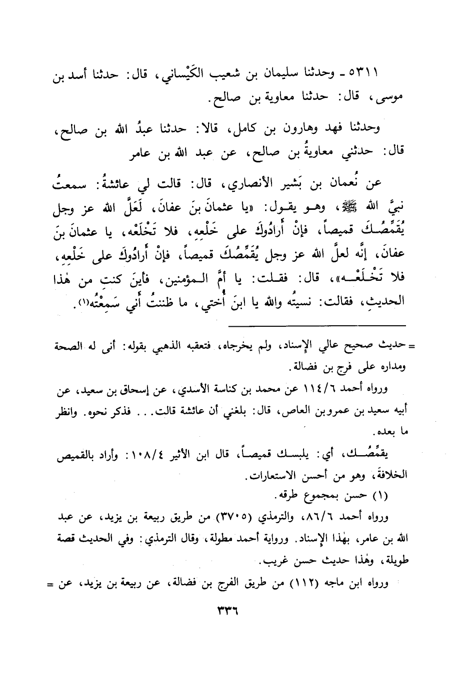 5311 - وَحَدَّثَنَا سُلَيْمَانُ بْنُ شُعَيْبٍ الْكَيْسَانِيُّ قَالَ: حَدَّثَنَا أَسَدُ بْنُ مُوسَى قَالَ: حَدَّثَنَا مُعَاوِيَةُ بْنُ صَالِحٍ، وَحَدَّثَنَا فَهْدٌ، وَهَارُونُ بْنُ كَامِلٍ قَالَا: حَدَّثَنَا عَبْدُ اللهِ بْنُ صَالِحٍ قَالَ: حَدَّثَنِي مُعَاوِيَةُ بْنُ صَالِحٍ، عَنْ عَبْدِ اللهِ بْنِ عَامِرٍ، عَنْ نُعْمَانَ بْنِ بَشِيرٍ الْأَنْصَارِيِّ قَالَ: قَالَتْ لِي عَائِشَةُ: " سَمِعْتُ رَسُولَ اللهِ صَلَّى اللَّهُ عَلَيْهِ وَسَلَّمَ وَهُوَ يَقُولُ: " يَا عُثْمَانَ بْنَ عَفَّانَ، لَعَلَّ اللهَ عَزَّ وَجَلَّ يُقَمِّصُكَ قَمِيصًا، فَإِنْ أَرَادُوكَ عَلَى خَلْعِهِ، فَلَا تَخْلَعْهُ، يَا عُثْمَانَ بْنَ عَفَّانَ، إِنَّهُ لَعَلَّ اللهَ عَزَّ وَجَلَّ يُقَمِّصُكَ قَمِيصًا، فَإِنْ أَرَادُوكَ عَلَى خَلْعِهِ، فَلَا تَخْلَعْهُ " قَالَ: فَقُلْتُ: يَا أُمَّ الْمُؤْمِنِينَ، فَأَيْنَ كُنْتِ مِنْ هَذَا الْحَدِيثِ، فَقَالَتْ: نَسِيتُ وَاللهِ يَا ابْنَ أُخْتِي، مَا ظَنَنْتُ أَنِّي سَمِعْتُهُ " -[337]- فَتَأَمَّلْنَا هَذَا الْحَدِيثَ، فَوَجَدْنَا بَيْعَةَ عُثْمَانَ رَضِيَ اللهُ عَنْهُ، قَدْ كَانَتْ بَيْعَةَ هُدًى، وَرُشْدٍ، وَاسْتِقَامَةً، وَاتِّفَاقٍ مِنَ الْمُهَاجِرِينَ، وَالْأَنْصَارِ، وَأَصْحَابِ رَسُولِ اللهِ صَلَّى اللَّهُ عَلَيْهِ وَسَلَّمَ سِوَاهُمْ عَلَيْهَا، لَمْ يَتَنَازَعُوا فِي ذَلِكَ، وَلَمْ يَخْتَلِفُوا فِيهِ، وَجَرَى الْأَمْرُ لَهُ رِضْوَانُ اللهِ عَلَيْهِ عَلَى ذَلِكَ مَا شَاءَ اللهُ أَنْ يَجْرِيَ لَهُ مِنْ مُدَّةِ خِلَافَتِهِ، ثُمَّ وَقَعَ بَيْنَ النَّاسِ فِي أَمْرِهِ مَا وَقَعَ مِنَ الِاخْتِلَافِ، وَادَّعَى بَعْضُهُمْ عَلَيْهِ التَّبْدِيلَ، وَالتَّغْيِيرَ لِمَا كَانَ عَلَيْهِ قَبْلَ ذَلِكَ، وَحَاشَ لِلَّهِ عَزَّ وَجَلَّ أَنْ يَكُونَ كَانَ ذَلِكَ كَذَلِكَ، حَتَّى كَانَ سَبَبًا لَتَحَزُّبِهِمْ عَلَيْهِ فِي أَمْرِهِ، وَاخْتِلَافِهِمْ عَلَيْهِ فِيهِ، وَحَتَّى هَمَّ بَعْضُهُمْ بِإِزَالَتِهِ عَنْ ذَلِكَ لِدَعْوَاهُ عَلَيْهِ الْخُرُوجَ عَنْهُ بِالْأَحْدَاثِ الَّتِي ادَّعَوْا عَلَيْهِ أَنَّهُ أَحْدَثَهَا، مِمَّا لَا يَصْلُحُ مَعَهَا بَقَاؤُهُ عَلَيْهَا، وَكَانَ مَا تَقَدَّمَ مِنْ رَسُولِ اللهِ صَلَّى اللَّهُ عَلَيْهِ وَسَلَّمَ فِي أَمْرِهِ، مِمَّا خَاطَبَهُ بِهِ فِي عَهْدِهِ إِلَيْهِ فِي ذَلِكَ الْأَمْرِ، مِمَّا أَطْلَعَهُ اللهُ عَزَّ وَجَلَّ عَلَيْهِ مِنْهُ، مَا قَدْ رُوِّينَاهُ فِي هَذَا الْحَدِيثِ دَلِيلًا عَلَى أَنَّ أَحْوَالَهُ رِضْوَانُ اللهِ عَلَيْهِ حِينَئِذٍ هِيَ الْأَحْوَالُ الَّتِي اسْتَحَقَّ بِهَا مَا اسْتَحَقَّ مِنَ الْخِلَافَةِ فِي بَدْءِ أَمْرِهِ، وَفِي اجْتِمَاعِ النَّاسِ عَلَى ذَلِكَ لَهُ، لَمْ يَتَغَيَّرْ عَنْ ذَلِكَ، وَلَمْ يَحُلْ عَنْهُ إِلَى مَا سِوَاهُ، لِأَنَّهُ لَوْ كَانَ قَدْ تَغَيَّرَ عَنْ ذَلِكَ، وَحَالَ عَنْهُ إِلَى -[338]- مَا سِوَاهُ، مِمَّا ادُّعِيَ عَلَيْهِ لَخَرَجَ بِذَلِكَ، مِمَّا كَانَ قَدْ وَجَبَتْ لَهُ وِلَايَتُهُ بِمَا كَانَ عَلَيْهِ مِنَ الْأَسْبَابِ الْمُوجِبَةِ لَهُ، لَمَا أَمَرَهُ رَسُولُ اللهِ صَلَّى اللَّهُ عَلَيْهِ وَسَلَّمَ بِالتَّمَسُّكِ بِالْخِلَافَةِ الَّتِي كَانَ عَلَيْهَا، وَلَأَمَرَهُ بِرَدِّهِ إِيَّاهَا إِلَى مِنْ سِوَاهُ، مِمَّنْ يَسْتَحِقُّهَا، لِأَنَّ اللهَ تَبَارَكَ وَتَعَالَى، قَدْ كَانَ أَعْلَمَهُ مَا كَانَ يَنْزِلُ بِهِ، وَمَا كَانَ يَطْلَبُ مِنْ أَجْلِهِ تَرْكُ الْخِلَافَةِ الَّتِي قَدْ كَانَتْ إِلَيْهِ قَبْلَ ذَلِكَ، مِمَّا كَانَ اسْتِحْقَاقُهُ إِيَّاهَا بِالْأَسْبَابِ الَّتِي كَانَتْ فِيهِ، وَفِي أَمْرهِِ رَسُولُ اللهِ صَلَّى اللَّهُ عَلَيْهِ وَسَلَّمَ إِيَّاهُ بِلُزُومِهَا، وَبِالتَّمَسُّكِ بِهَا
