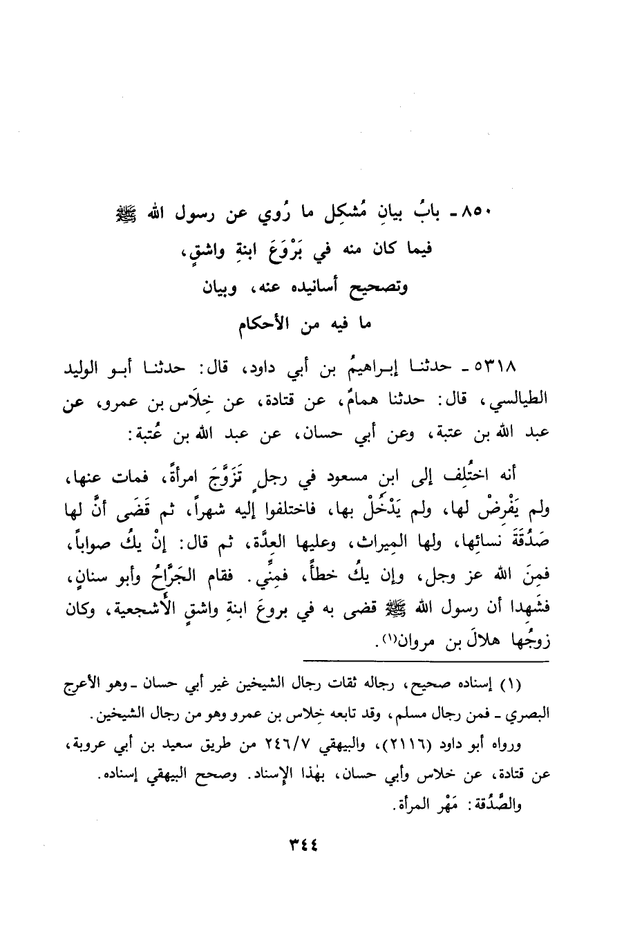5318 - حَدَّثَنَا إِبْرَاهِيمُ بْنُ أَبِي دَاوُدَ قَالَ: حَدَّثَنَا أَبُو الْوَلِيدِ الطَّيَالِسِيُّ قَالَ: حَدَّثَنَا هَمَّامٌ، عَنْ قَتَادَةَ، عَنْ خِلَاسِ بْنِ عَمْرٍو، عَنْ عَبْدِ اللهِ بْنِ عُتْبَةَ، وَعَنْ أَبِي حَسَّانَ، عَنْ عَبْدِ اللهِ بْنِ عُتْبَةَ: " أَنَّهُ اخْتَلَفَ إِلَى ابْنِ مَسْعُودٍ فِي رَجُلٍ تَزَوَّجَ امْرَأَةً، فَمَاتَ عَنْهَا، وَلَمْ يَفْرِضْ لَهَا، وَلَمْ يَدْخُلْ بِهَا، فَاخْتَلَفُوا إِلَيْهِ شَهْرًا، ثُمَّ قَضَى أَنَّ لَهَا صَدَقَةَ نِسَائِهَا، وَلَهَا الْمِيرَاثُ، وَعَلَيْهَا الْعِدَّةُ، ثُمَّ قَالَ: إِنْ يَكُ صَوَابًا، فَمِنَ اللهِ عَزَّ وَجَلَّ، وَإِنْ يَكُ خَطَأً، فَمِنِّي "، فَقَامَ الْجَرَّاحُ، وَأَبُو سِنَانٍ، فَشَهِدَا أَنَّ رَسُولَ اللهِ صَلَّى اللَّهُ عَلَيْهِ وَسَلَّمَ قَضَى بِهِ فِي بَرْوَعَ ابْنَةِ وَاشِقٍ الْأَشْجَعِيَّةِ، وَكَانَ زَوْجُهَا هِلَالَ بْنَ مَرْوَانَ " -[345]- قَالَ أَبُو جَعْفَرٍ: وَلَا نَعْلَمُ أَحَدًا خَالَفَ هَمَّامًا فِي إِسْنَادِ هَذَا الْحَدِيثِ