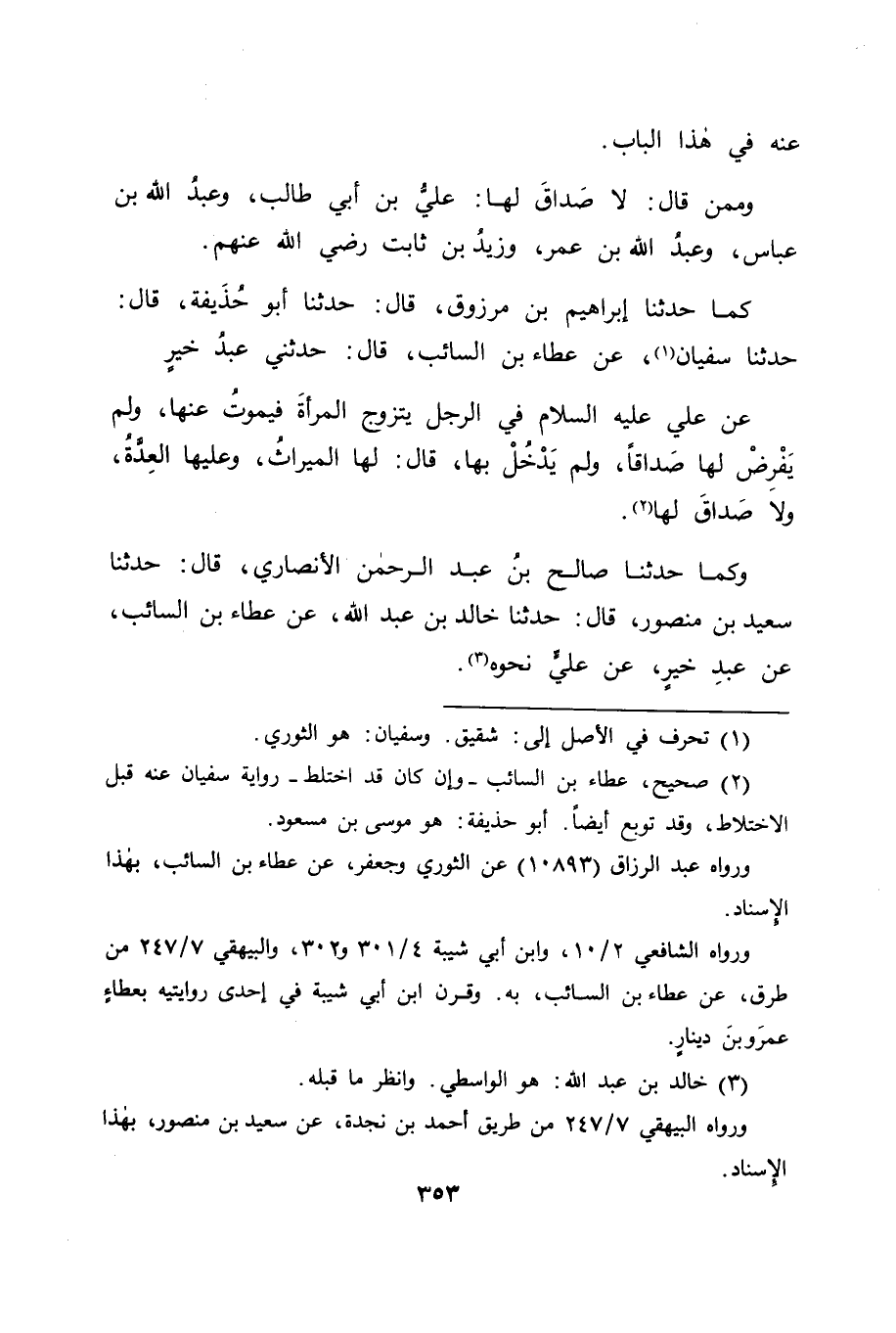 كَمَا حَدَّثَنَا إِبْرَاهِيمُ بْنُ مَرْزُوقٍ قَالَ: حَدَّثَنَا أَبُو حُذَيْفَةَ قَالَ: حَدَّثَنَا سُفْيَانُ، عَنْ عَطَاءِ بْنِ السَّائِبِ قَالَ: حَدَّثَنِي عَبْدُ خَيْرٍ، عَنْ عَلِيٍّ عَلَيْهِ السَّلَامُ، فِي الرَّجُلِ يَتَزَوَّجُ الْمَرْأَةَ فَيَمُوتُ عَنْهَا وَلَمْ يَفْرِضْ لَهَا صَدَاقًا وَلَمْ يَدْخُلْ بِهَا، قَالَ: " لَهَا الْمِيرَاثُ، وَعَلَيْهَا الْعِدَّةُ، وَلَا صَدَاقَ لَهَا " وَكَمَا حَدَّثَنَا صَالِحُ بْنُ عَبْدِ الرَّحْمَنِ الْأَنْصَارِيُّ قَالَ: حَدَّثَنَا سَعِيدُ بْنُ مَنْصُورٍ قَالَ: حَدَّثَنَا خَالِدُ بْنُ عَبْدِ اللهِ، عَنْ عَطَاءِ بْنِ السَّائِبِ، عَنْ عَبْدِ خَيْرٍ، عَنْ عَلِيٍّ نَحْوَهُ